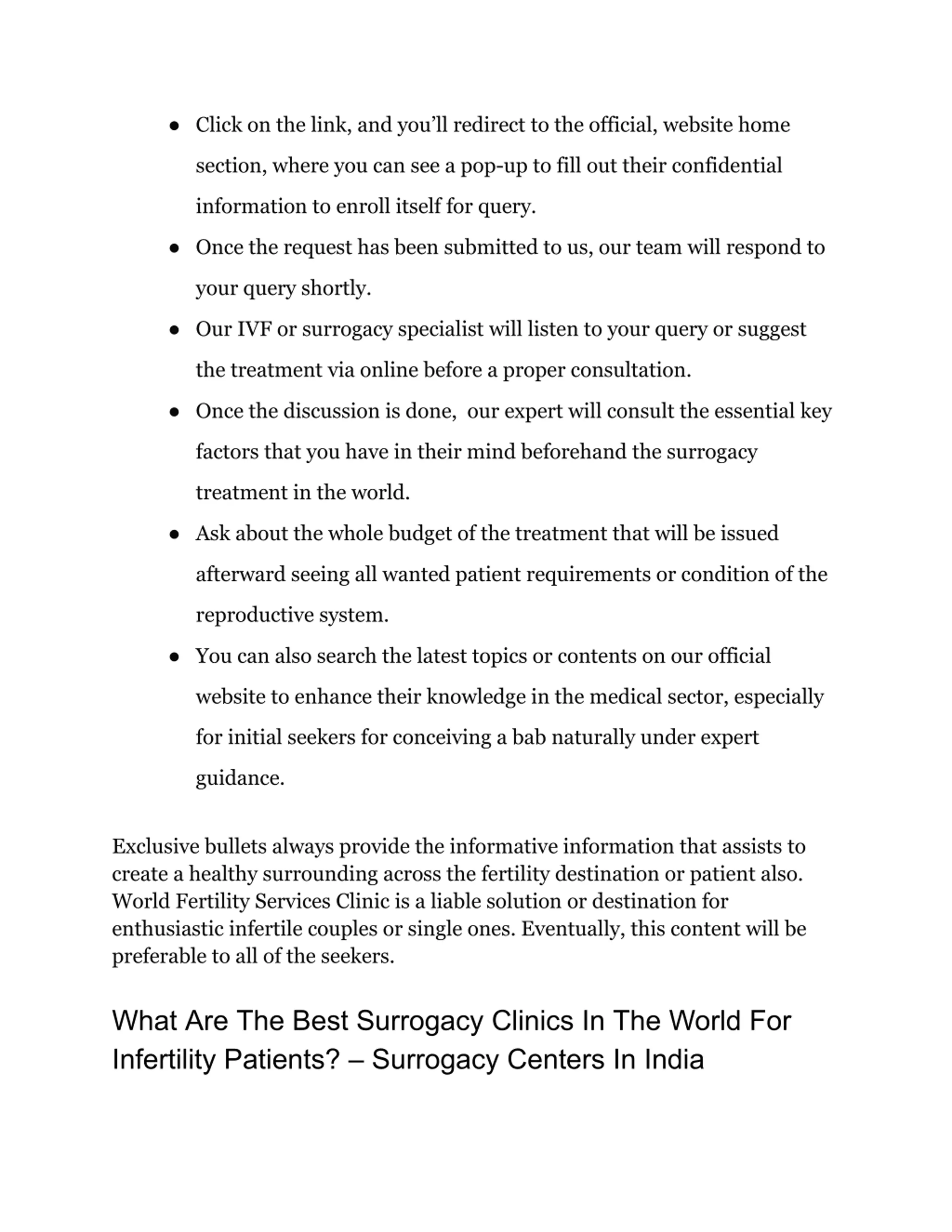 Click on the link, and youll redirect to the official, website home section, where you can see a pop-up to fill out their confidential information to enroll itself for query. Once the request has been submitted to us, our team will respond to your query shortly. Our IVF or surrogacy specialist will listen to your query or suggest the treatment via online before a proper consultation. Once the discussion is done, our expert will consult the essential key factors that you have in their mind beforehand the surrogacy treatment in the world. Ask about the whole budget of the treatment that will be issued afterward seeing all wanted patient requirements or condition of the reproductive system. You can also search the latest topics or contents on our official website to enhance their knowledge in the medical sector, especially for initial seekers for conceiving a bab naturally under expert guidance. Exclusive bullets always provide the informative information that assists to create a healthy surrounding across the fertility destination or patient also. World Fertility Services Clinic is a liable solution or destination for enthusiastic infertile couples or single ones. Eventually, this content will be preferable to all of the seekers. What Are The Best Surrogacy Clinics In The World For Infertility Patients? Surrogacy Centers In India