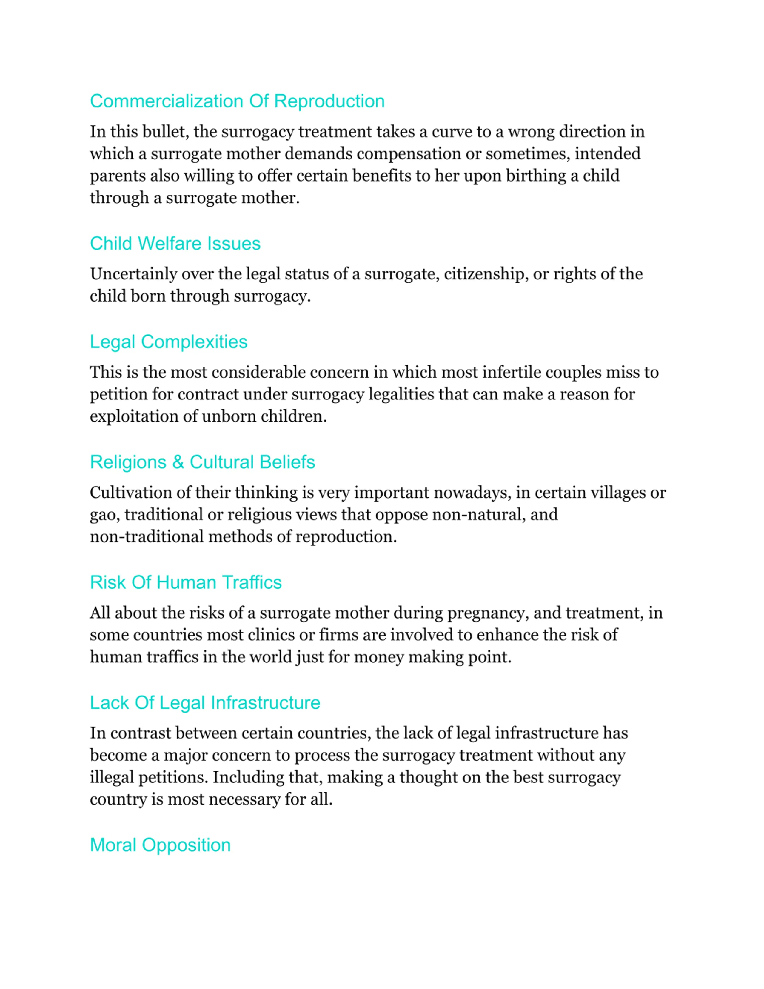 Commercialization Of Reproduction In this bullet, the surrogacy treatment takes a curve to a wrong direction in which a surrogate mother demands compensation or sometimes, intended parents also willing to offer certain benefits to her upon birthing a child through a surrogate mother. Child Welfare Issues Uncertainly over the legal status of a surrogate, citizenship, or rights of the child born through surrogacy. Legal Complexities This is the most considerable concern in which most infertile couples miss to petition for contract under surrogacy legalities that can make a reason for exploitation of unborn children. Religions & Cultural Beliefs Cultivation of their thinking is very important nowadays, in certain villages or gao, traditional or religious views that oppose non-natural, and non-traditional methods of reproduction. Risk Of Human Traffics All about the risks of a surrogate mother during pregnancy, and treatment, in some countries most clinics or firms are involved to enhance the risk of human traffics in the world just for money making point. Lack Of Legal Infrastructure In contrast between certain countries, the lack of legal infrastructure has become a major concern to process the surrogacy treatment without any illegal petitions. Including that, making a thought on the best surrogacy country is most necessary for all. Moral Opposition