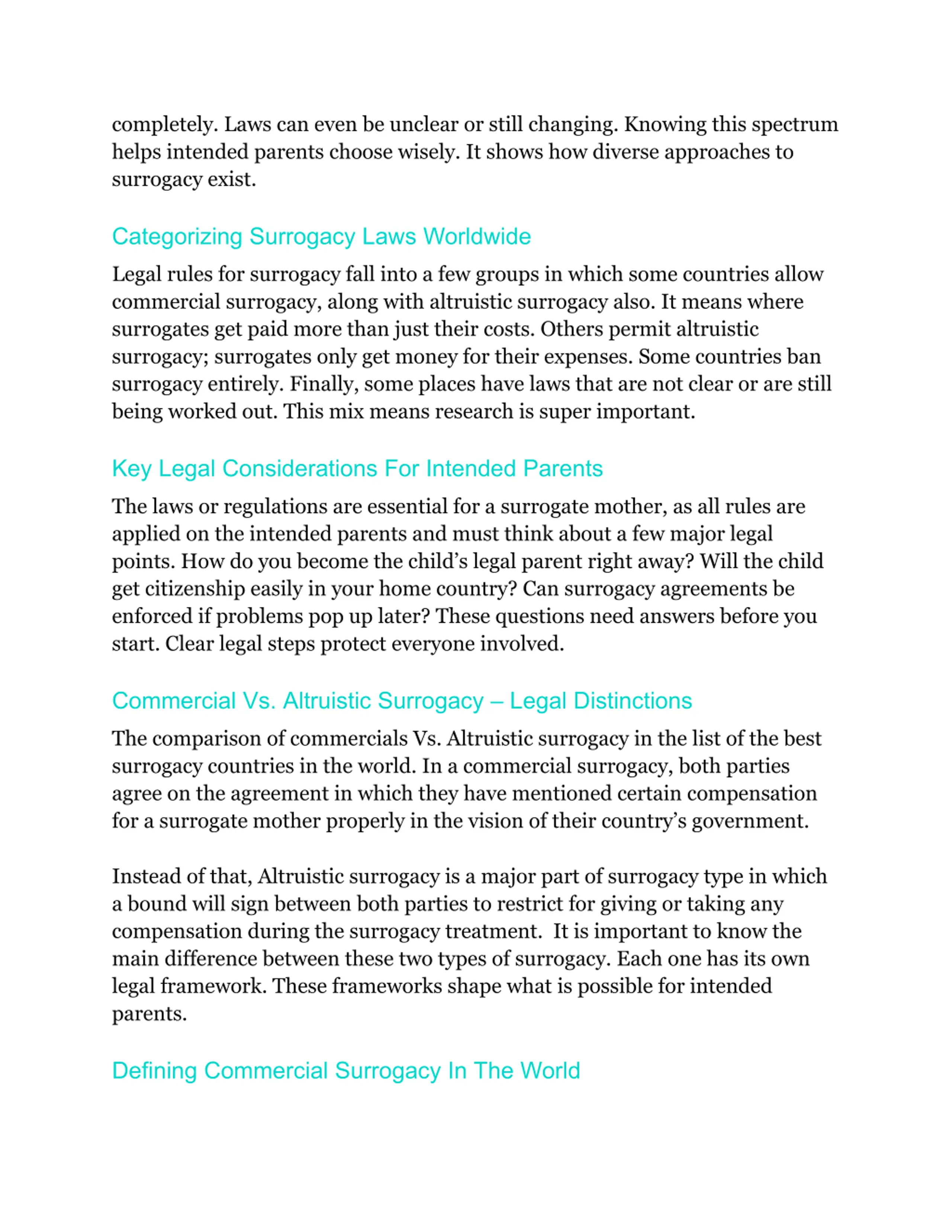 completely. Laws can even be unclear or still changing. Knowing this spectrum helps intended parents choose wisely. It shows how diverse approaches to surrogacy exist. Categorizing Surrogacy Laws Worldwide Legal rules for surrogacy fall into a few groups in which some countries allow commercial surrogacy, along with altruistic surrogacy also. It means where surrogates get paid more than just their costs. Others permit altruistic surrogacy; surrogates only get money for their expenses. Some countries ban surrogacy entirely. Finally, some places have laws that are not clear or are still being worked out. This mix means research is super important. Key Legal Considerations For Intended Parents The laws or regulations are essential for a surrogate mother, as all rules are applied on the intended parents and must think about a few major legal points. How do you become the child s legal parent right away? Will the child get citizenship easily in your home country? Can surrogacy agreements be enforced if problems pop up later? These questions need answers before you start. Clear legal steps protect everyone involved. Commercial Vs. Altruistic Surrogacy Legal Distinctions The comparison of commercials Vs. Altruistic surrogacy in the list of the best surrogacy countries in the world. In a commercial surrogacy, both parties agree on the agreement in which they have mentioned certain compensation for a surrogate mother properly in the vision of their country s government. Instead of that, Altruistic surrogacy is a major part of surrogacy type in which a bound will sign between both parties to restrict for giving or taking any compensation during the surrogacy treatment. It is important to know the main difference between these two types of surrogacy. Each one has its own legal framework. These frameworks shape what is possible for intended parents. Defining Commercial Surrogacy In The World