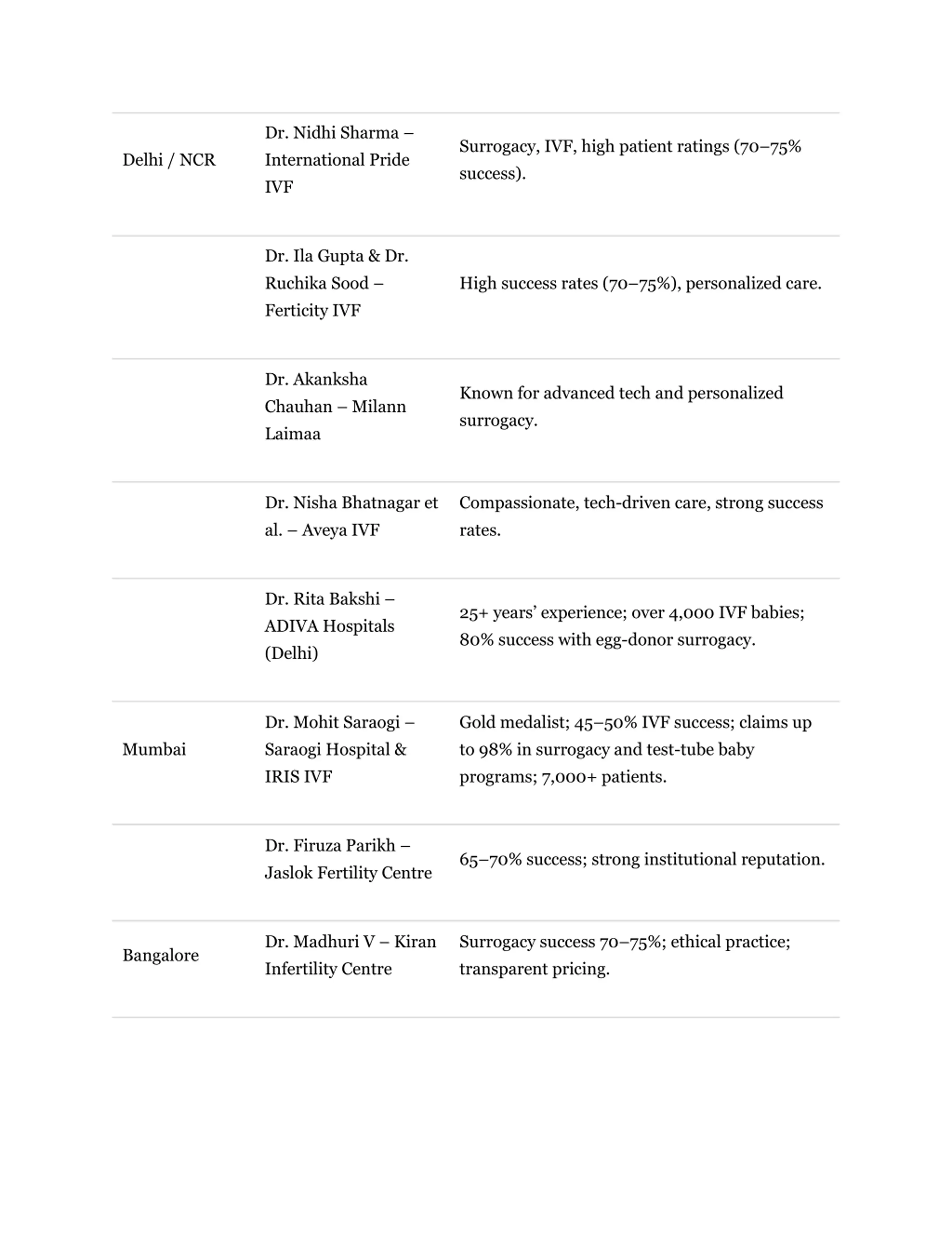 Dr. Nidhi Sharma International Pride IVF Surrogacy, IVF, high patient ratings (70 75% success). Delhi / NCR Dr. Ila Gupta & Dr. Ruchika Sood Ferticity IVF High success rates (70 75%), personalized care. Dr. Akanksha Chauhan Milann Laimaa Known for advanced tech and personalized surrogacy. Dr. Nisha Bhatnagar et al. Aveya IVF Compassionate, tech-driven care, strong success rates. Dr. Rita Bakshi ADIVA Hospitals (Delhi) 25+ years experience; over 4,000 IVF babies; 80% success with egg-donor surrogacy. Dr. Mohit Saraogi Saraogi Hospital & IRIS IVF Gold medalist; 45 50% IVF success; claims up to 98% in surrogacy and test-tube baby programs; 7,000+ patients. Mumbai Dr. Firuza Parikh Jaslok Fertility Centre 65 70% success; strong institutional reputation. Dr. Madhuri V Kiran Infertility Centre Surrogacy success 70 75%; ethical practice; transparent pricing. Bangalore