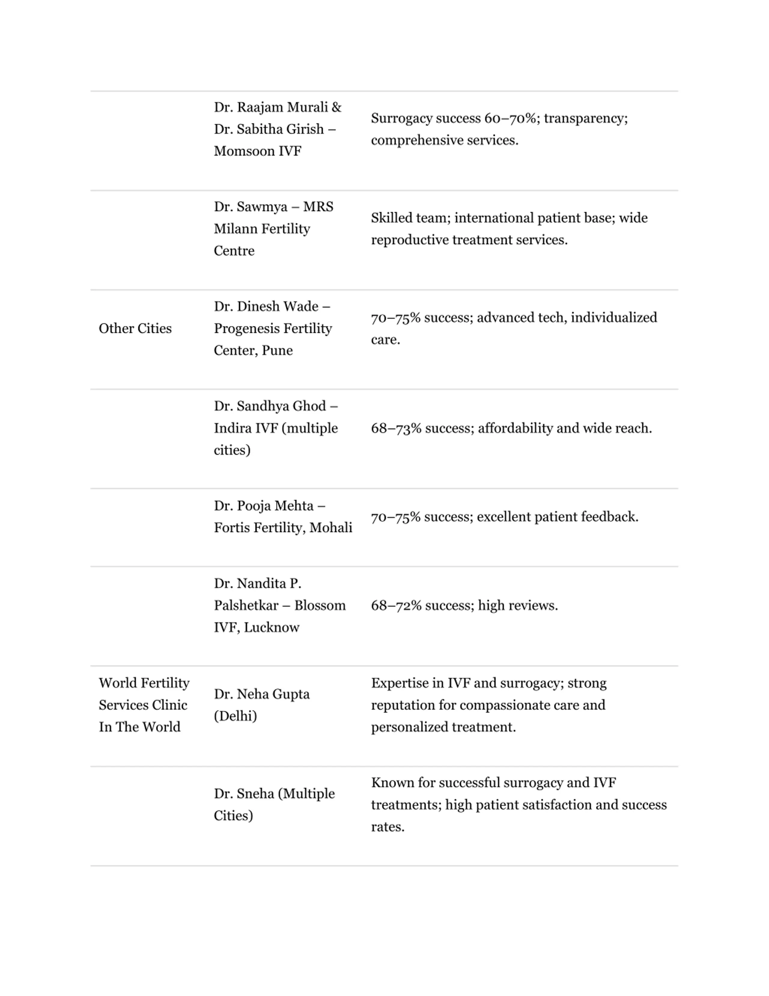 Dr. Raajam Murali & Dr. Sabitha Girish Momsoon IVF Surrogacy success 60 70%; transparency; comprehensive services. Dr. Sawmya MRS Milann Fertility Centre Skilled team; international patient base; wide reproductive treatment services. Dr. Dinesh Wade Progenesis Fertility Center, Pune 70 75% success; advanced tech, individualized care. Other Cities Dr. Sandhya Ghod Indira IVF (multiple cities) 68 73% success; affordability and wide reach. Dr. Pooja Mehta Fortis Fertility, Mohali 70 75% success; excellent patient feedback. Dr. Nandita P. Palshetkar Blossom IVF, Lucknow 68 72% success; high reviews. World Fertility Services Clinic In The World Expertise in IVF and surrogacy; strong reputation for compassionate care and personalized treatment. Dr. Neha Gupta (Delhi) Known for successful surrogacy and IVF treatments; high patient satisfaction and success rates. Dr. Sneha (Multiple Cities)