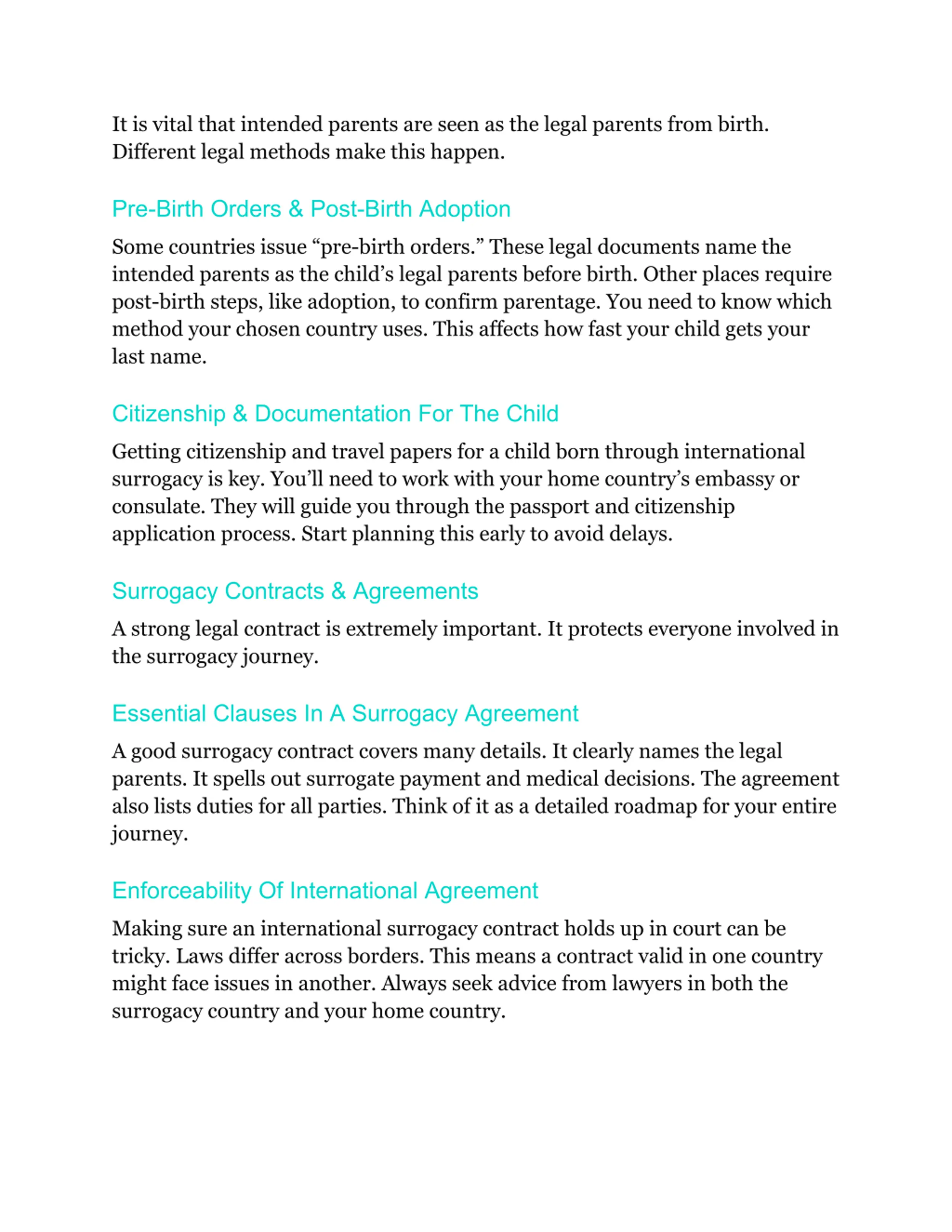 It is vital that intended parents are seen as the legal parents from birth. Different legal methods make this happen. Pre-Birth Orders & Post-Birth Adoption Some countries issue pre-birth orders. These legal documents name the intended parents as the child s legal parents before birth. Other places require post-birth steps, like adoption, to confirm parentage. You need to know which method your chosen country uses. This affects how fast your child gets your last name. Citizenship & Documentation For The Child Getting citizenship and travel papers for a child born through international surrogacy is key. You ll need to work with your home country s embassy or consulate. They will guide you through the passport and citizenship application process. Start planning this early to avoid delays. Surrogacy Contracts & Agreements A strong legal contract is extremely important. It protects everyone involved in the surrogacy journey. Essential Clauses In A Surrogacy Agreement A good surrogacy contract covers many details. It clearly names the legal parents. It spells out surrogate payment and medical decisions. The agreement also lists duties for all parties. Think of it as a detailed roadmap for your entire journey. Enforceability Of International Agreement Making sure an international surrogacy contract holds up in court can be tricky. Laws differ across borders. This means a contract valid in one country might face issues in another. Always seek advice from lawyers in both the surrogacy country and your home country.