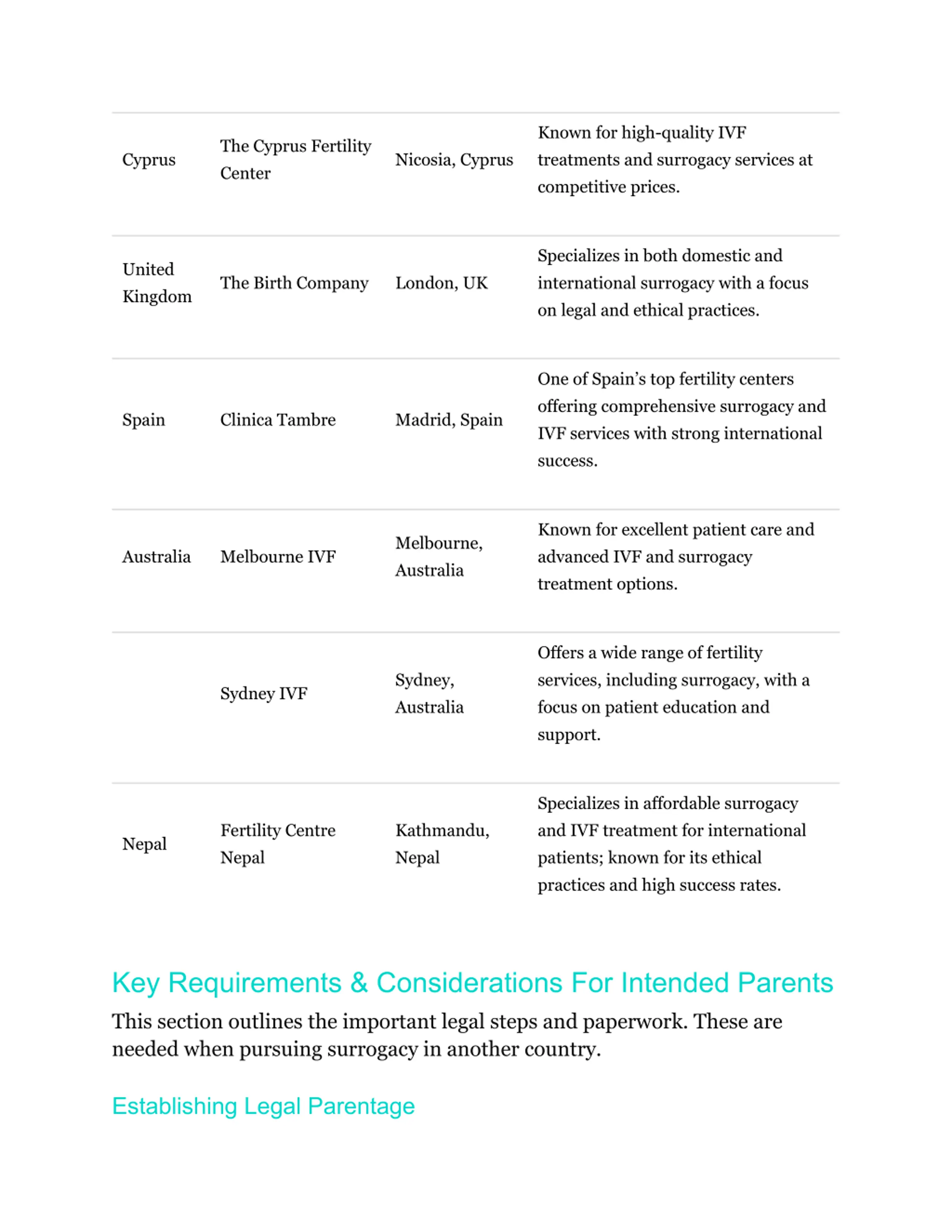 Known for high-quality IVF treatments and surrogacy services at competitive prices. The Cyprus Fertility Center Cyprus Nicosia, Cyprus Specializes in both domestic and international surrogacy with a focus on legal and ethical practices. United Kingdom The Birth Company London, UK One of Spain s top fertility centers offering comprehensive surrogacy and IVF services with strong international success. Spain Clinica Tambre Madrid, Spain Known for excellent patient care and advanced IVF and surrogacy treatment options. Melbourne, Australia Australia Melbourne IVF Offers a wide range of fertility services, including surrogacy, with a focus on patient education and support. Sydney, Australia Sydney IVF Specializes in affordable surrogacy and IVF treatment for international patients; known for its ethical practices and high success rates. Fertility Centre Nepal Kathmandu, Nepal Nepal Key Requirements & Considerations For Intended Parents This section outlines the important legal steps and paperwork. These are needed when pursuing surrogacy in another country. Establishing Legal Parentage