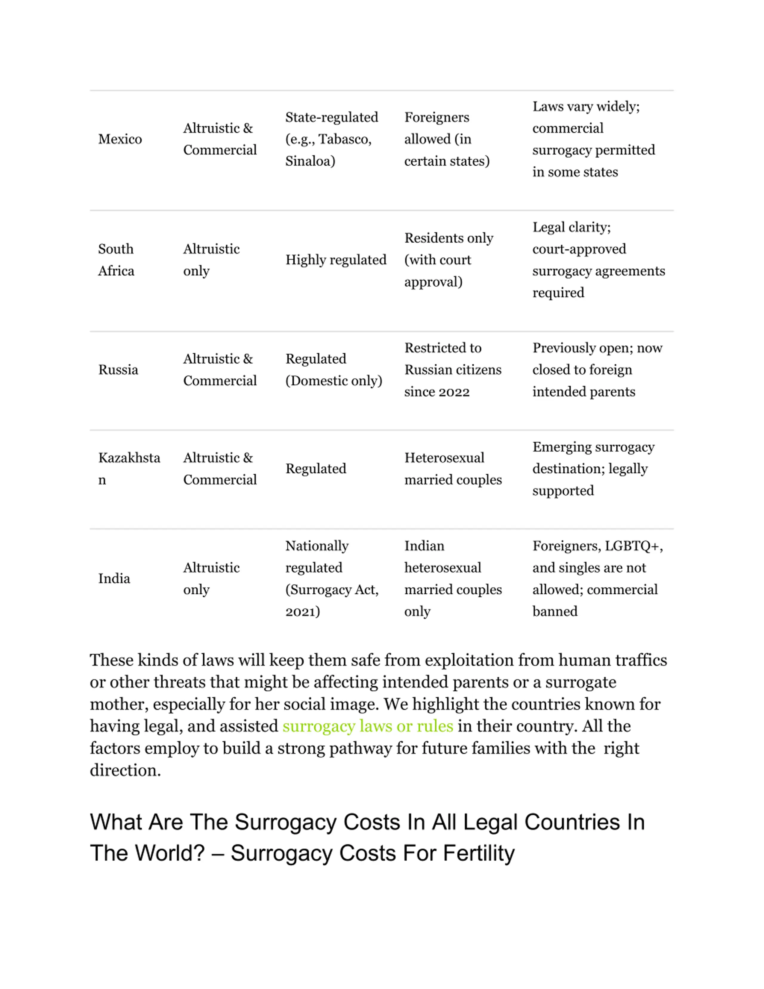 Laws vary widely; commercial surrogacy permitted in some states State-regulated (e.g., Tabasco, Sinaloa) Foreigners allowed (in certain states) Altruistic & Commercial Mexico Legal clarity; court-approved surrogacy agreements required Residents only (with court approval) South Africa Altruistic only Highly regulated Restricted to Russian citizens since 2022 Previously open; now closed to foreign intended parents Altruistic & Commercial Regulated (Domestic only) Russia Emerging surrogacy destination; legally supported Kazakhsta n Altruistic & Commercial Heterosexual married couples Regulated Nationally regulated (Surrogacy Act, 2021) Indian heterosexual married couples only Foreigners, LGBTQ+, and singles are not allowed; commercial banned Altruistic only India These kinds of laws will keep them safe from exploitation from human traffics or other threats that might be affecting intended parents or a surrogate mother, especially for her social image. We highlight the countries known for having legal, and assisted surrogacy laws or rules in their country. All the factors employ to build a strong pathway for future families with the right direction. What Are The Surrogacy Costs In All Legal Countries In The World? Surrogacy Costs For Fertility