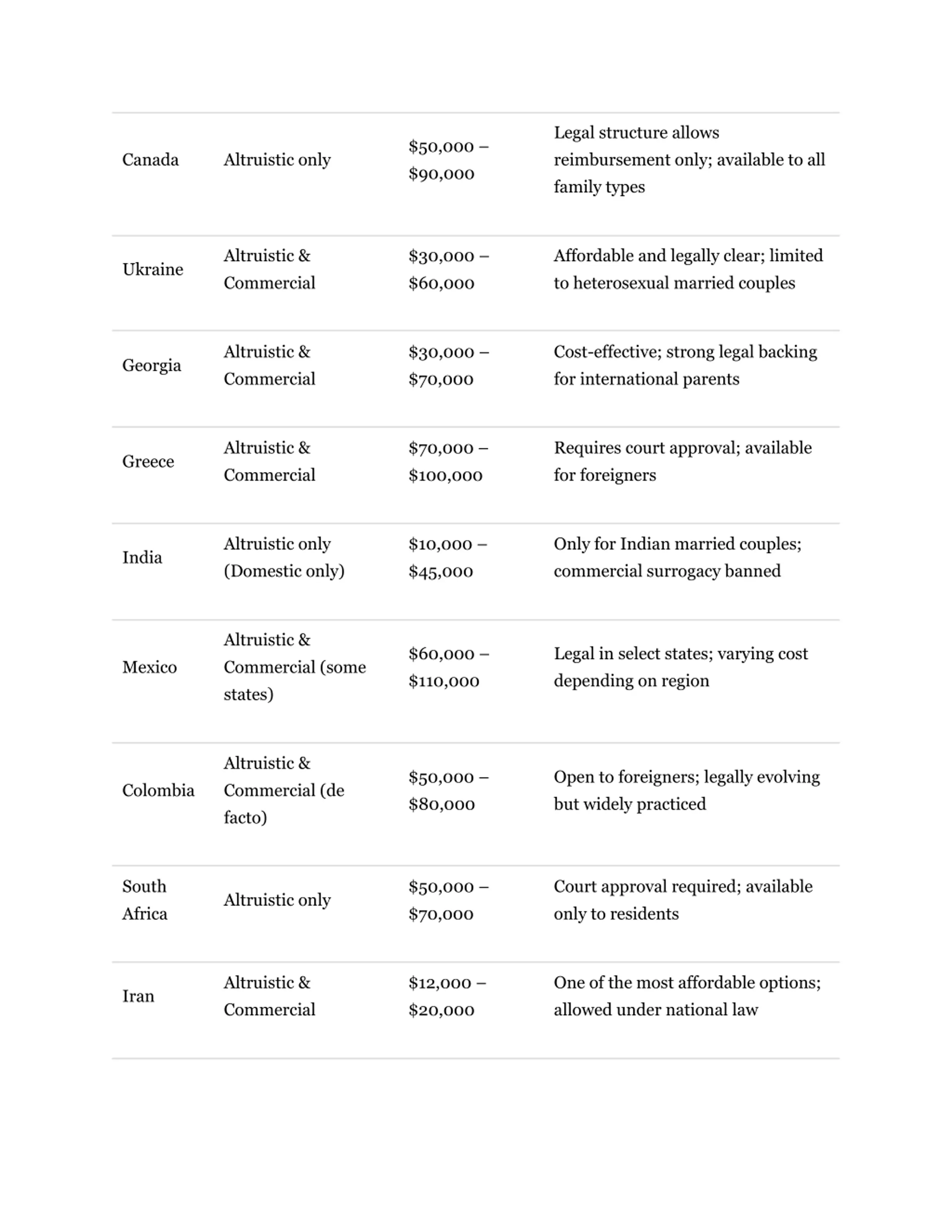 Legal structure allows reimbursement only; available to all family types $50,000 $90,000 Canada Altruistic only Altruistic & Commercial $30,000 $60,000 Affordable and legally clear; limited to heterosexual married couples Ukraine Altruistic & Commercial $30,000 $70,000 Cost-effective; strong legal backing for international parents Georgia Altruistic & Commercial $70,000 $100,000 Requires court approval; available for foreigners Greece Altruistic only (Domestic only) $10,000 $45,000 Only for Indian married couples; commercial surrogacy banned India Altruistic & Commercial (some states) $60,000 $110,000 Legal in select states; varying cost depending on region Mexico Altruistic & Commercial (de facto) $50,000 $80,000 Open to foreigners; legally evolving but widely practiced Colombia South Africa $50,000 $70,000 Court approval required; available only to residents Altruistic only Altruistic & Commercial $12,000 $20,000 One of the most affordable options; allowed under national law Iran