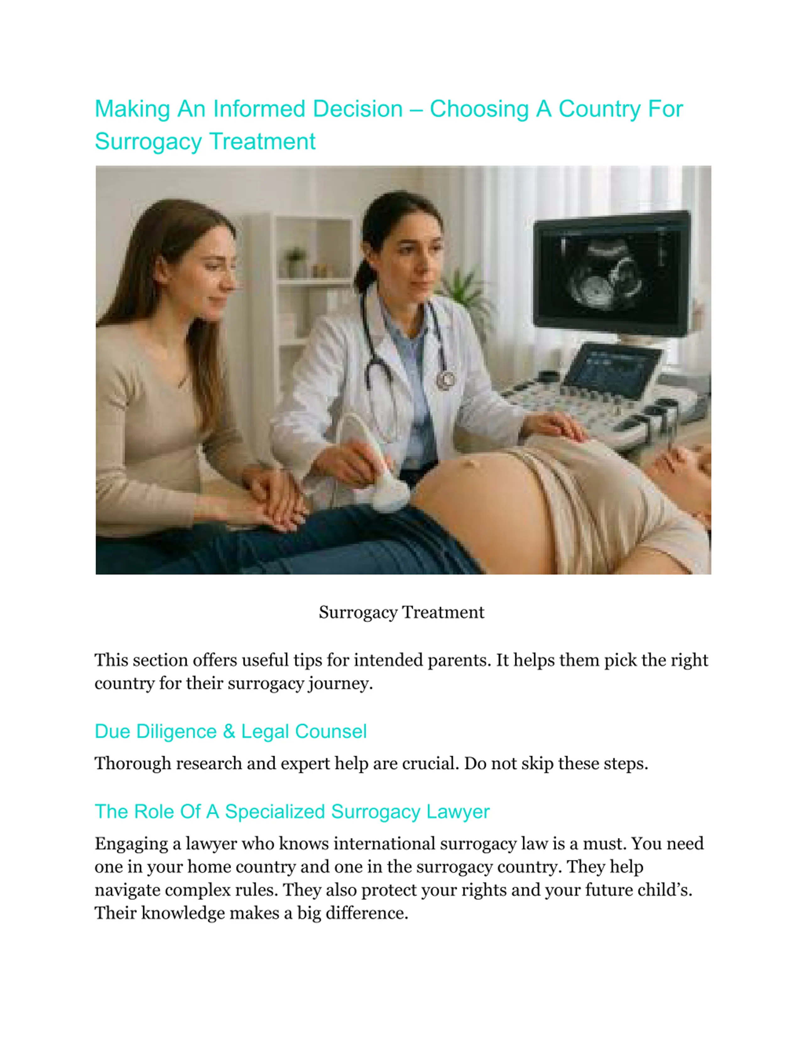 Making An Informed Decision Choosing A Country For Surrogacy Treatment Surrogacy Treatment This section offers useful tips for intended parents. It helps them pick the right country for their surrogacy journey. Due Diligence & Legal Counsel Thorough research and expert help are crucial. Do not skip these steps. The Role Of A Specialized Surrogacy Lawyer Engaging a lawyer who knows international surrogacy law is a must. You need one in your home country and one in the surrogacy country. They help navigate complex rules. They also protect your rights and your future child s. Their knowledge makes a big difference.