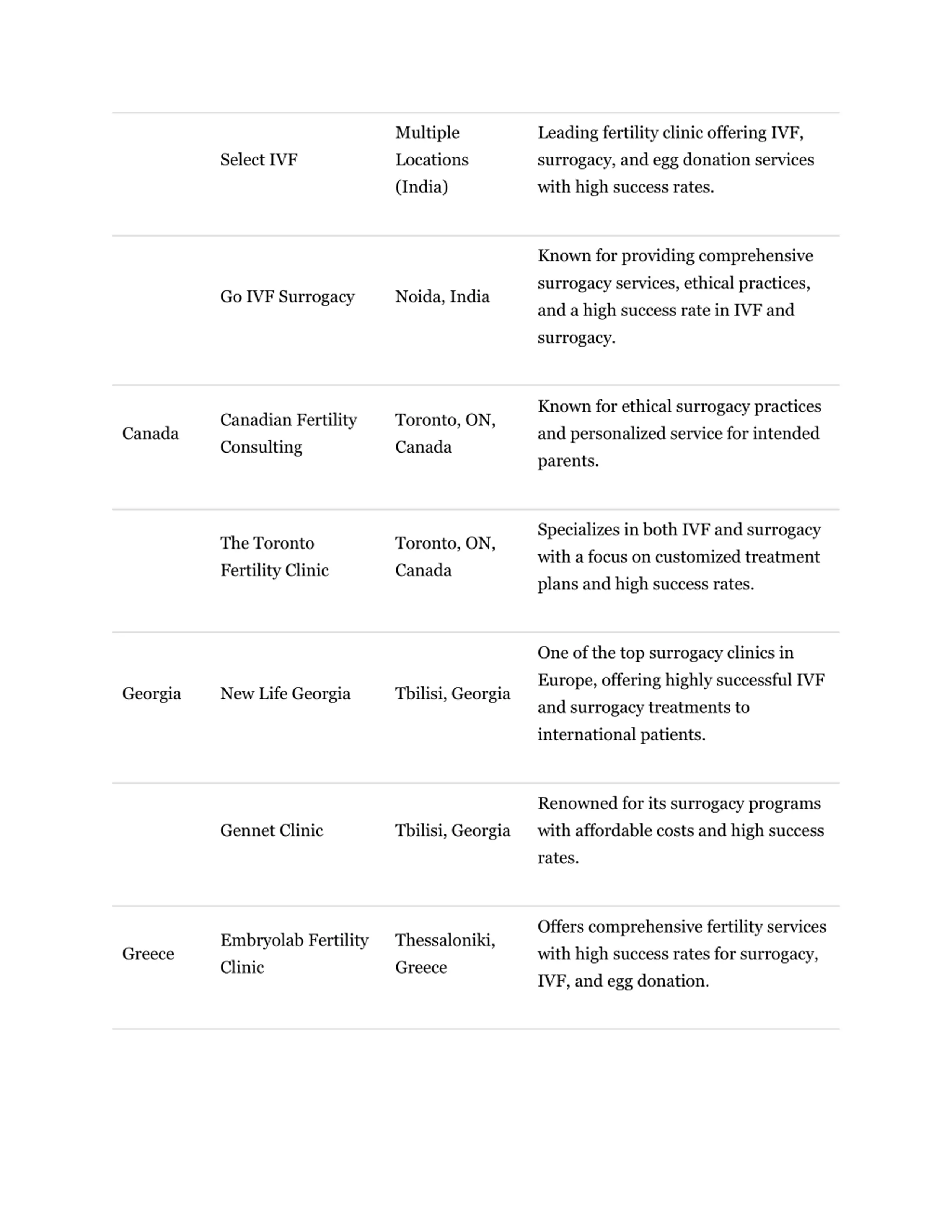 Multiple Locations (India) Leading fertility clinic offering IVF, surrogacy, and egg donation services with high success rates. Select IVF Known for providing comprehensive surrogacy services, ethical practices, and a high success rate in IVF and surrogacy. Go IVF Surrogacy Noida, India Known for ethical surrogacy practices and personalized service for intended parents. Canadian Fertility Consulting Toronto, ON, Canada Canada Specializes in both IVF and surrogacy with a focus on customized treatment plans and high success rates. The Toronto Fertility Clinic Toronto, ON, Canada One of the top surrogacy clinics in Europe, offering highly successful IVF and surrogacy treatments to international patients. Georgia New Life Georgia Tbilisi, Georgia Renowned for its surrogacy programs with affordable costs and high success rates. Gennet Clinic Tbilisi, Georgia Offers comprehensive fertility services with high success rates for surrogacy, IVF, and egg donation. Embryolab Fertility Clinic Thessaloniki, Greece Greece