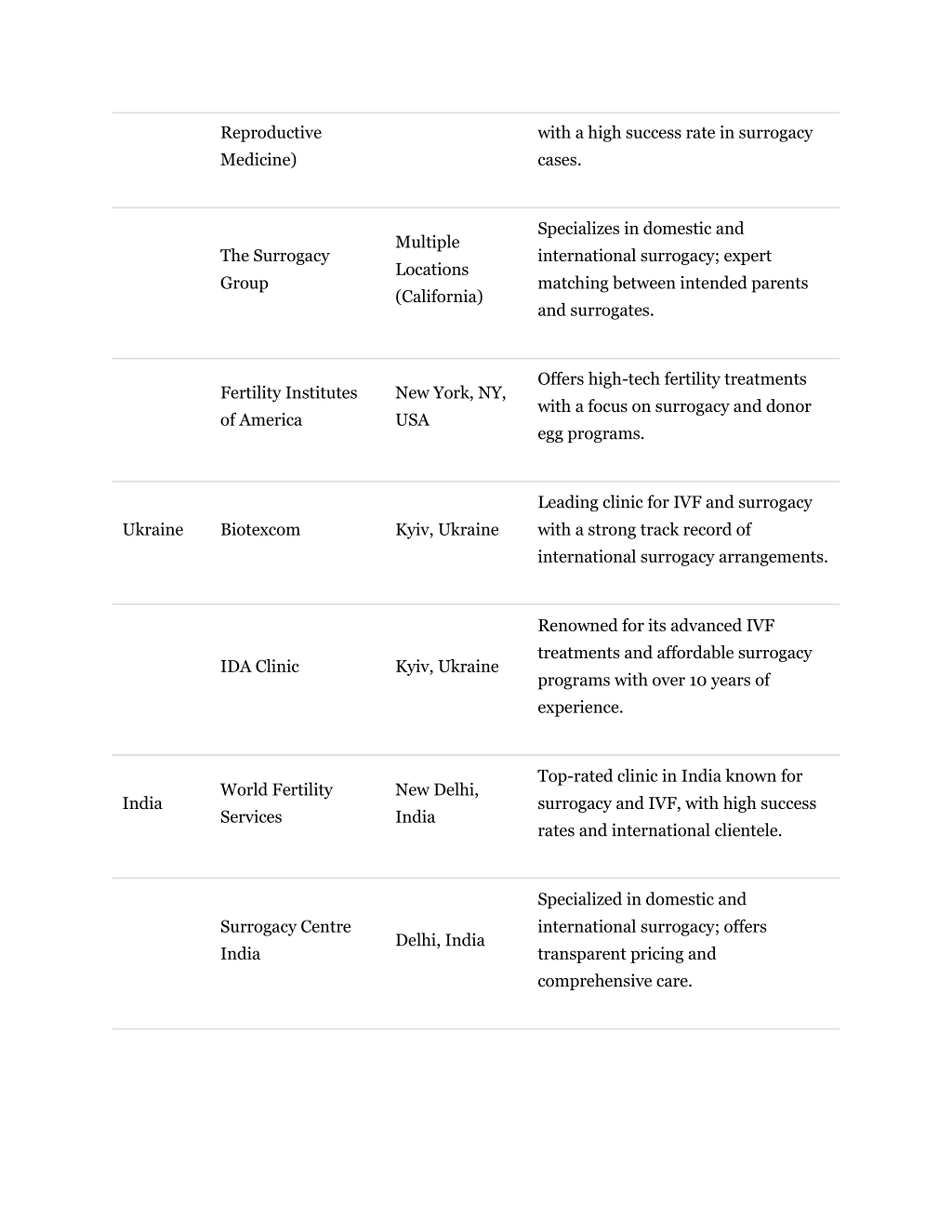 Reproductive Medicine) with a high success rate in surrogacy cases. Specializes in domestic and international surrogacy; expert matching between intended parents and surrogates. Multiple Locations (California) The Surrogacy Group Offers high-tech fertility treatments with a focus on surrogacy and donor egg programs. Fertility Institutes of America New York, NY, USA Leading clinic for IVF and surrogacy with a strong track record of international surrogacy arrangements. Ukraine Biotexcom Kyiv, Ukraine Renowned for its advanced IVF treatments and affordable surrogacy programs with over 10 years of experience. IDA Clinic Kyiv, Ukraine Top-rated clinic in India known for surrogacy and IVF, with high success rates and international clientele. World Fertility Services New Delhi, India India Specialized in domestic and international surrogacy; offers transparent pricing and comprehensive care. Surrogacy Centre India Delhi, India