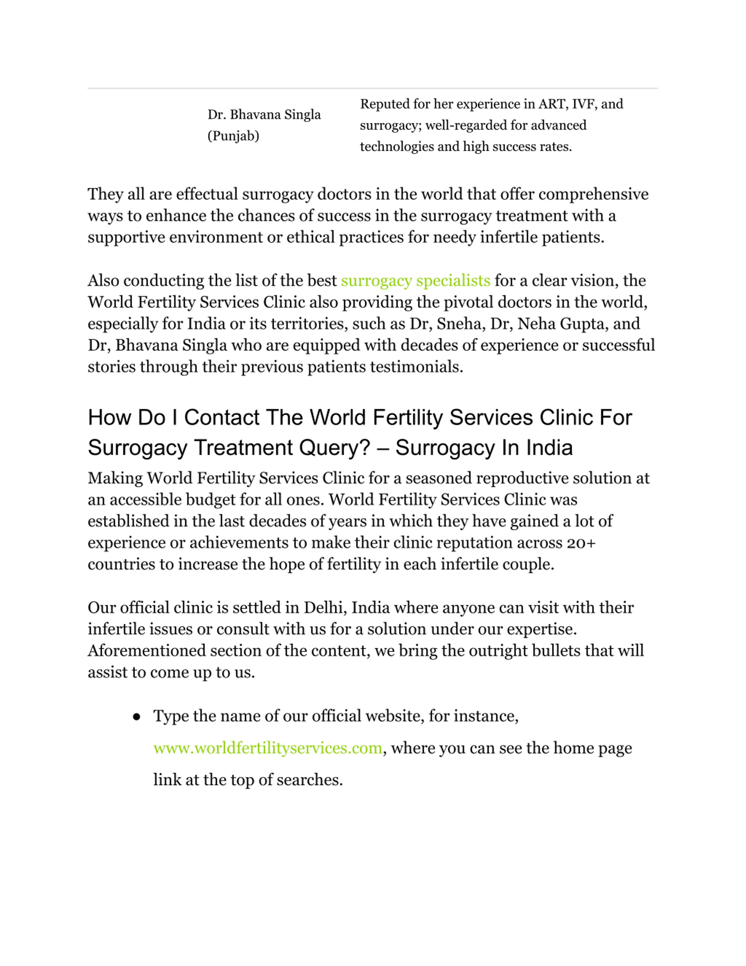 Reputed for her experience in ART, IVF, and surrogacy; well-regarded for advanced technologies and high success rates. Dr. Bhavana Singla (Punjab) They all are effectual surrogacy doctors in the world that offer comprehensive ways to enhance the chances of success in the surrogacy treatment with a supportive environment or ethical practices for needy infertile patients. Also conducting the list of the best surrogacy specialists for a clear vision, the World Fertility Services Clinic also providing the pivotal doctors in the world, especially for India or its territories, such as Dr, Sneha, Dr, Neha Gupta, and Dr, Bhavana Singla who are equipped with decades of experience or successful stories through their previous patients testimonials. How Do I Contact The World Fertility Services Clinic For Surrogacy Treatment Query? Surrogacy In India Making World Fertility Services Clinic for a seasoned reproductive solution at an accessible budget for all ones. World Fertility Services Clinic was established in the last decades of years in which they have gained a lot of experience or achievements to make their clinic reputation across 20+ countries to increase the hope of fertility in each infertile couple. Our official clinic is settled in Delhi, India where anyone can visit with their infertile issues or consult with us for a solution under our expertise. Aforementioned section of the content, we bring the outright bullets that will assist to come up to us. Type the name of our official website, for instance, www.worldfertilityservices.com, where you can see the home page link at the top of searches.