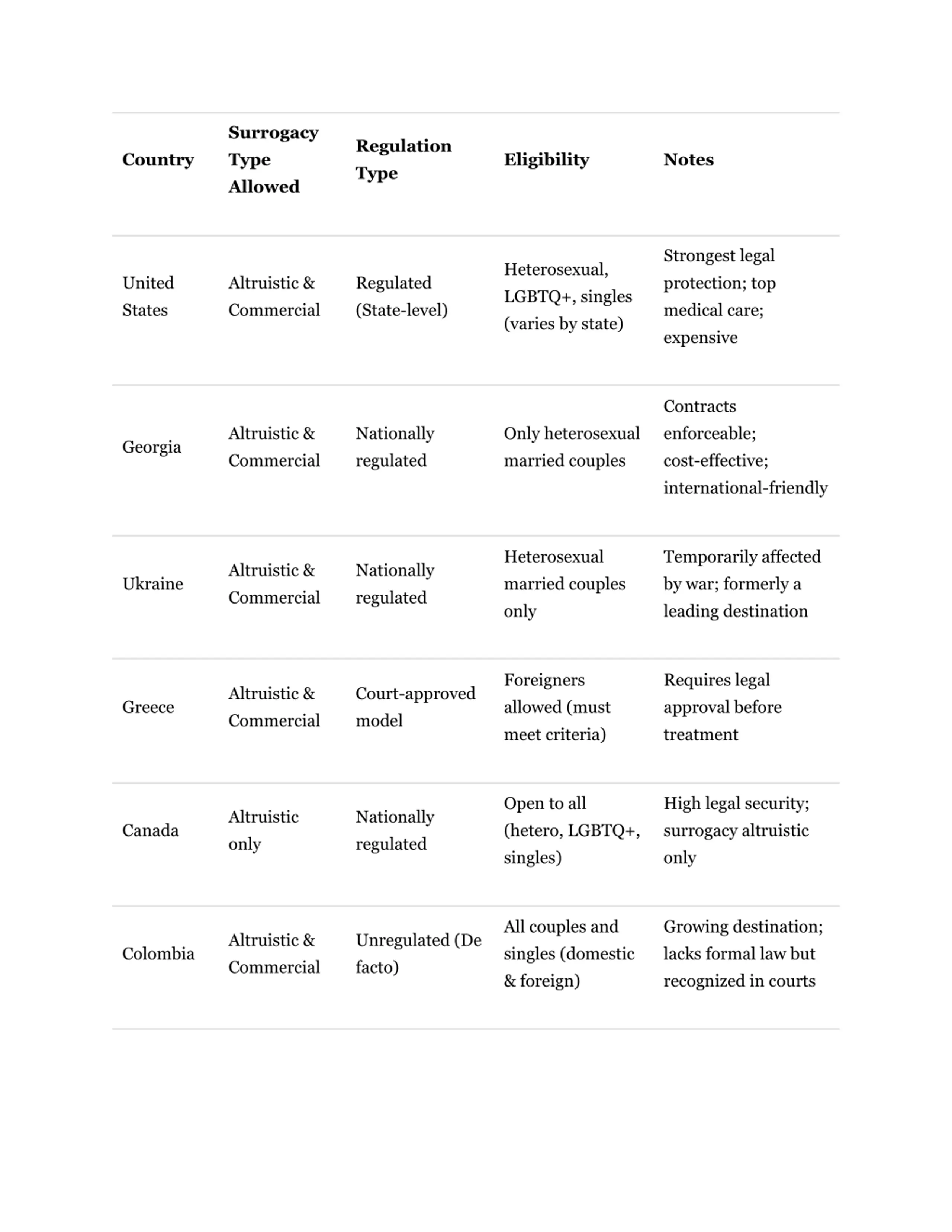 Surrogacy Type Allowed Regulation Type Country Eligibility Notes Strongest legal protection; top medical care; expensive Heterosexual, LGBTQ+, singles (varies by state) United States Altruistic & Commercial Regulated (State-level) Contracts enforceable; cost-effective; international-friendly Altruistic & Commercial Nationally regulated Only heterosexual married couples Georgia Heterosexual married couples only Temporarily affected by war; formerly a leading destination Altruistic & Commercial Nationally regulated Ukraine Foreigners allowed (must meet criteria) Requires legal approval before treatment Altruistic & Commercial Court-approved model Greece Open to all (hetero, LGBTQ+, singles) High legal security; surrogacy altruistic only Altruistic only Nationally regulated Canada All couples and singles (domestic & foreign) Growing destination; lacks formal law but recognized in courts Altruistic & Commercial Unregulated (De facto) Colombia