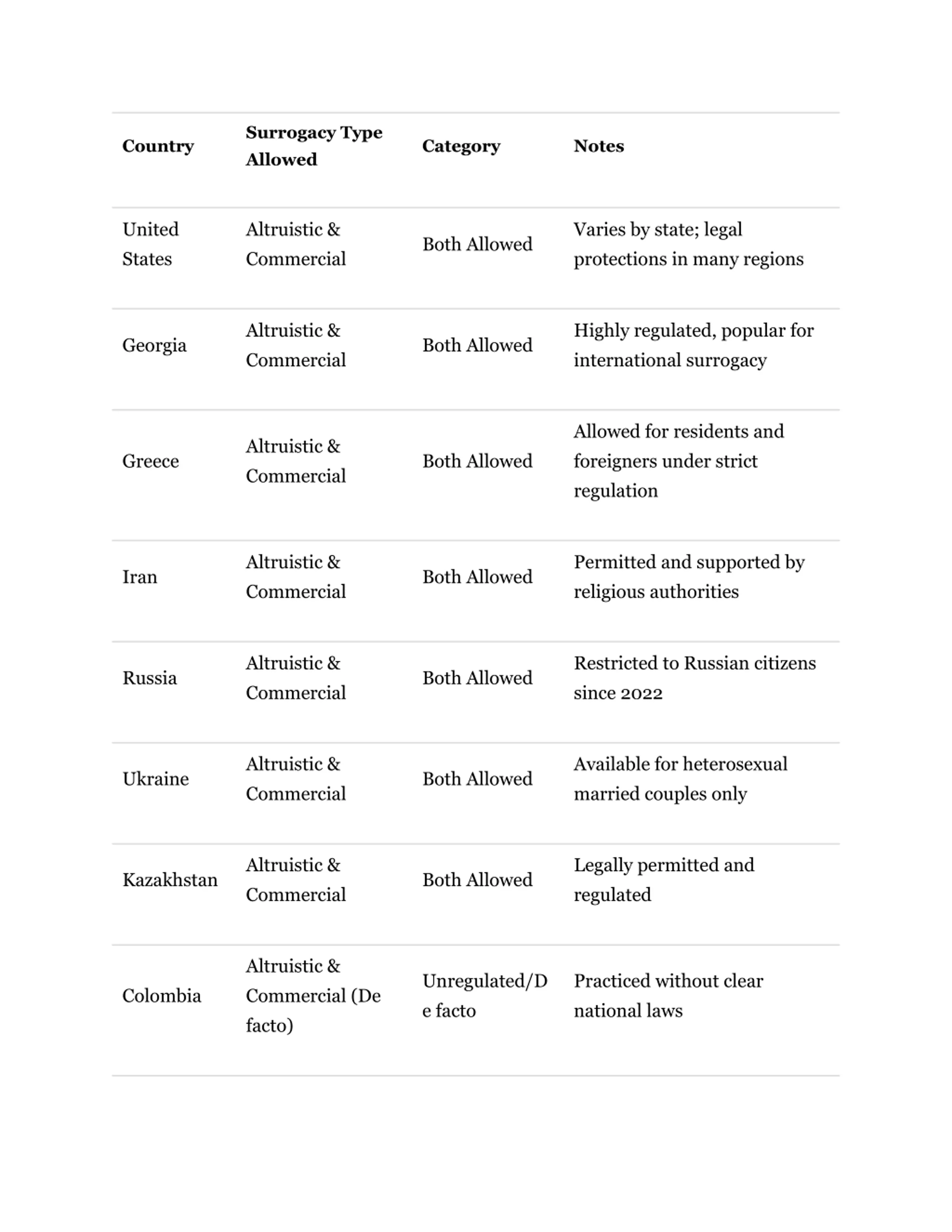 Surrogacy Type Allowed Country Category Notes United States Altruistic & Commercial Varies by state; legal protections in many regions Both Allowed Altruistic & Commercial Highly regulated, popular for international surrogacy Georgia Both Allowed Allowed for residents and foreigners under strict regulation Altruistic & Commercial Greece Both Allowed Altruistic & Commercial Permitted and supported by religious authorities Iran Both Allowed Altruistic & Commercial Restricted to Russian citizens since 2022 Russia Both Allowed Altruistic & Commercial Available for heterosexual married couples only Ukraine Both Allowed Altruistic & Commercial Legally permitted and regulated Kazakhstan Both Allowed Altruistic & Commercial (De facto) Unregulated/D e facto Practiced without clear national laws Colombia