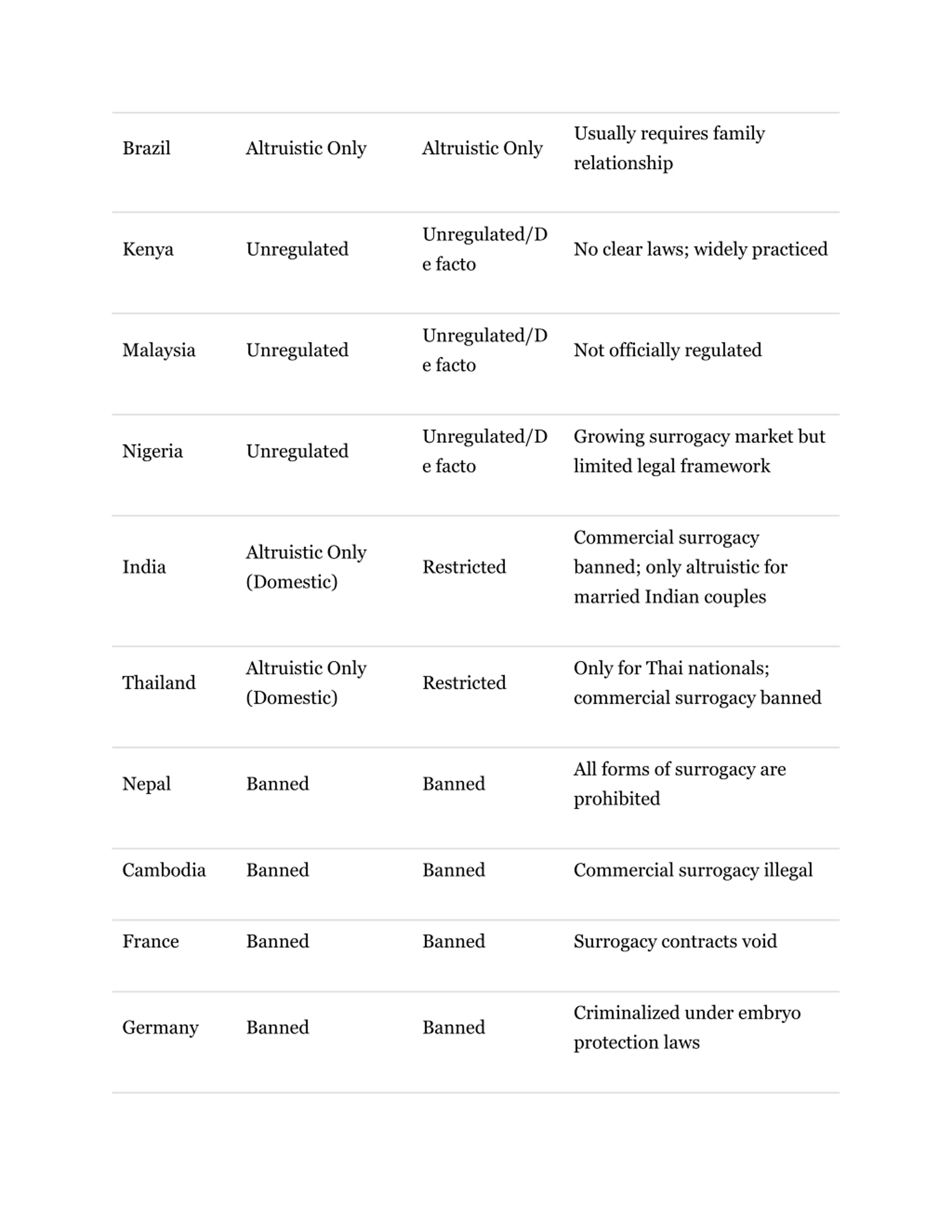 Usually requires family relationship Brazil Altruistic Only Altruistic Only Unregulated/D e facto Kenya Unregulated No clear laws; widely practiced Unregulated/D e facto Malaysia Unregulated Not officially regulated Unregulated/D e facto Growing surrogacy market but limited legal framework Nigeria Unregulated Commercial surrogacy banned; only altruistic for married Indian couples Altruistic Only (Domestic) India Restricted Altruistic Only (Domestic) Only for Thai nationals; commercial surrogacy banned Thailand Restricted All forms of surrogacy are prohibited Nepal Banned Banned Cambodia Banned Banned Commercial surrogacy illegal France Banned Banned Surrogacy contracts void Criminalized under embryo protection laws Germany Banned Banned