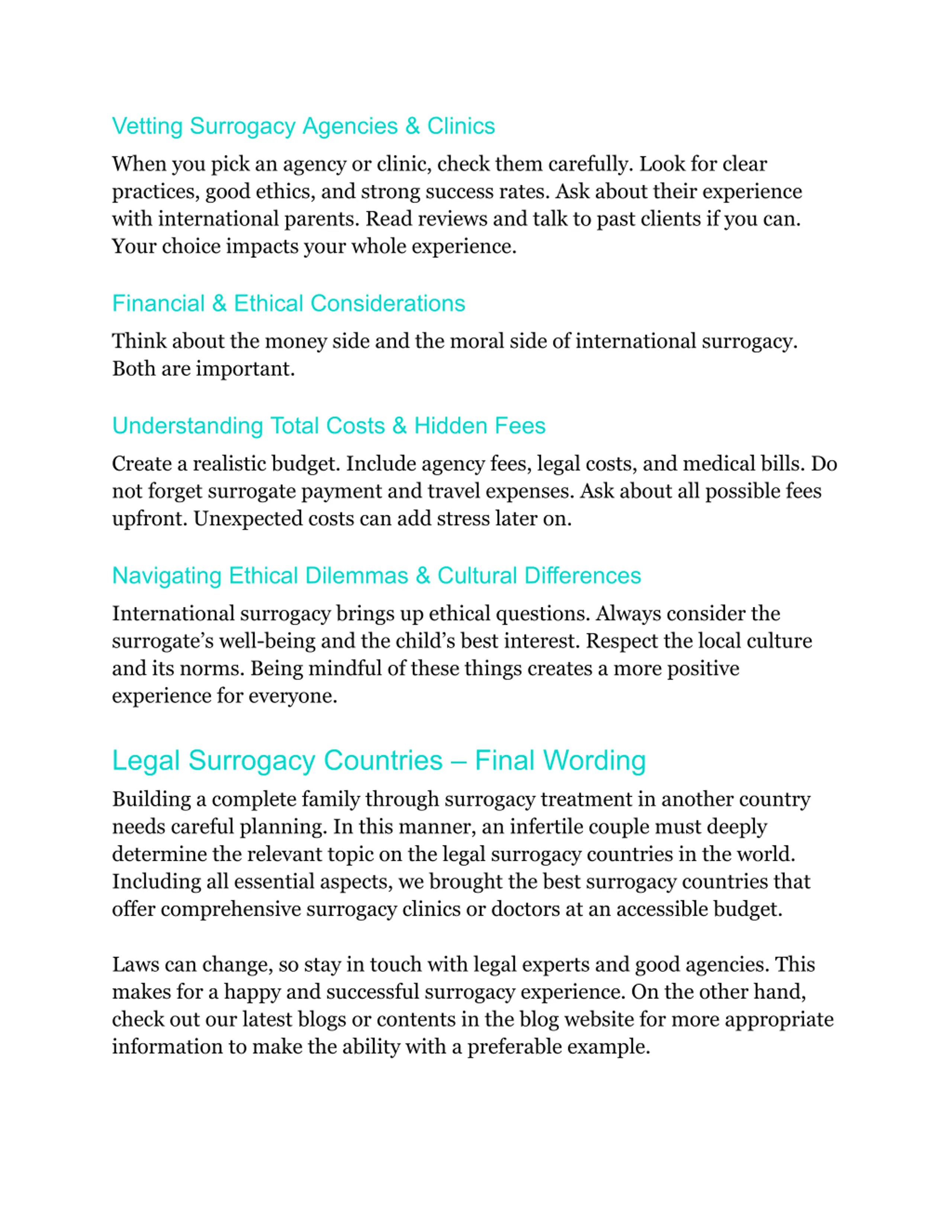 Vetting Surrogacy Agencies & Clinics When you pick an agency or clinic, check them carefully. Look for clear practices, good ethics, and strong success rates. Ask about their experience with international parents. Read reviews and talk to past clients if you can. Your choice impacts your whole experience. Financial & Ethical Considerations Think about the money side and the moral side of international surrogacy. Both are important. Understanding Total Costs & Hidden Fees Create a realistic budget. Include agency fees, legal costs, and medical bills. Do not forget surrogate payment and travel expenses. Ask about all possible fees upfront. Unexpected costs can add stress later on. Navigating Ethical Dilemmas & Cultural Differences International surrogacy brings up ethical questions. Always consider the surrogate s well-being and the child s best interest. Respect the local culture and its norms. Being mindful of these things creates a more positive experience for everyone. Legal Surrogacy Countries Final Wording Building a complete family through surrogacy treatment in another country needs careful planning. In this manner, an infertile couple must deeply determine the relevant topic on the legal surrogacy countries in the world. Including all essential aspects, we brought the best surrogacy countries that offer comprehensive surrogacy clinics or doctors at an accessible budget. Laws can change, so stay in touch with legal experts and good agencies. This makes for a happy and successful surrogacy experience. On the other hand, check out our latest blogs or contents in the blog website for more appropriate information to make the ability with a preferable example.