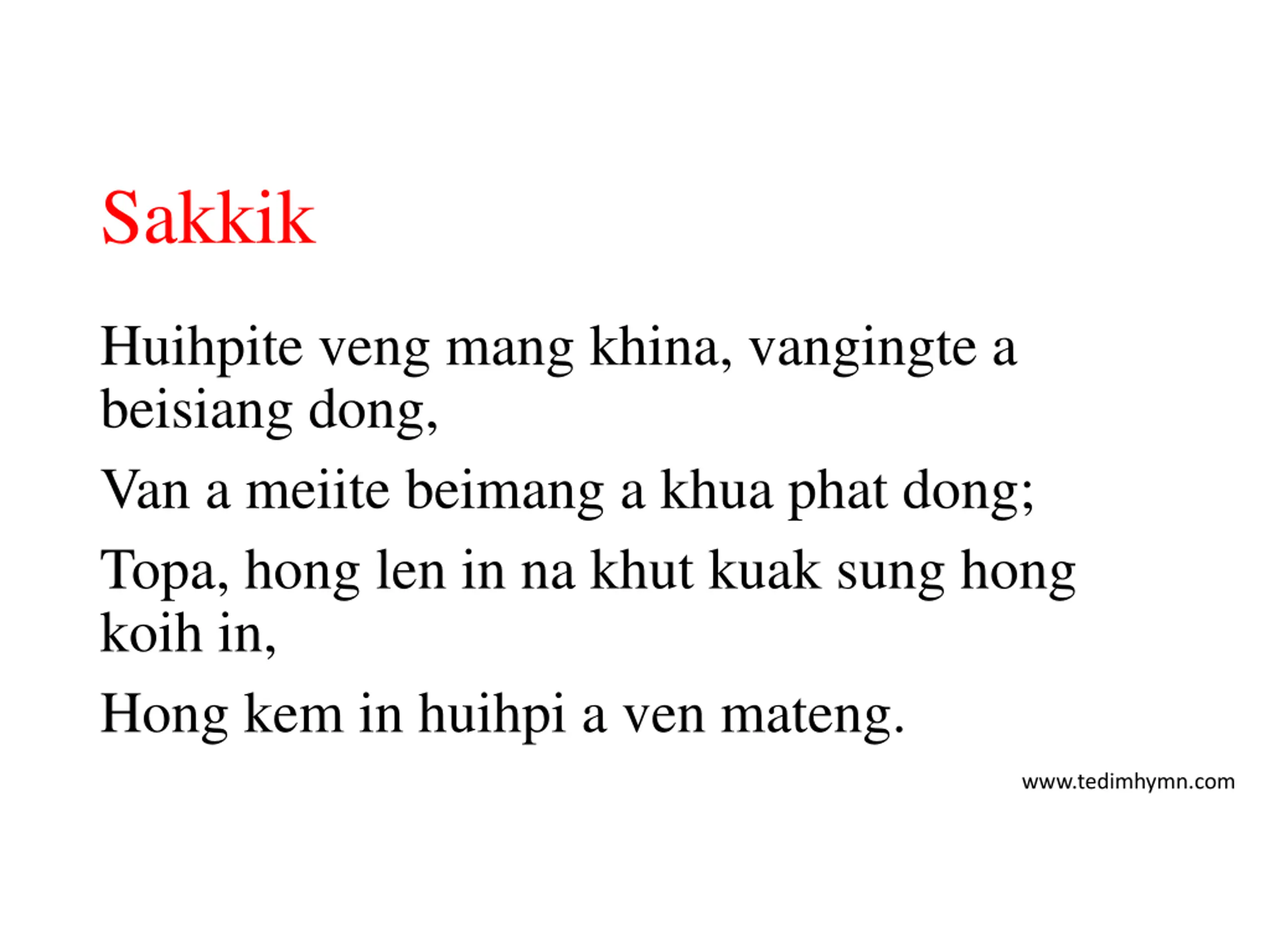 Sakkik Huihpite veng mang khina, vangingte a beisiang dong, Van a meiite beimang a khua phat dong; Topa, hong len in na khut kuak sung hong koih in, Hong kem in huihpi a ven mateng. www.tedimhymn.com