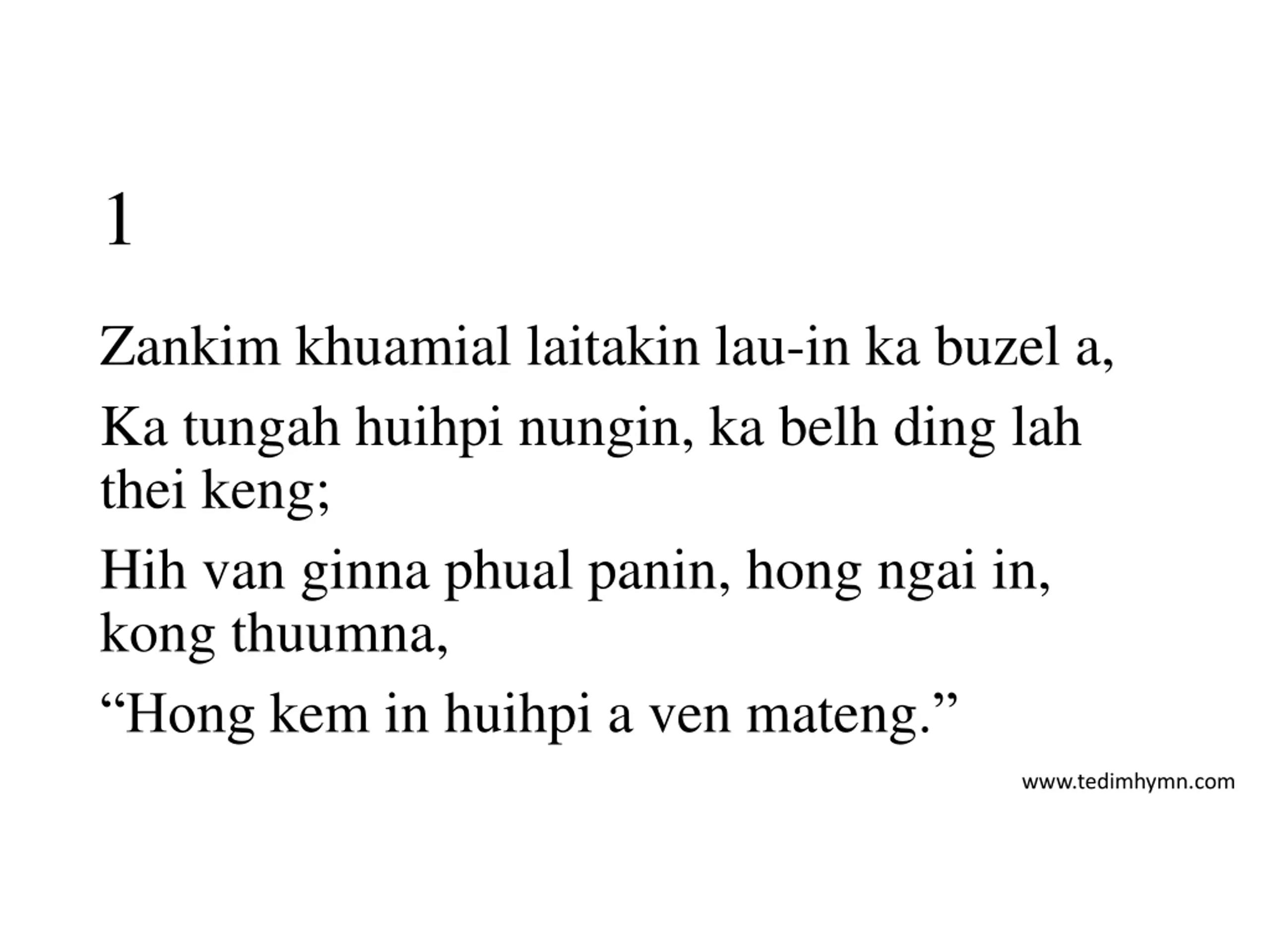 1 Zankim khuamial laitakin lau-in ka buzel a, Ka tungah huihpi nungin, ka belh ding lah thei keng; Hih van ginna phual panin, hong ngai in, kong thuumna, Hong kem in huihpi a ven mateng. www.tedimhymn.com