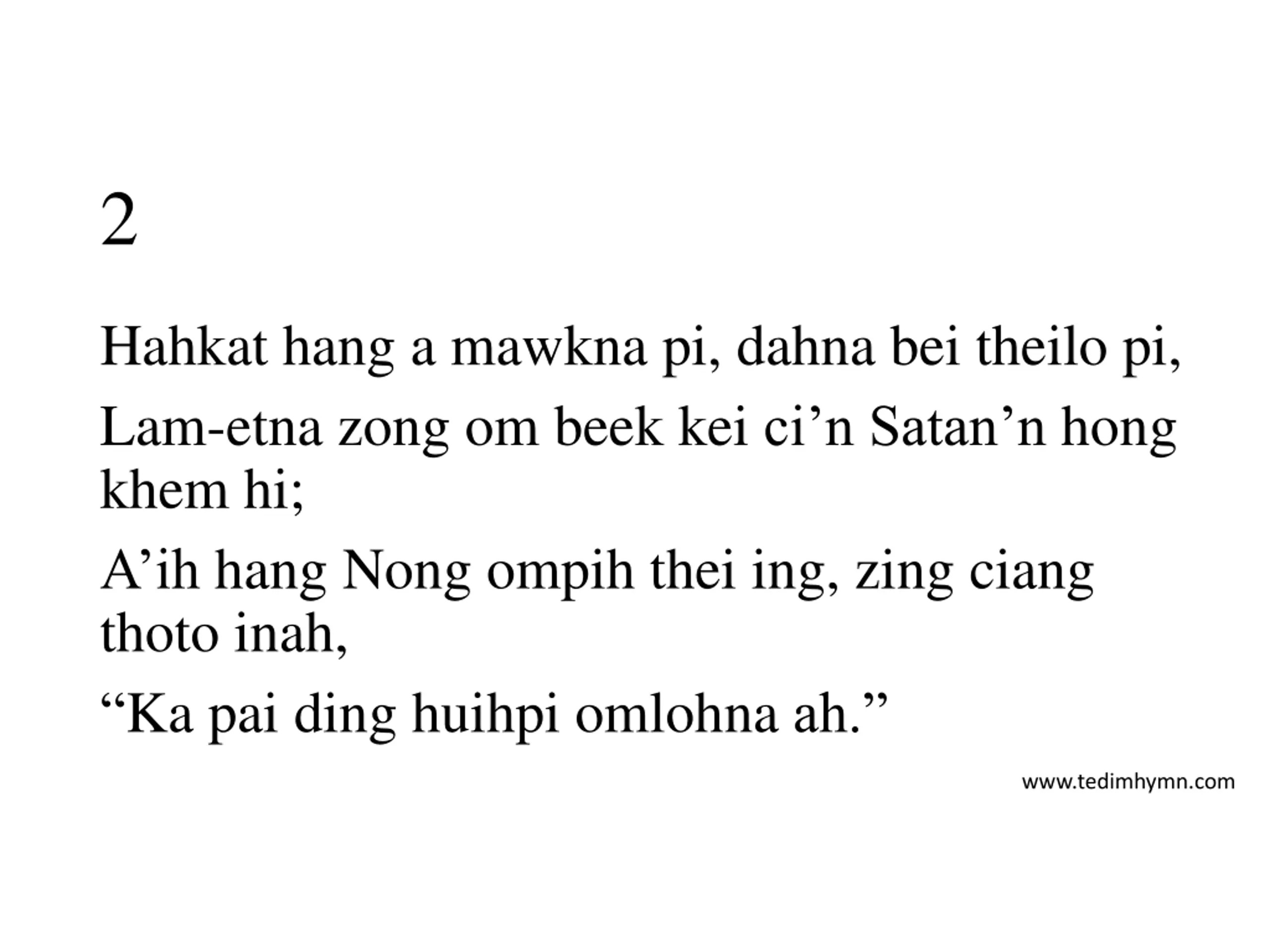 2 Hahkat hang a mawkna pi, dahna bei theilo pi, Lam-etna zong om beek kei ci nSatan n hong khem hi; A ih hang Nong ompih thei ing, zing ciang thoto inah, Ka pai ding huihpi omlohna ah. www.tedimhymn.com