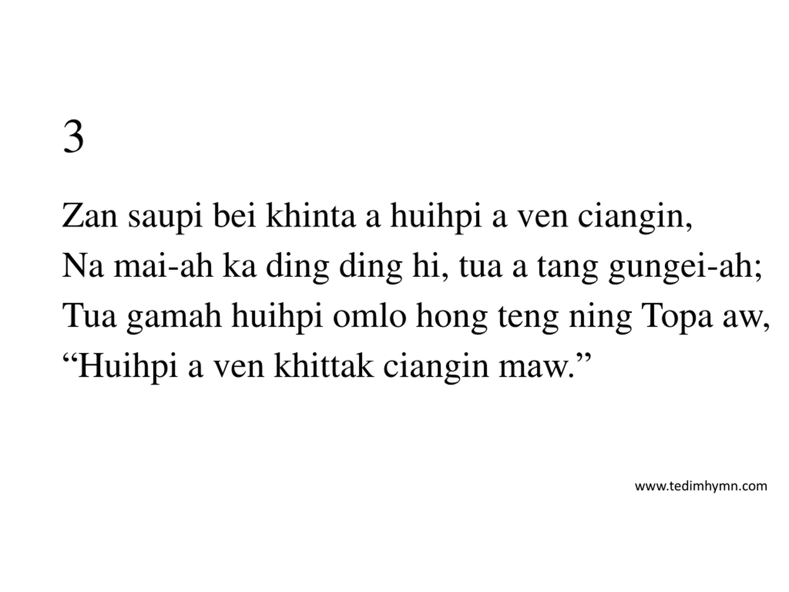 3 Zan saupi bei khinta a huihpi a ven ciangin, Na mai-ah ka ding ding hi, tua a tang gungei-ah; Tua gamah huihpi omlo hong teng ning Topa aw, Huihpi a ven khittak ciangin maw. www.tedimhymn.com