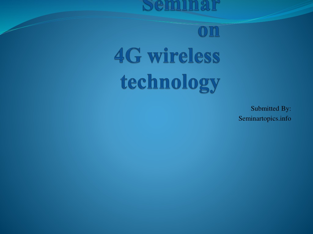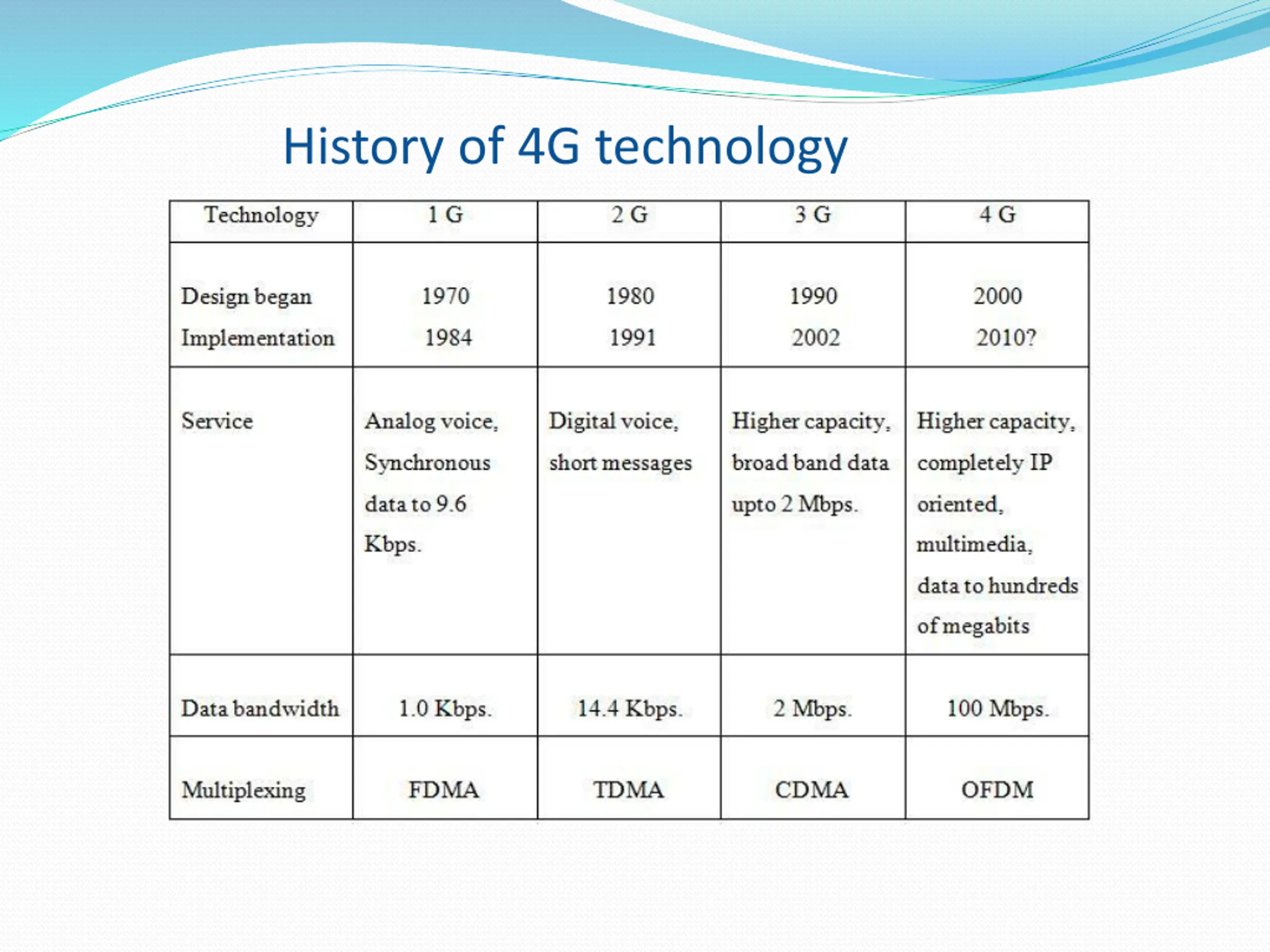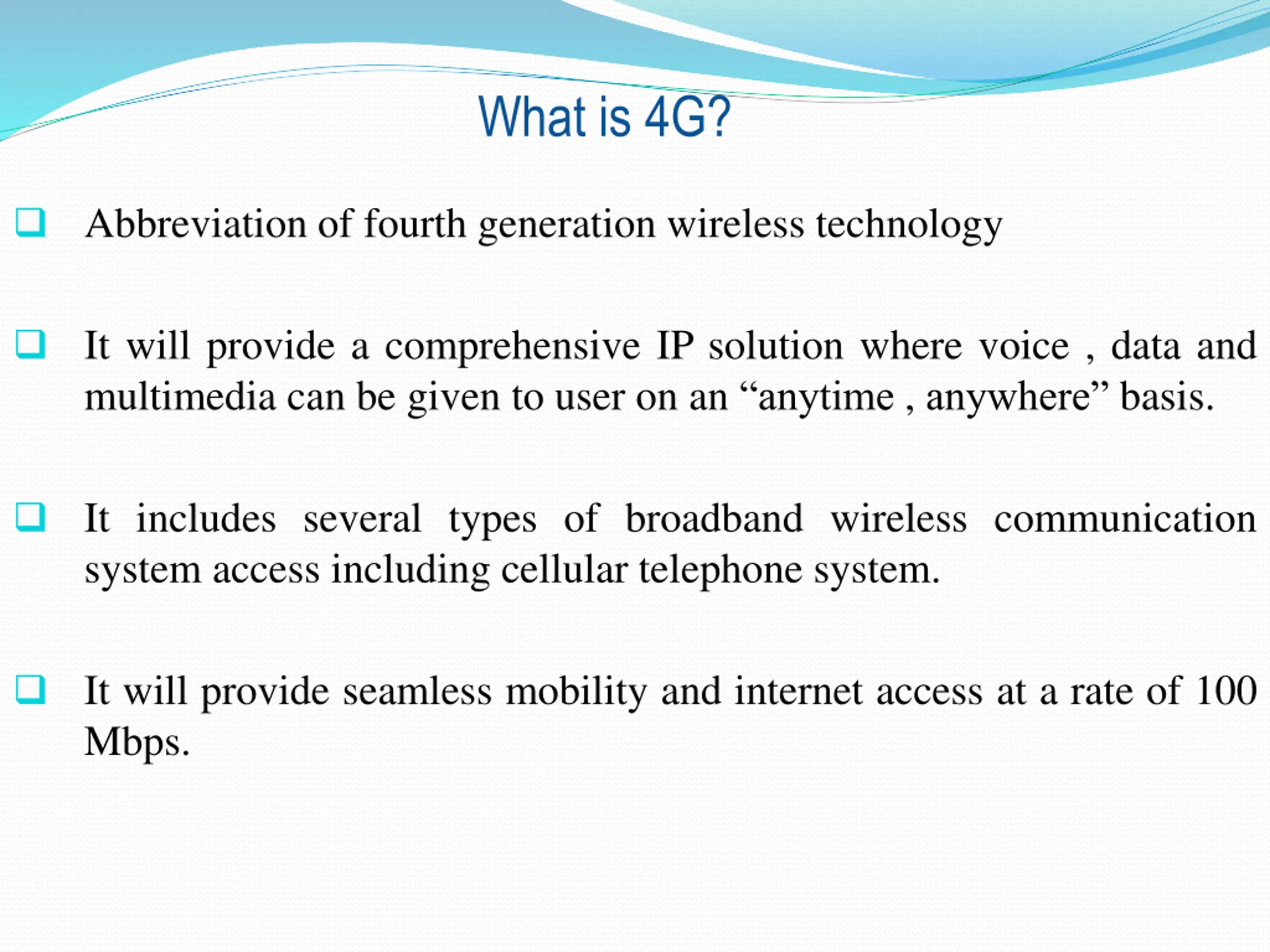 What is 4G? Abbreviation of fourth generation wireless technology It will provide a comprehensive IP solution where voice , data and multimedia can be given to user on an anytime , anywhere basis. It includes several types of broadband wireless communication system access including cellular telephone system. It will provide seamless mobility and internet access at a rate of 100 Mbps.