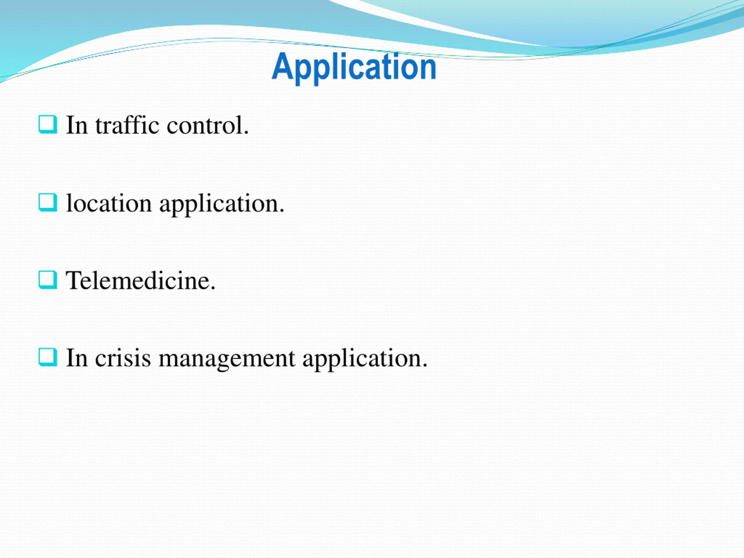 Application In traffic control. location application. Telemedicine. In crisis management application.