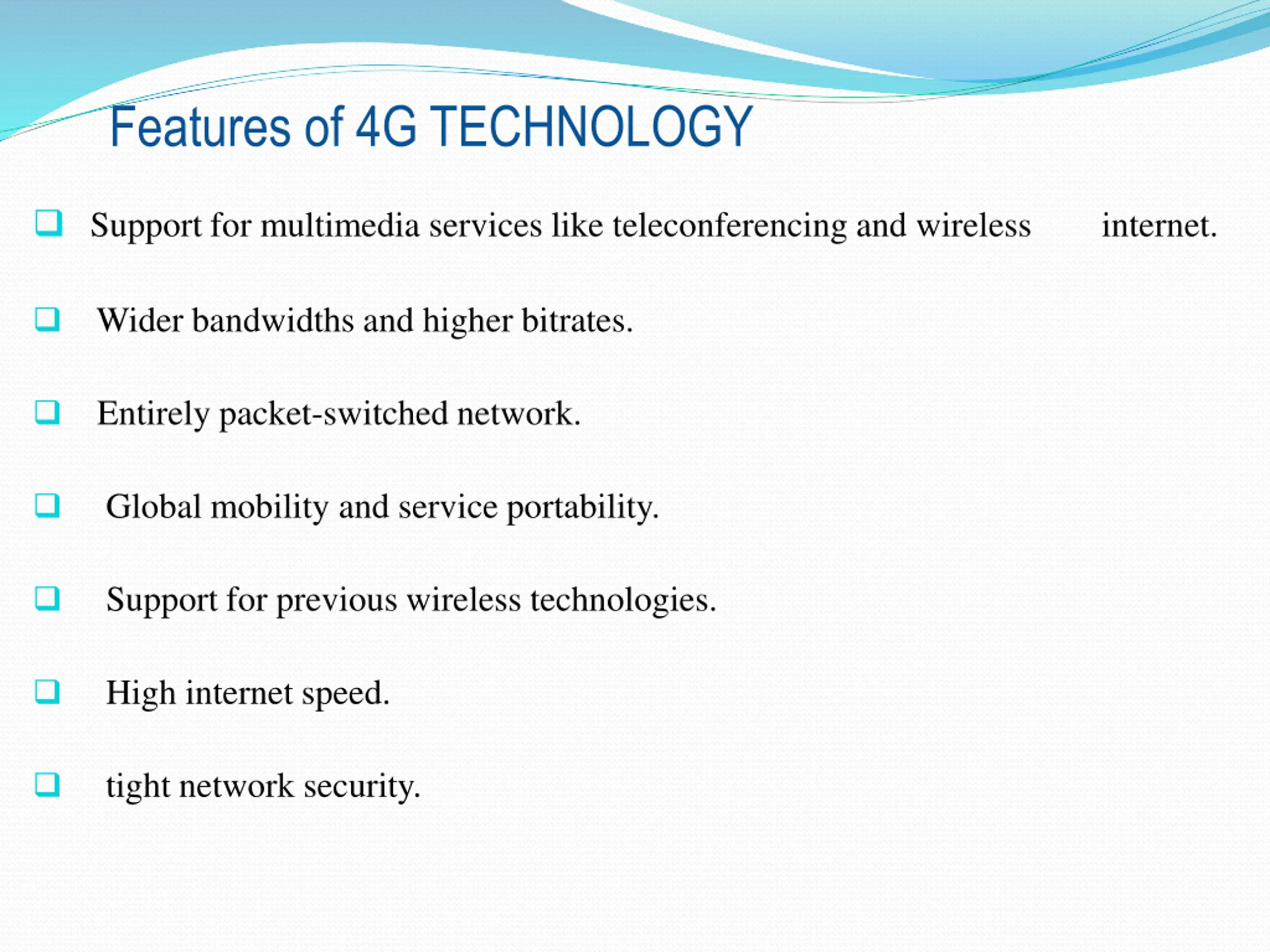 Features of 4G TECHNOLOGY Support for multimedia services like teleconferencing and wireless internet. Wider bandwidths and higher bitrates. Entirely packet-switched network. Global mobility and service portability. Support for previous wireless technologies. High internet speed. tight network security.
