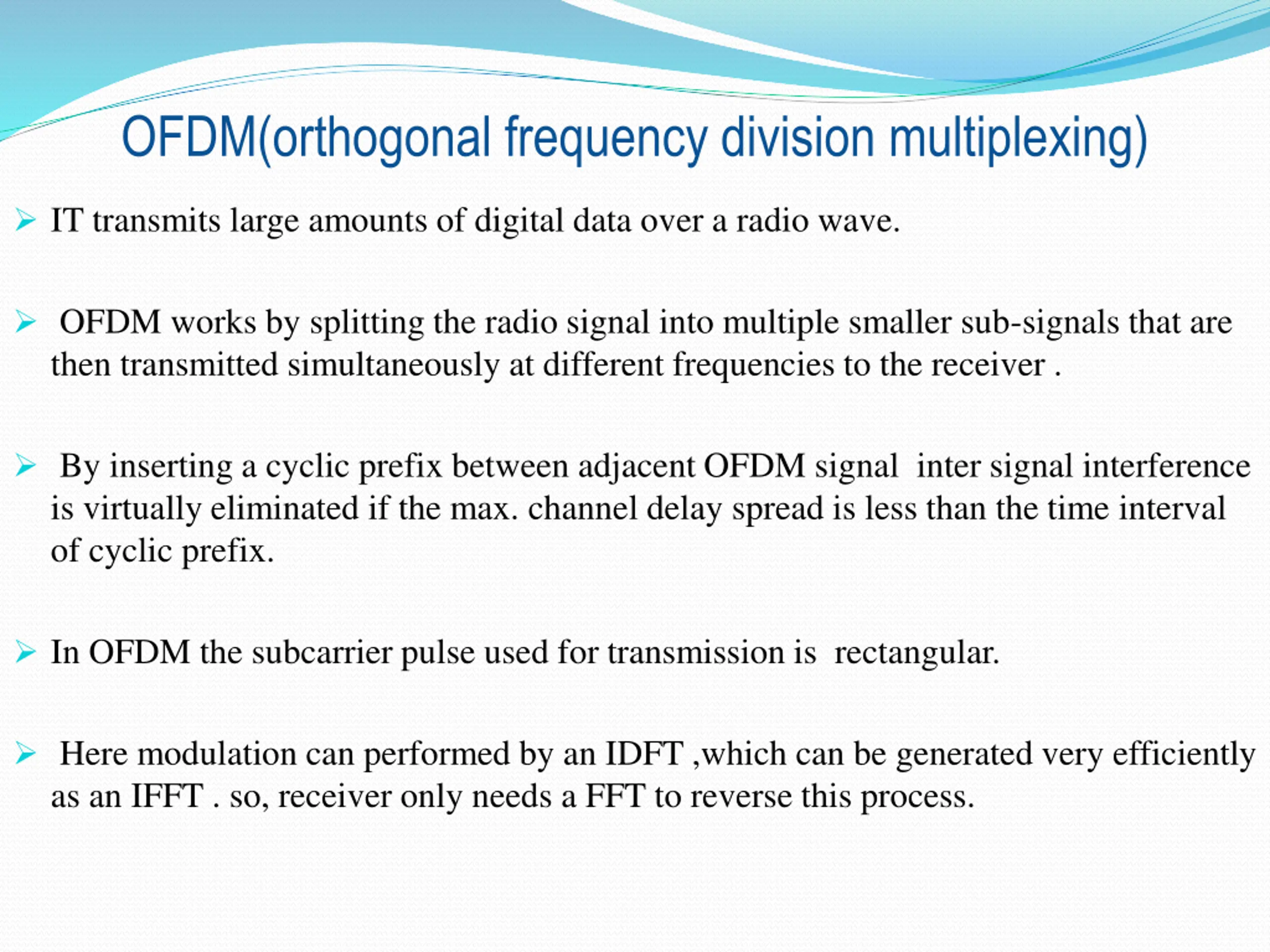 OFDM(orthogonal frequency division multiplexing) IT transmits large amounts of digital data over a radio wave. OFDM works by splitting the radio signal into multiple smaller sub-signals that are then transmitted simultaneously at different frequencies to the receiver . By inserting a cyclic prefix between adjacent OFDM signal inter signal interference is virtually eliminated if the max. channel delay spread is less than the time interval of cyclic prefix. In OFDM the subcarrier pulse used for transmission is rectangular. Here modulation can performed by an IDFT ,which can be generated very efficiently as an IFFT . so, receiver only needs a FFT to reverse this process.