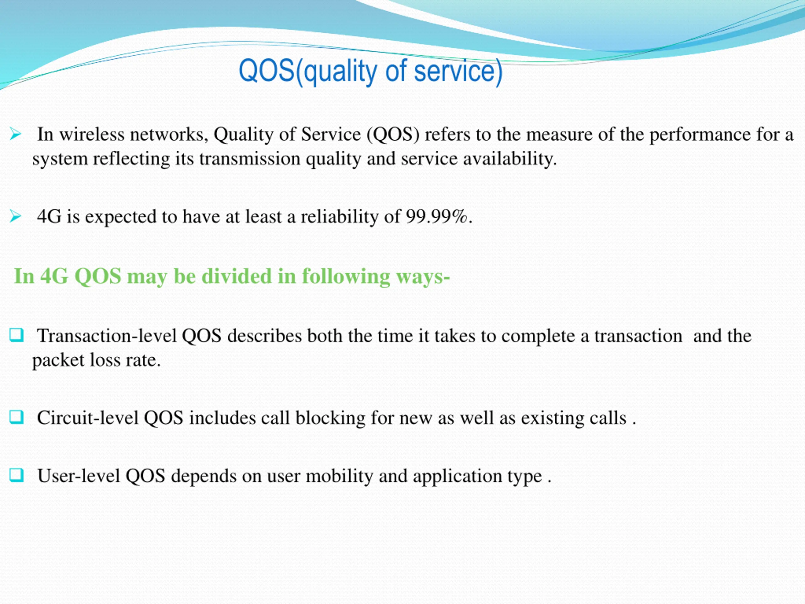 QOS(quality of service) In wireless networks, Quality of Service (QOS) refers to the measure of the performance for a system reflecting its transmission quality and service availability. 4G is expected to have at least a reliability of 99.99%. In 4G QOS may be divided in following ways- Transaction-level QOS describes both the time it takes to complete a transaction and the packet loss rate. Circuit-level QOS includes call blocking for new as well as existing calls . User-level QOS depends on user mobility and application type .