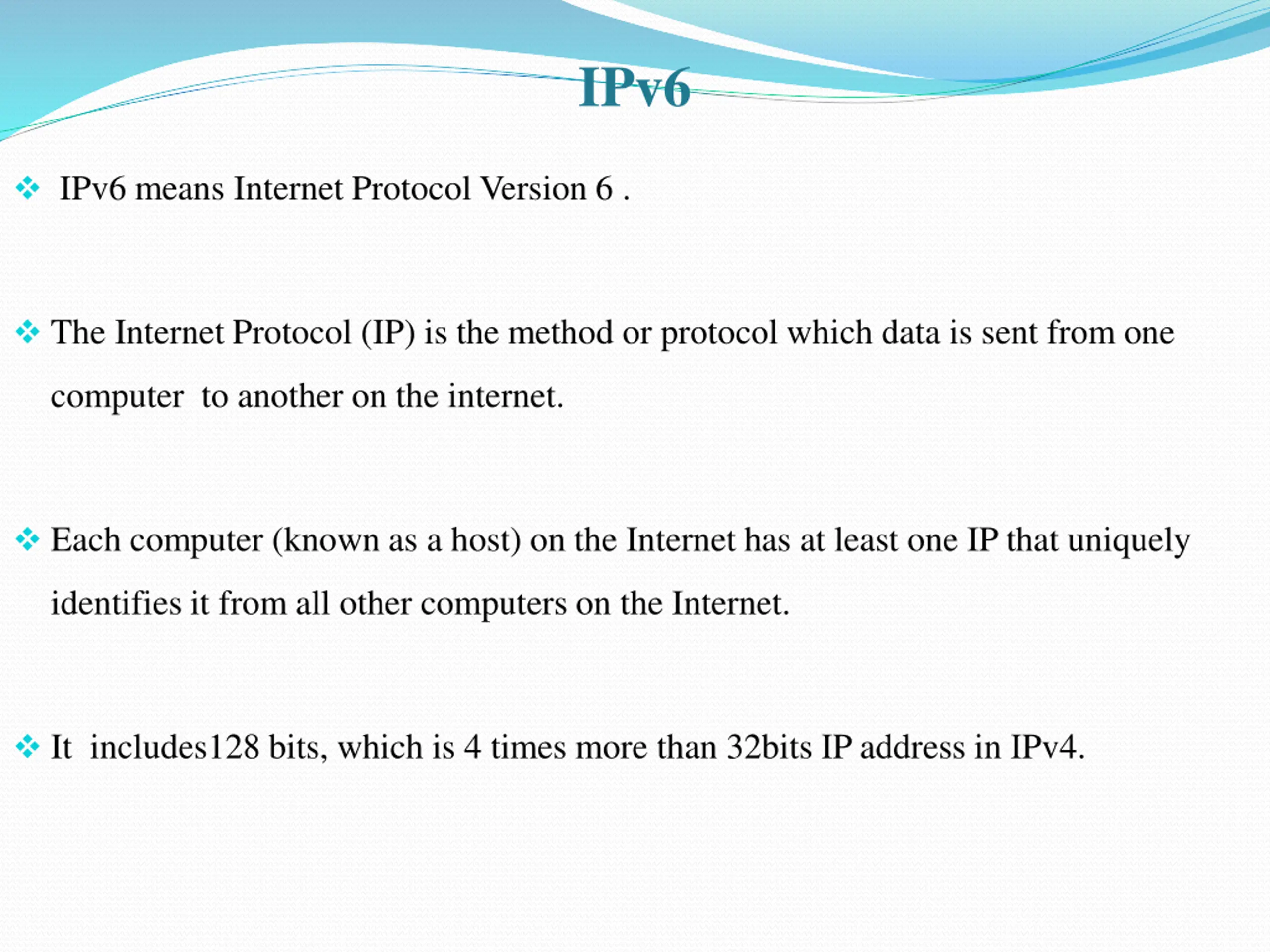 IPv6 IPv6 means Internet Protocol Version 6 . The Internet Protocol (IP) is the method or protocol which data is sent from one computer to another on the internet. Each computer (known as a host) on the Internet has at least one IP that uniquely identifies it from all other computers on the Internet. It includes128 bits, which is 4 times more than 32bits IP address in IPv4.