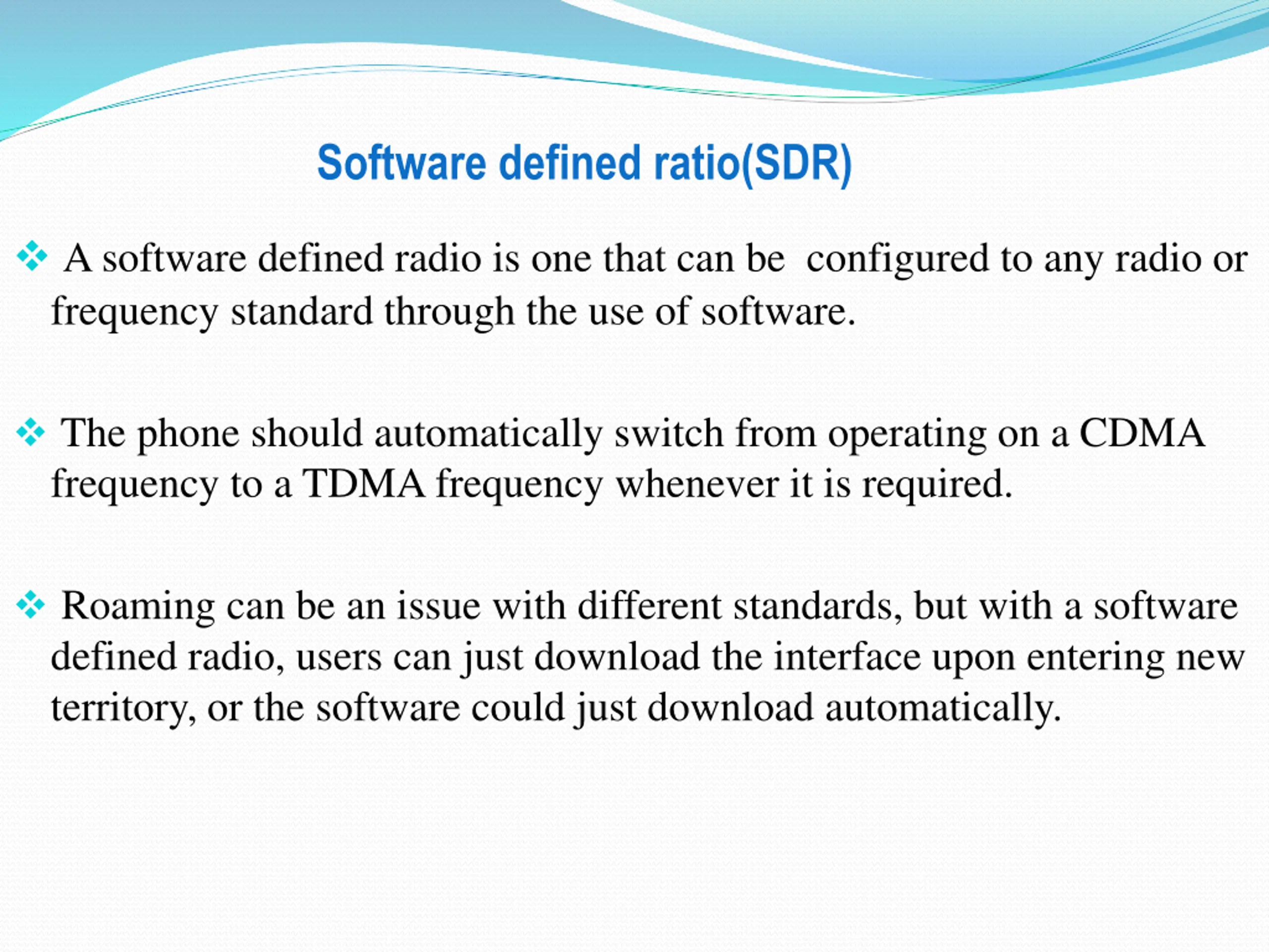 Software defined ratio(SDR) A software defined radio is one that can be configured to any radio or frequency standard through the use of software. The phone should automatically switch from operating on a CDMA frequency to a TDMA frequency whenever it is required. Roaming can be an issue with different standards, but with a software defined radio, users can just download the interface upon entering new territory, or the software could just download automatically.