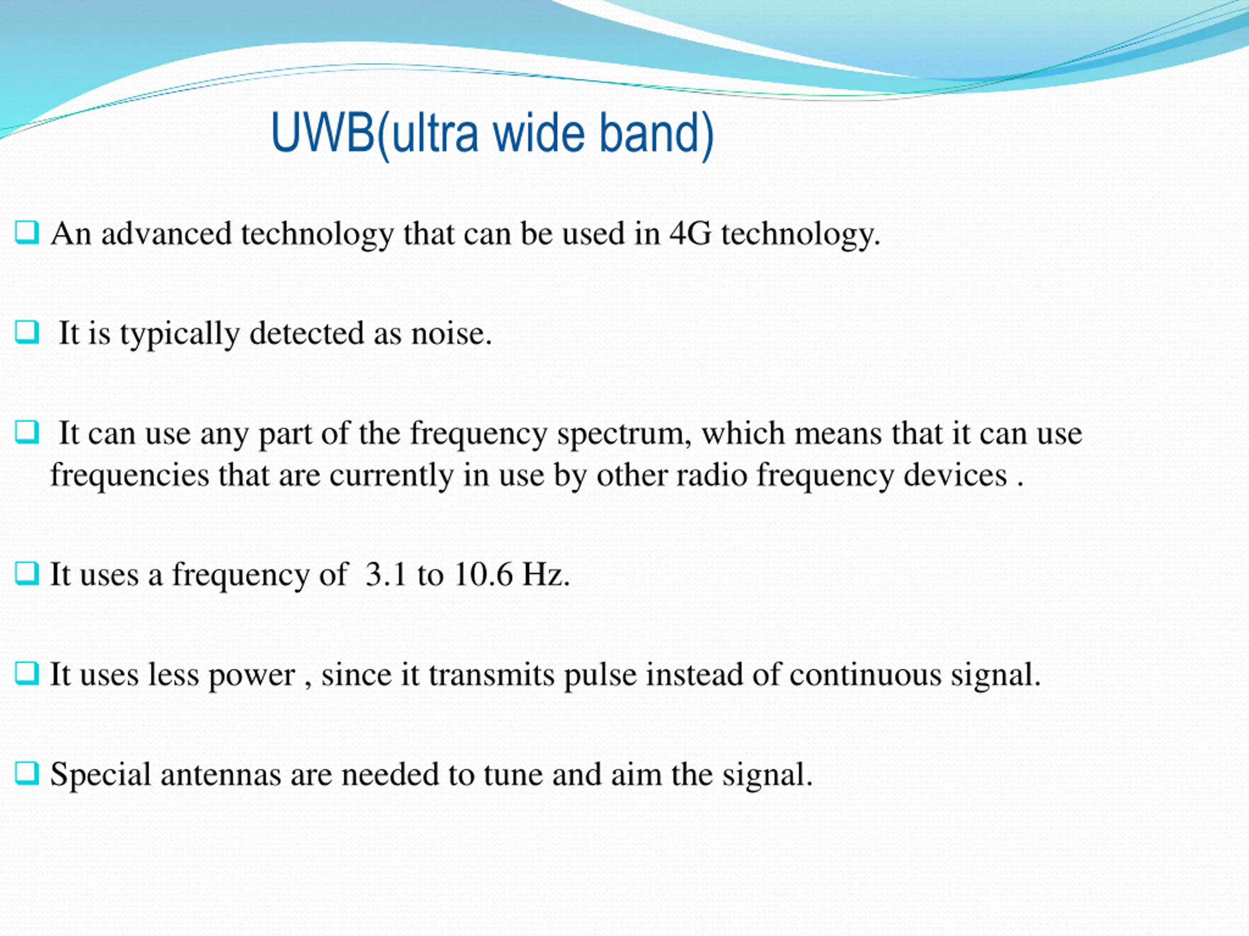 UWB(ultra wide band) An advanced technology that can be used in 4G technology. It is typically detected as noise. It can use any part of the frequency spectrum, which means that it can use frequencies that are currently in use by other radio frequency devices . It uses a frequency of 3.1 to 10.6 Hz. It uses less power , since it transmits pulse instead of continuous signal. Special antennas are needed to tune and aim the signal.