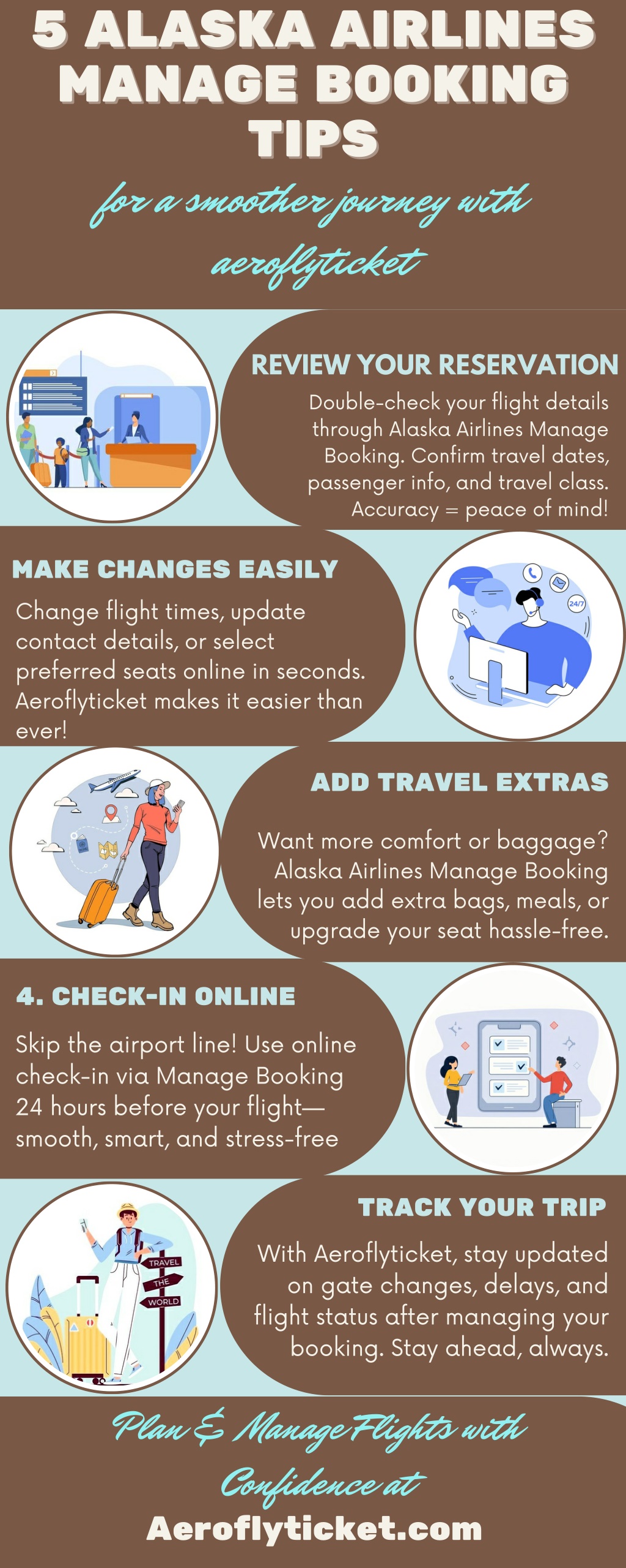 5 ALASKA AIRLINES 5 ALASKA AIRLINES MANAGE BOOKING MANAGE BOOKING TIPS TIPS for a smoother journey with aeroflyticket REVIEW YOUR RESERVATION Double-check your flight details through Alaska Airlines Manage Booking. Confirm travel dates, passenger info, and travel class. Accuracy = peace of mind! MAKE CHANGES EASILY Change flight times, update contact details, or select preferred seats online in seconds. Aeroflyticket makes it easier than ever! ADD TRAVEL EXTRAS Want more comfort or baggage? Alaska Airlines Manage Booking lets you add extra bags, meals, or upgrade your seat hassle-free. 4. CHECK-IN ONLINE Skip the airport line! Use online check-in via Manage Booking 24 hours before your flight smooth, smart, and stress-free TRACK YOUR TRIP With Aeroflyticket, stay updated on gate changes, delays, and flight status after managing your booking. Stay ahead, always. Plan & Manage Flights with Confidence at Aeroflyticket.com
