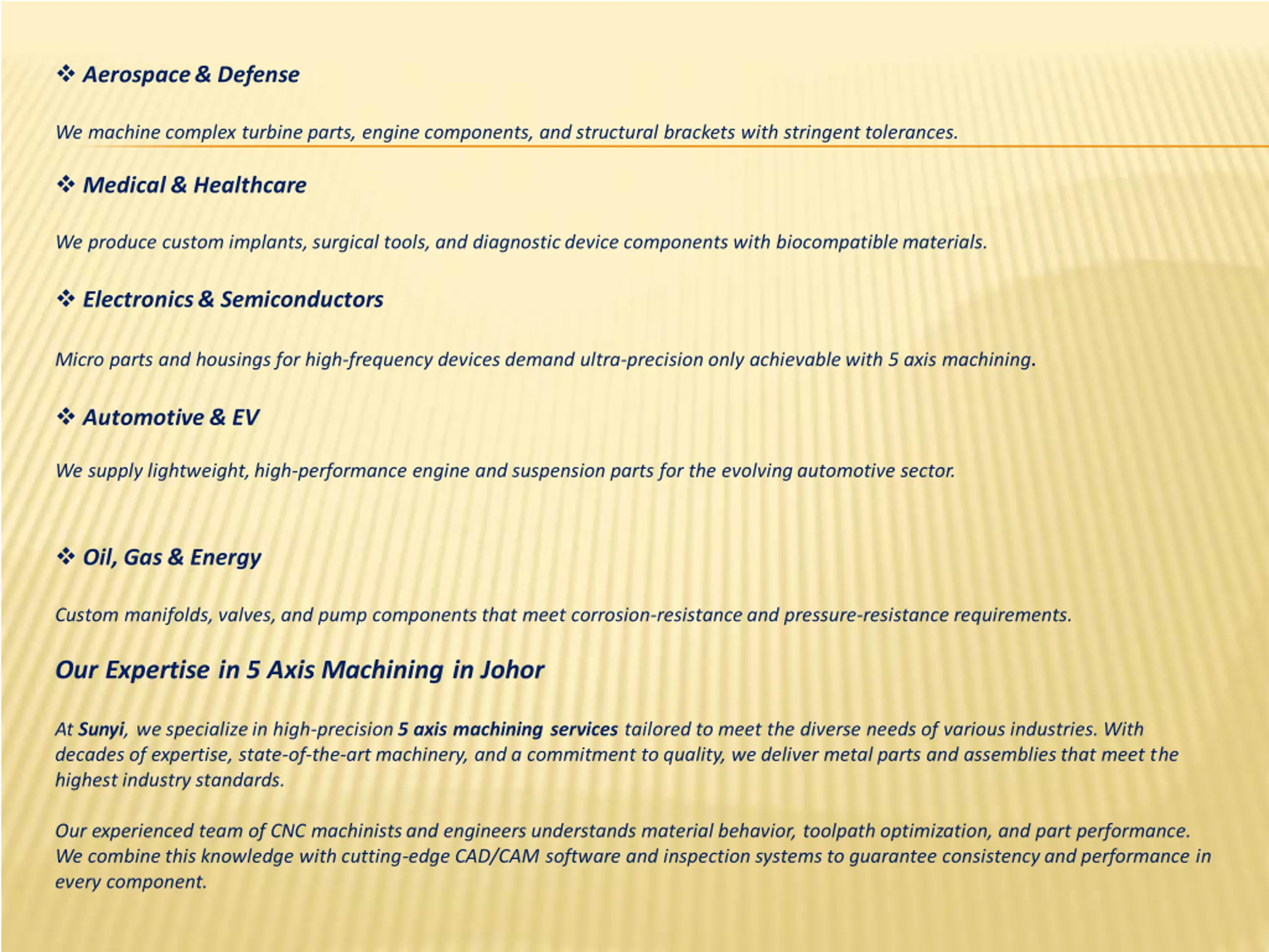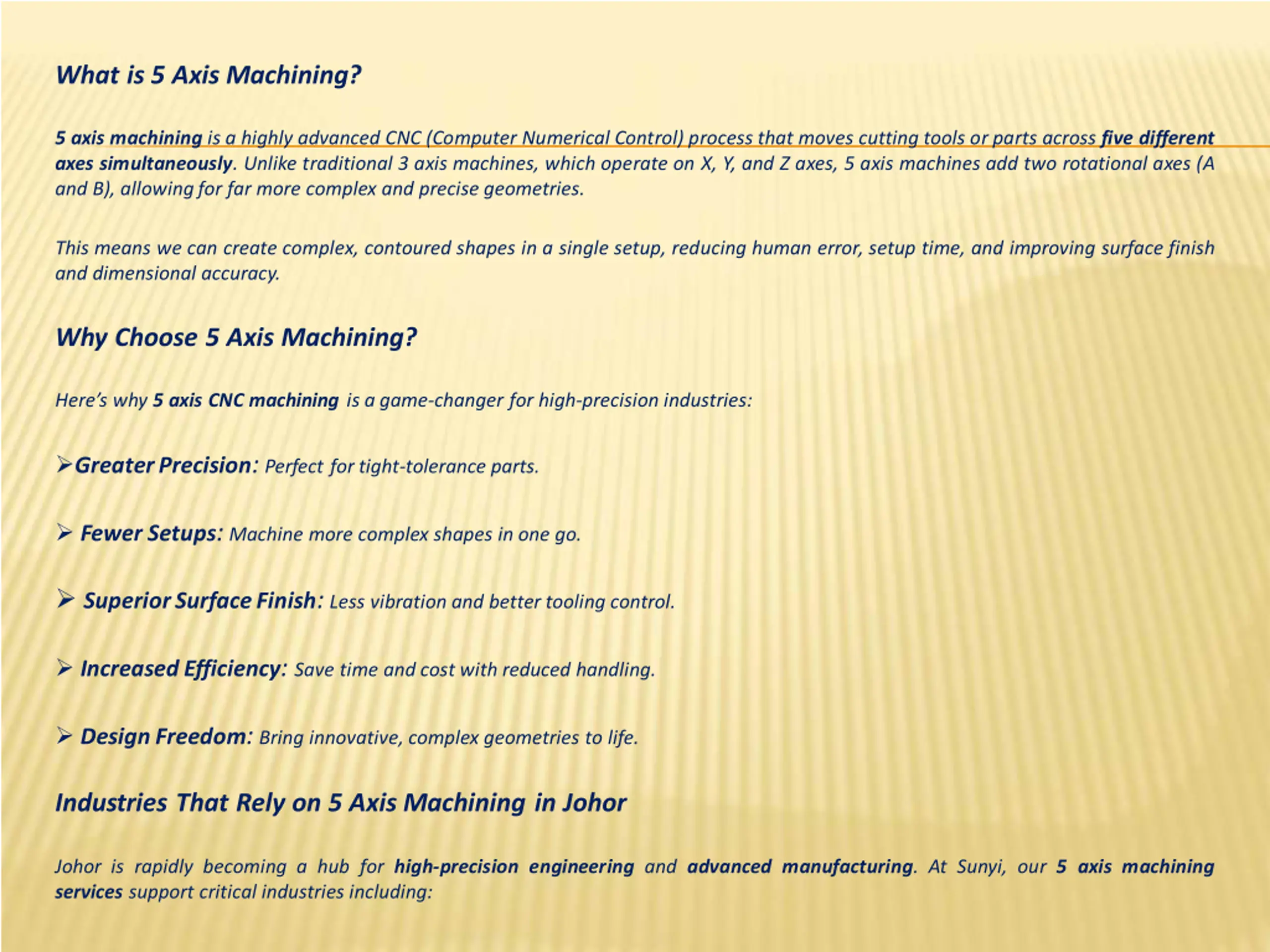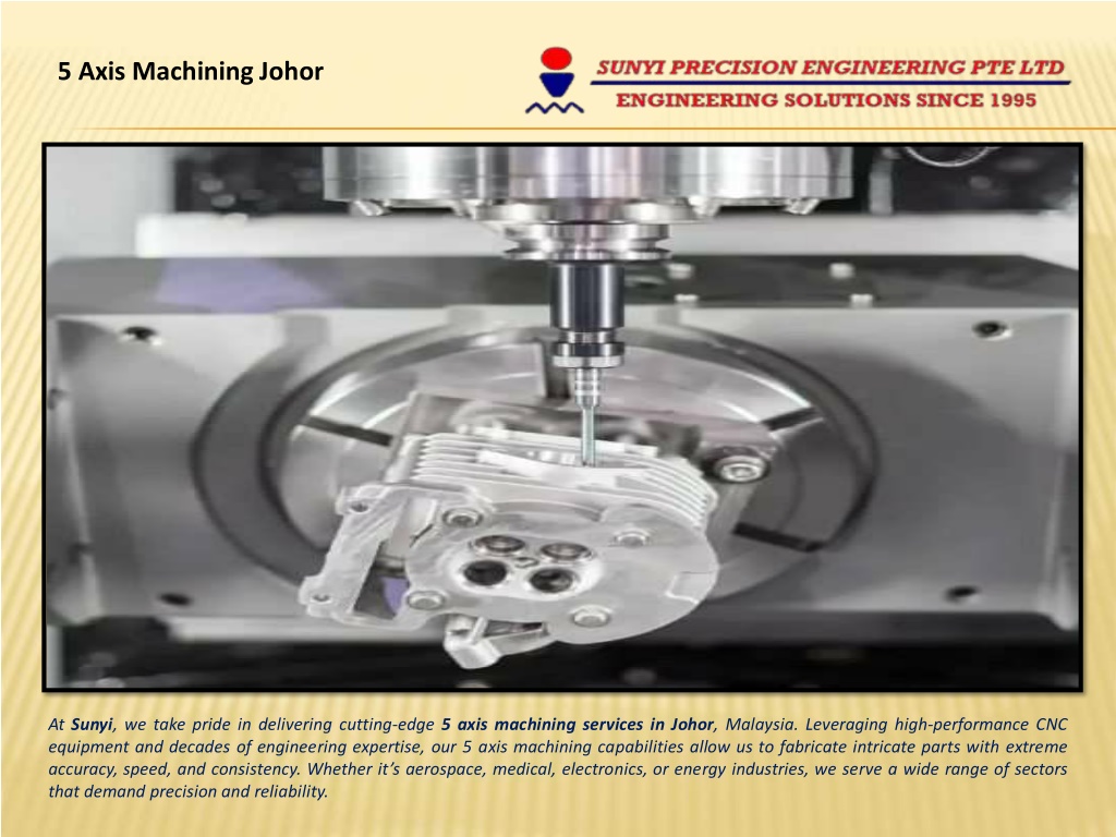 What is 5 Axis Machining? 5 axis machining is a highly advanced CNC (Computer Numerical Control) process that moves cutting tools or parts across five different axes simultaneously. Unlike traditional 3 axis machines, which operate on X, Y, and Z axes, 5 axis machines add two rotational axes (A and B), allowingfor far more complex and precise geometries. This means we can create complex, contoured shapes in a single setup, reducing human error, setup time, and improving surface finish and dimensional accuracy. Why Choose 5 Axis Machining? Here s why 5 axis CNC machining is a game-changer for high-precision industries: GreaterPrecision: Perfect for tight-tolerance parts. Fewer Setups: Machine more complex shapes in one go. SuperiorSurfaceFinish: Less vibration and better tooling control. IncreasedEfficiency: Save time and cost with reduced handling. DesignFreedom: Bring innovative, complex geometries to life. Industries That Rely on 5 Axis Machining in Johor Johor is rapidly becoming a hub for high-precision engineering and advanced manufacturing. At Sunyi, our 5 axis machining services support critical industries including: