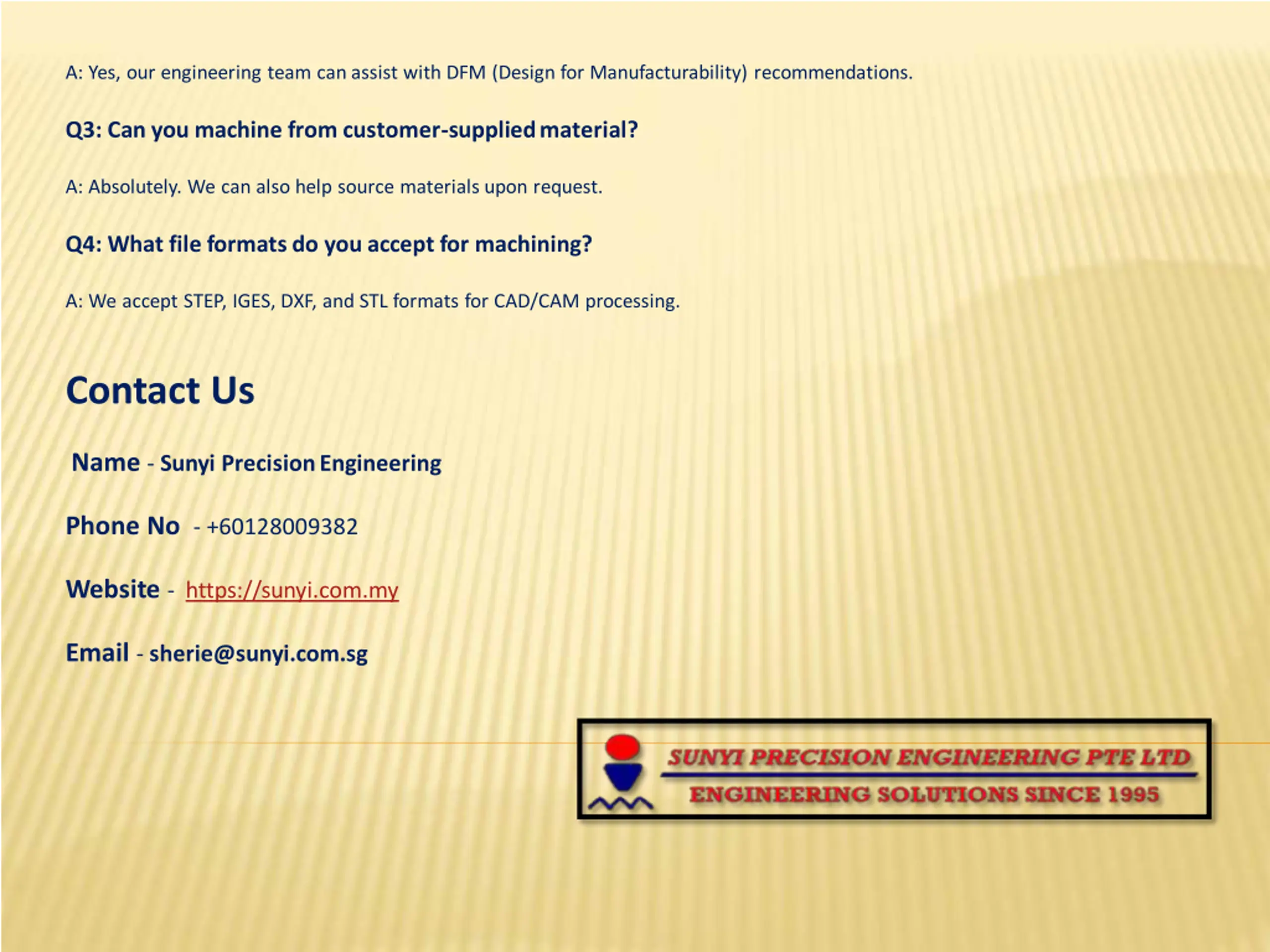 A: Yes, our engineering team can assist with DFM (Design for Manufacturability) recommendations. Q3: Can you machine from customer-supplied material? A: Absolutely. We can also help source materials upon request. Q4: What file formats do you accept for machining? A: We accept STEP, IGES, DXF, and STL formats for CAD/CAM processing. Contact Us Name - Sunyi Precision Engineering Phone No - +60128009382 Website - https://sunyi.com.my Email - sherie@sunyi.com.sg
