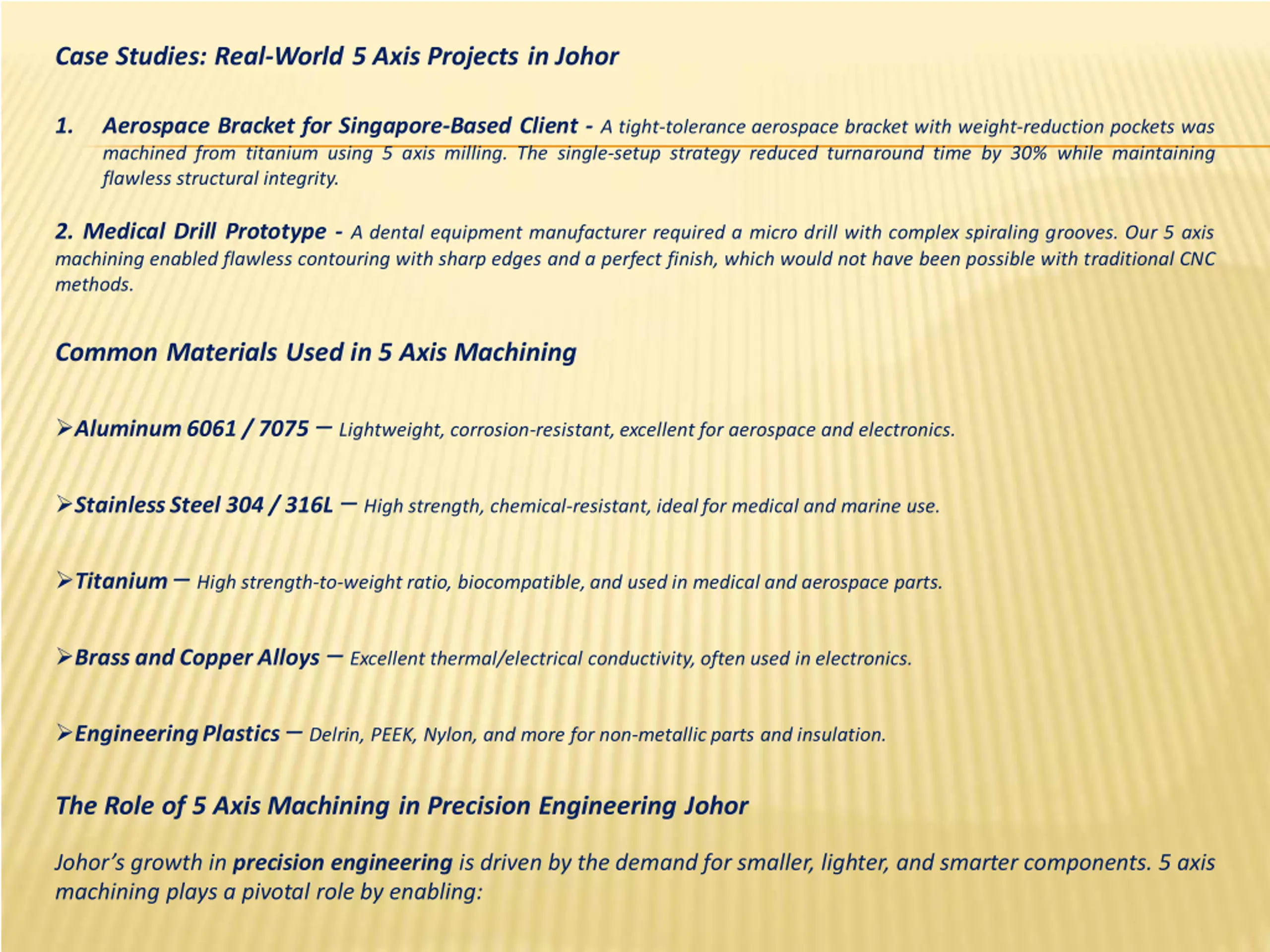 Case Studies: Real-World 5 Axis Projects in Johor 1. Aerospace Bracket for Singapore-Based Client - A tight-tolerance aerospace bracket with weight-reduction pockets was machined from titanium using 5 axis milling. The single-setup strategy reduced turnaround time by 30% while maintaining flawless structural integrity. 2. Medical Drill Prototype - A dental equipment manufacturer required a micro drill with complex spiraling grooves. Our 5 axis machining enabled flawless contouring with sharp edges and a perfect finish, which would not have been possible with traditional CNC methods. Common Materials Used in 5 Axis Machining Aluminum6061 / 7075 Lightweight, corrosion-resistant, excellent for aerospace and electronics. StainlessSteel 304 / 316L High strength, chemical-resistant, idealfor medical and marine use. Titanium High strength-to-weight ratio, biocompatible,and used in medical and aerospace parts. Brass andCopperAlloys Excellent thermal/electrical conductivity, often used in electronics. EngineeringPlastics Delrin, PEEK, Nylon, and more for non-metallicparts and insulation. The Role of 5 Axis Machining in Precision Engineering Johor Johor s growth in precision engineering is driven by the demand for smaller, lighter, and smarter components. 5 axis machining plays a pivotal role by enabling: