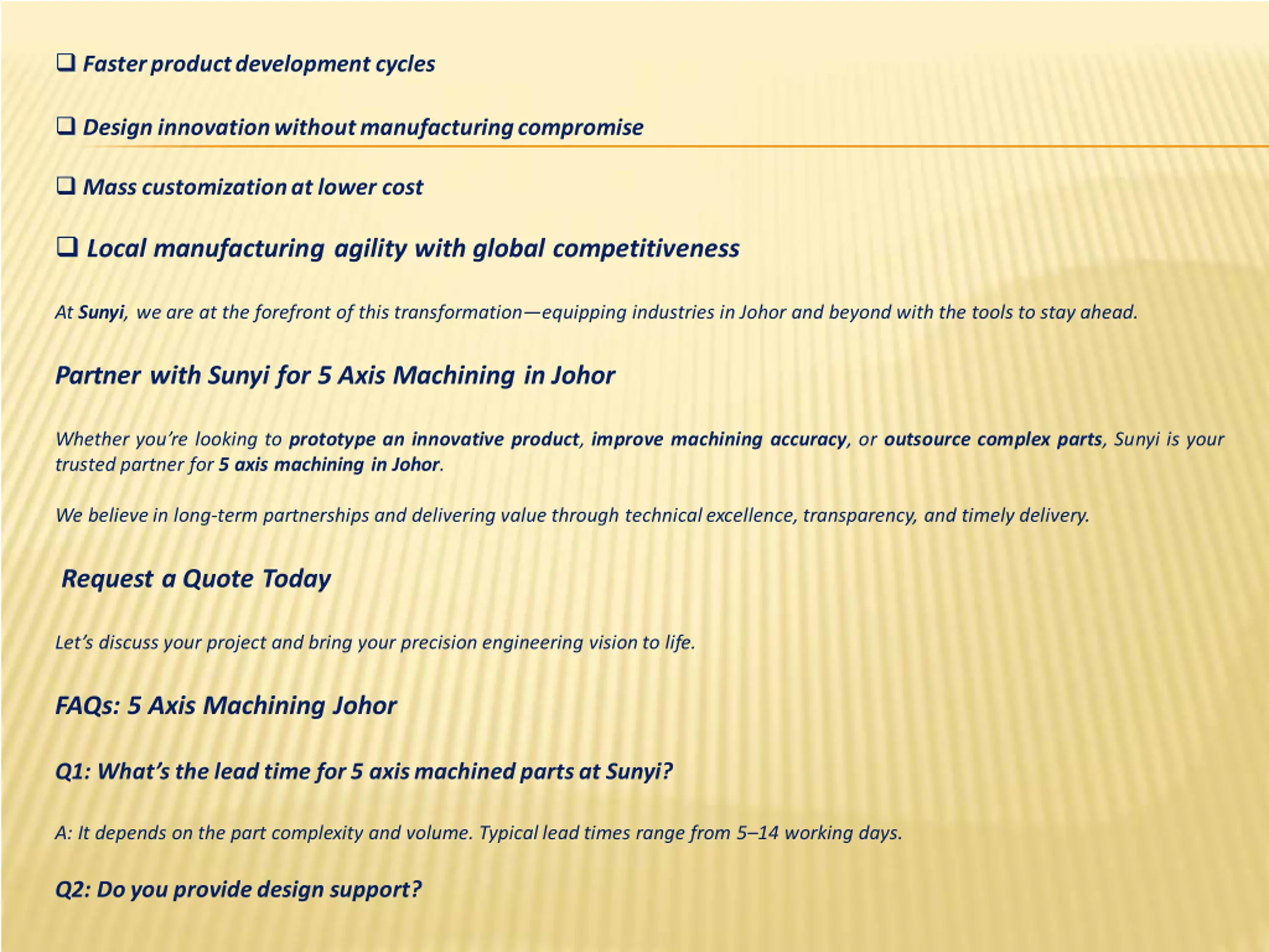 Fasterproductdevelopmentcycles Designinnovationwithoutmanufacturingcompromise Masscustomizationatlower cost Local manufacturing agility with global competitiveness At Sunyi, we are at the forefront of this transformation equipping industries in Johor and beyond with the tools to stay ahead. Partner with Sunyi for 5 Axis Machining in Johor Whether you re looking to prototype an innovative product, improve machining accuracy, or outsource complex parts, Sunyi is your trusted partner for 5 axis machining in Johor. We believein long-term partnerships and delivering value through technicalexcellence,transparency, and timely delivery. Request a Quote Today Let s discuss your project and bring your precision engineering visionto life. FAQs: 5 Axis Machining Johor Q1: What sthe leadtime for5 axismachinedpartsat Sunyi? A: It depends on the part complexity and volume. Typicallead times range from 5 14 working days. Q2: Doyou providedesign support?