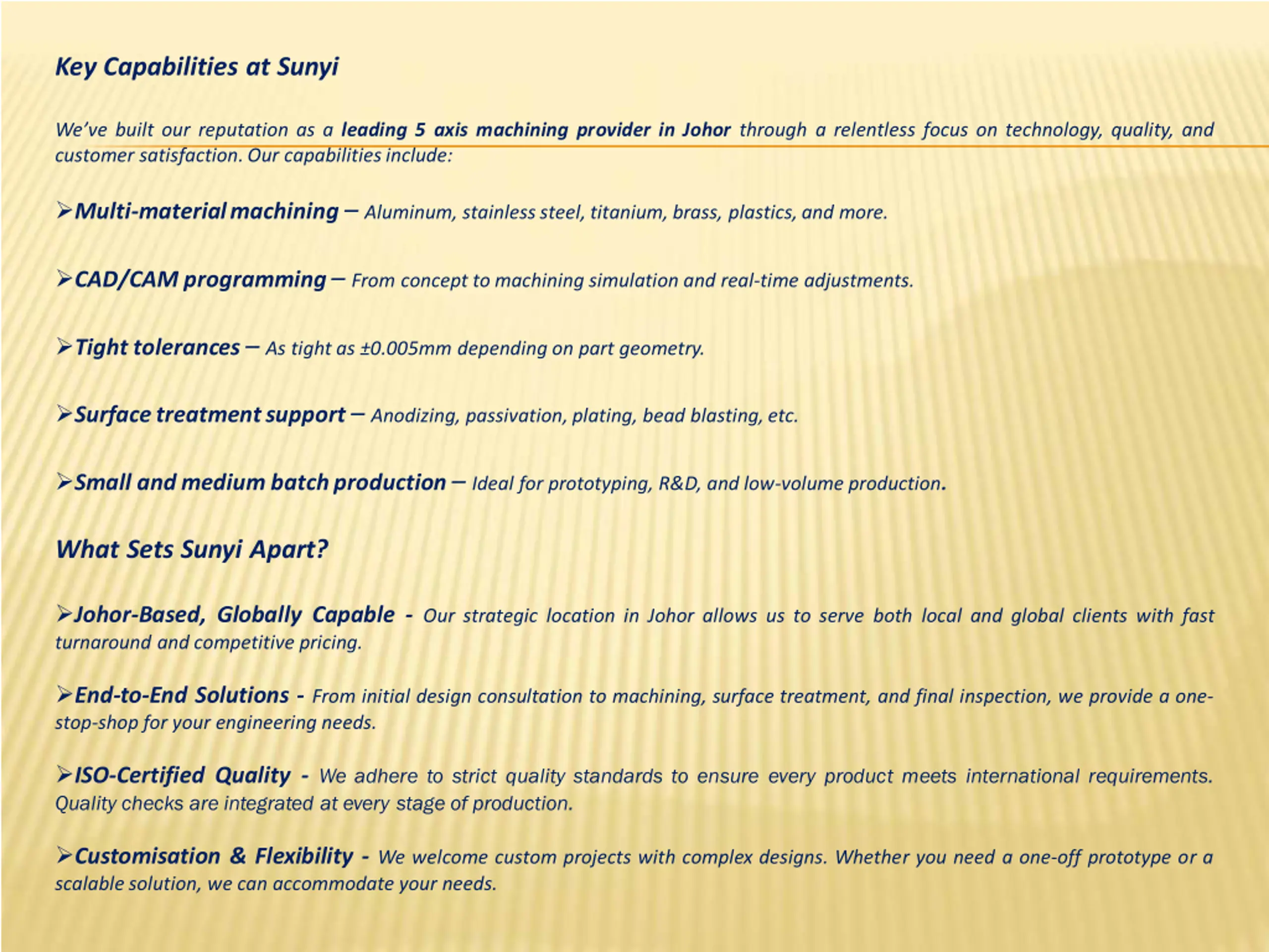 Key Capabilities at Sunyi We ve built our reputation as a leading 5 axis machining provider in Johor through a relentless focus on technology, quality, and customer satisfaction.Our capabilitiesinclude: Multi-materialmachining Aluminum, stainlesssteel, titanium, brass, plastics,and more. CAD/CAM programming From concept to machining simulation and real-time adjustments. Tighttolerances As tight as 0.005mm depending on part geometry. Surfacetreatmentsupport Anodizing, passivation, plating, bead blasting,etc. Small andmedium batchproduction Ideal for prototyping, R&D, and low-volume production. What Sets Sunyi Apart? Johor-Based, Globally Capable - Our strategic location in Johor allows us to serve both local and global clients with fast turnaround and competitive pricing. End-to-End Solutions - From initial design consultation to machining, surface treatment, and final inspection, we provide a one- stop-shop for your engineering needs. ISO-Certified Quality - We adhere to strict quality standards to ensure every product meets international requirements. Quality checks are integrated at every stage of production. Customisation & Flexibility - We welcome custom projects with complex designs. Whether you need a one-off prototype or a scalablesolution, we can accommodate your needs.