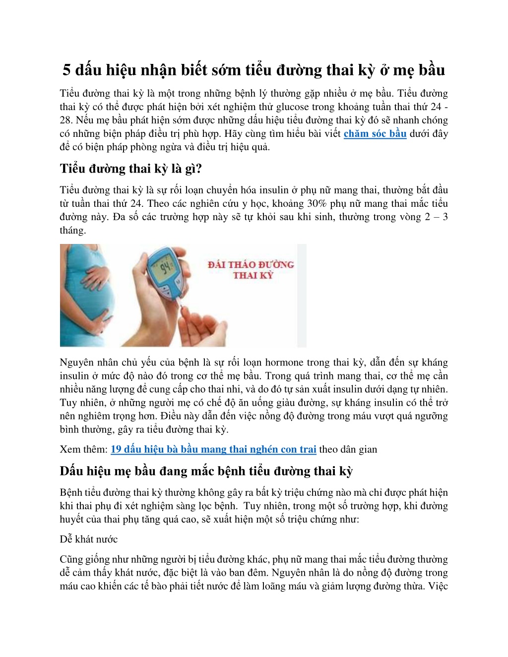 5 du hiu nhn bit sm tiu ng thai k m bu Ti u ng thai k l m t trong nh ng b nh l th ng g p nhi u m b u. Ti u ng thai k c th c ph t hi n b i x t nghi m th glucose trong kho ng tu n thai th 24 - 28. N u m b u ph t hi n s m c nh ng d u hi u ti u ng thai k s nhanh ch ng c nh ng bi n ph p i u tr ph h p. H y c ng t m hi u b i vi t ch m s c b ud i y c bi n ph p ph ng ng a v i u tr hi u qu . Ti u ng thai k l g ? Ti u ng thai k l s r i lo n chuy n h a insulin ph n mang thai, th ng b t u t tu n thai th 24. Theo c c nghi n c u y h c, kho ng 30% ph n mang thai m c ti u ng n y. a s c c tr ng h p n y s t kh i sau khi sinh, th ng trong v ng 2 3 th ng. Nguy n nh n ch y u c a b nh l s r i lo n hormone trong thai k , d n n s kh ng insulin m c n o trong c th m b u. Trong qu tr nh mang thai, c th m c n nhi u n ng l ng cung c p cho thai nhi, v do t s n xu t insulin d i d ng t nhi n. Tuy nhi n, nh ng ng i m c ch n u ng gi u ng, s kh ng insulin c th tr n n nghi m tr ng h n. i u n y d n n vi c n ng ng trong m u v t qu ng ng b nh th ng, g y ra ti u ng thai k . Xem th m: 19 d u hi u b b u mang thai ngh n con trai theo d n gian D u hi u m b u ang m c b nh ti u ng thai k B nh ti u ng thai k th ng kh ng g y ra b t k tri u ch ng n o m ch c ph t hi n khi thai ph i x t nghi m s ng l c b nh. Tuy nhi n, trong m t s tr ng h p, khi ng huy t c a thai ph t ng qu cao, s xu t hi n m t s tri u ch ng nh : D kh t n c C ng gi ng nh nh ng ng i b ti u ng kh c, ph n mang thai m c ti u ng th ng d c m th y kh t n c, c bi t l v o ban m. Nguy n nh n l do n ng ng trong m u cao khi n c c t b o ph i ti t n c l m lo ng m u v gi m l ng ng th a. Vi c