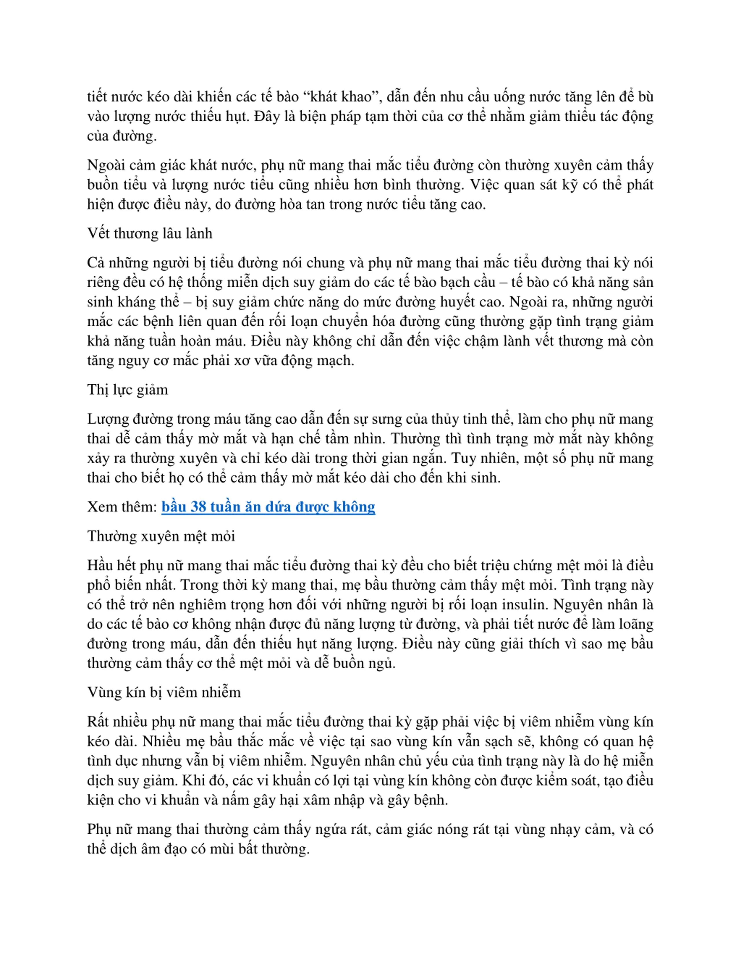 tit nc ko di khin cc tbo kht khao, dn n nhu cu ung nc tng ln b v o l ng n c thi u h t. y l bi n ph p t m th i c a c th nh m gi m thi u t c ng c a ng. Ngo i c m gi c kh t n c, ph n mang thai m c ti u ng c n th ng xuy n c m th y bu n ti u v l ng n c ti u c ng nhi u h n b nh th ng. Vi c quan s t k c th ph t hi n c i u n y, do ng h a tan trong n c ti u t ng cao. V t th ng l u l nh C nh ng ng i b ti u ng n i chung v ph n mang thai m c ti u ng thai k n i ri ng u c h th ng mi n d ch suy gi m do c c t b o b ch c u t b o c kh n ng s n sinh kh ng th b suy gi m ch c n ng do m c ng huy t cao. Ngo i ra, nh ng ng i m c c c b nh li n quan n r i lo n chuy n h a ng c ng th ng g p t nh tr ng gi m kh n ng tu n ho n m u. i u n y kh ng ch d n n vi c ch m l nh v t th ng m c n t ng nguy c m c ph i x v a ng m ch. Th l c gi m L ng ng trong m u t ng cao d n n s s ng c a th y tinh th , l m cho ph n mang thai d c m th y m m t v h n ch t m nh n. Th ng th t nh tr ng m m t n y kh ng x y ra th ng xuy n v ch k o d i trong th i gian ng n. Tuy nhi n, m t s ph n mang thai cho bi t h c th c m th y m m t k o d i cho n khi sinh. Xem th m: b u 38 tu n n d a c kh ng Th ng xuy n m t m i H u h t ph n mang thai m c ti u ng thai k u cho bi t tri u ch ng m t m i l i u ph bi n nh t. Trong th i k mang thai, m b u th ng c m th y m t m i. T nh tr ng n y c th tr n n nghi m tr ng h n i v i nh ng ng i b r i lo n insulin. Nguy n nh n l do c c t b o c kh ng nh n c n ng l ng t ng, v ph i ti t n c l m lo ng ng trong m u, d n n thi u h t n ng l ng. i u n y c ng gi i th ch v sao m b u th ng c m th y c th m t m i v d bu n ng . V ng k n b vi m nhi m R t nhi u ph n mang thai m c ti u ng thai k g p ph i vi c b vi m nhi m v ng k n k o d i. Nhi u m b u th c m c v vi c t i sao v ng k n v n s ch s , kh ng c quan h t nh d c nh ng v n b vi m nhi m. Nguy n nh n ch y u c a t nh tr ng n y l do h mi n d ch suy gi m. Khi , c c vi khu n c l i t i v ng k n kh ng c n c ki m so t, t o i u ki n cho vi khu n v n m g y h i x m nh p v g y b nh. Ph n mang thai th ng c m th y ng a r t, c m gi c n ng r t t i v ng nh y c m, v c th d ch m o c m i b t th ng.