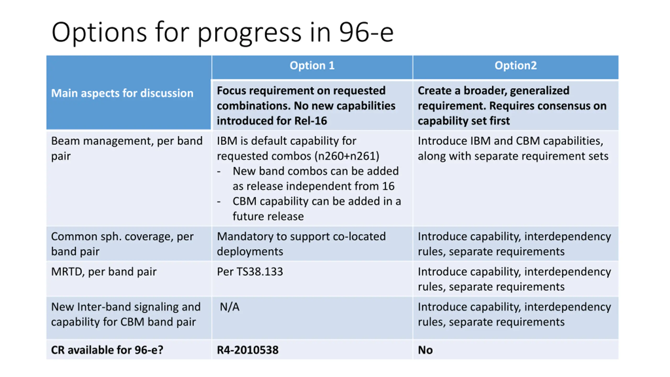 Options for progress in 96-e Option 1 Option2 Focus requirement on requested combinations. No new capabilities introduced for Rel-16 Create a broader, generalized requirement. Requires consensus on capability set first Main aspects for discussion Beam management, per band pair IBM is default capability for requested combos (n260+n261) - New band combos can be added as release independent from 16 - CBM capability can be added in a future release Introduce IBM and CBM capabilities, along with separate requirement sets Common sph. coverage, per band pair Mandatory to support co-located deployments Introduce capability, interdependency rules, separate requirements MRTD, per band pair Per TS38.133 Introduce capability, interdependency rules, separate requirements New Inter-band signaling and capability for CBM band pair N/A Introduce capability, interdependency rules, separate requirements CR available for 96-e? R4-2010538 No