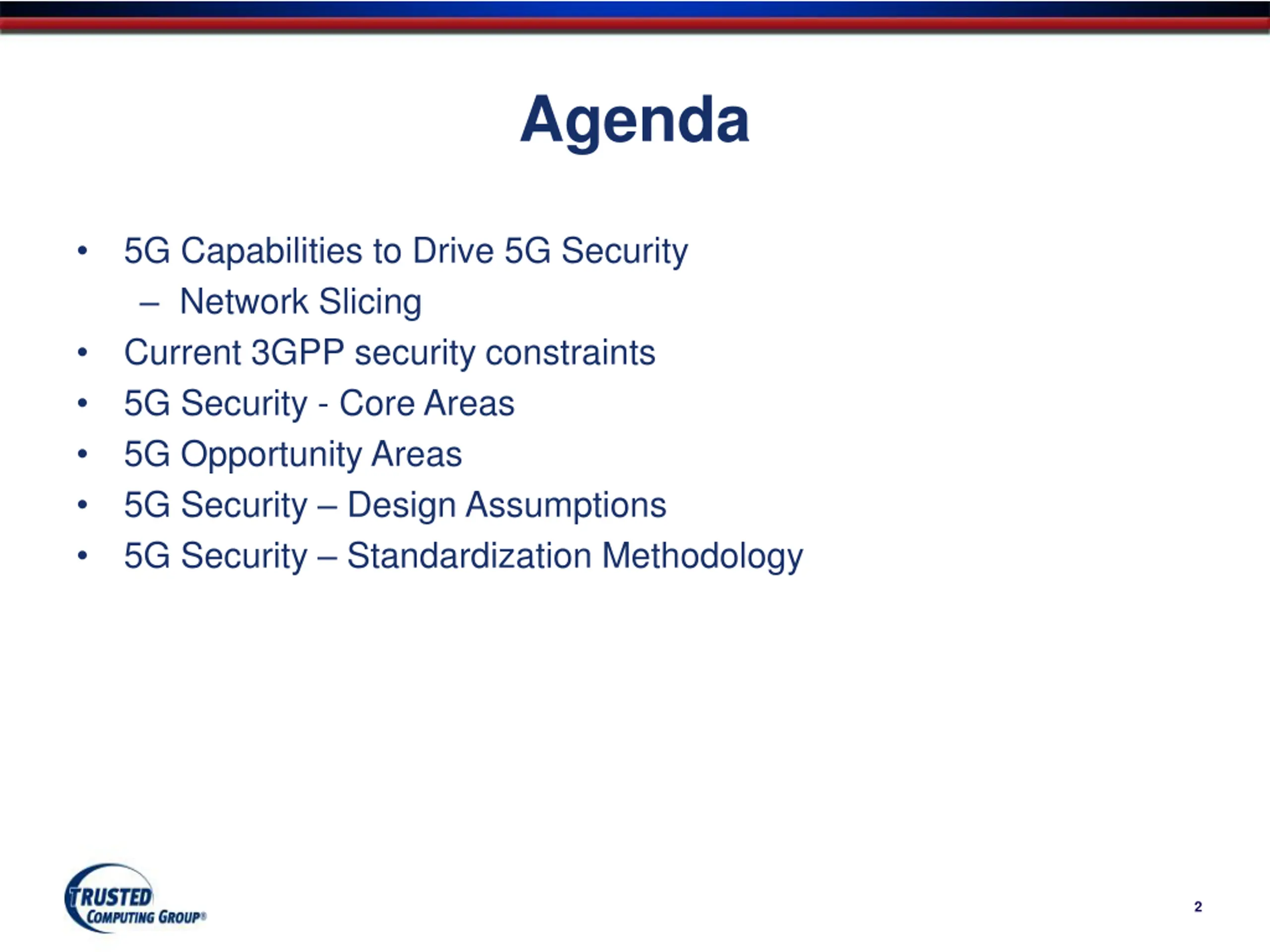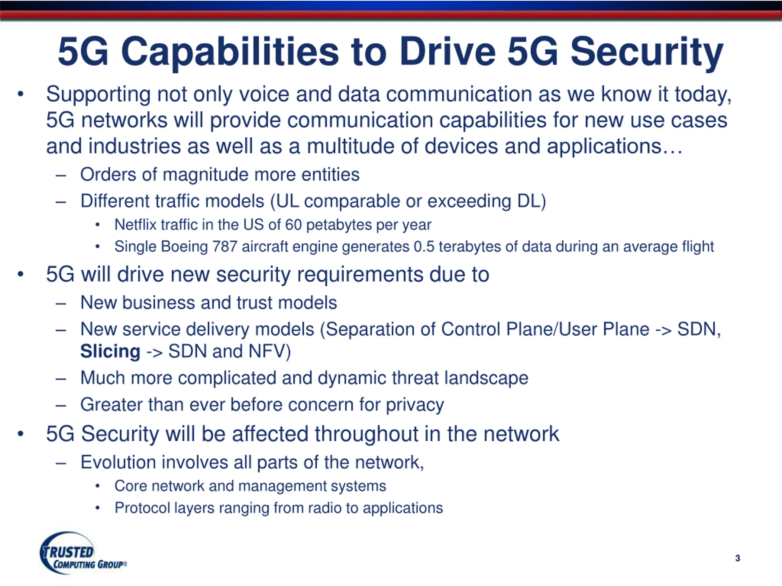 Agenda 5G Capabilities to Drive 5G Security Network Slicing Current 3GPP security constraints 5G Security - Core Areas 5G Opportunity Areas 5G Security Design Assumptions 5G Security Standardization Methodology 2