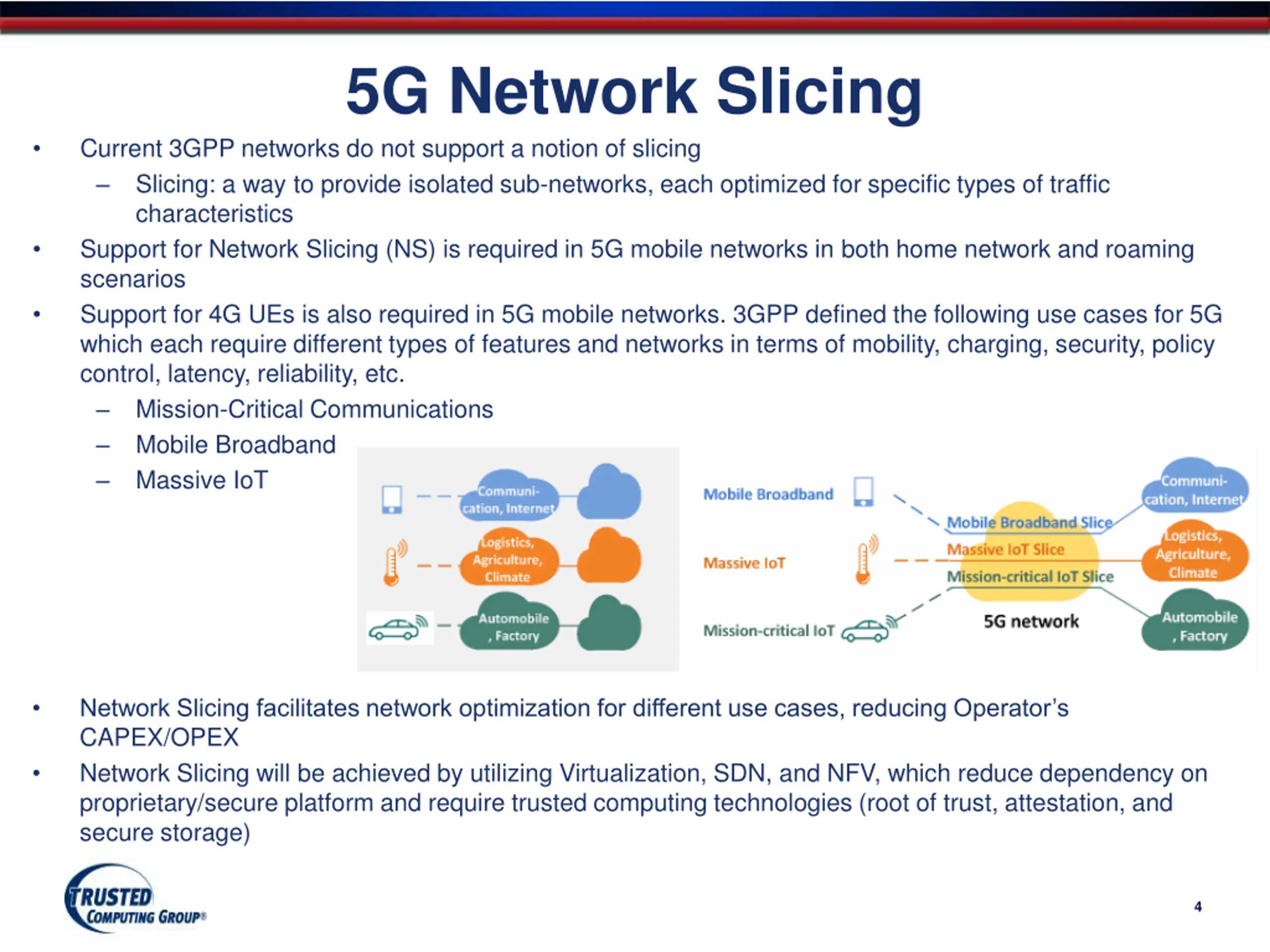 5G Network Slicing Current 3GPP networks do not support a notion of slicing Slicing: a way to provide isolated sub-networks, each optimized for specific types of traffic characteristics Support for Network Slicing (NS) is required in 5G mobile networks in both home network and roaming scenarios Support for 4G UEs is also required in 5G mobile networks. 3GPP defined the following use cases for 5G which each require different types of features and networks in terms of mobility, charging, security, policy control, latency, reliability, etc. Mission-Critical Communications Mobile Broadband Massive IoT Network Slicing facilitates network optimization for different use cases, reducing Operator s CAPEX/OPEX Network Slicing will be achieved by utilizing Virtualization, SDN, and NFV, which reduce dependency on proprietary/secure platform and require trusted computing technologies (root of trust, attestation, and secure storage) 4