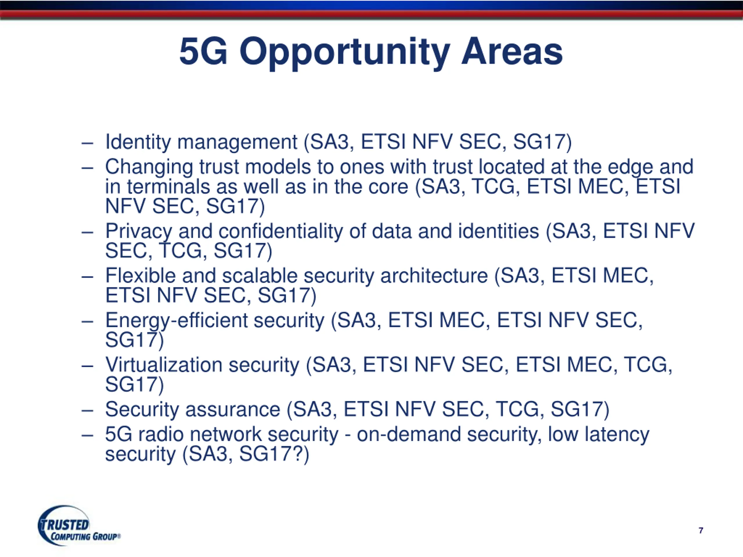 5G Opportunity Areas Identity management (SA3, ETSI NFV SEC, SG17) Changing trust models to ones with trust located at the edge and in terminals as well as in the core (SA3, TCG, ETSI MEC, ETSI NFV SEC, SG17) Privacy and confidentiality of data and identities (SA3, ETSI NFV SEC, TCG, SG17) Flexible and scalable security architecture (SA3, ETSI MEC, ETSI NFV SEC, SG17) Energy-efficient security (SA3, ETSI MEC, ETSI NFV SEC, SG17) Virtualization security (SA3, ETSI NFV SEC, ETSI MEC, TCG, SG17) Security assurance (SA3, ETSI NFV SEC, TCG, SG17) 5G radio network security - on-demand security, low latency security (SA3, SG17?) 7