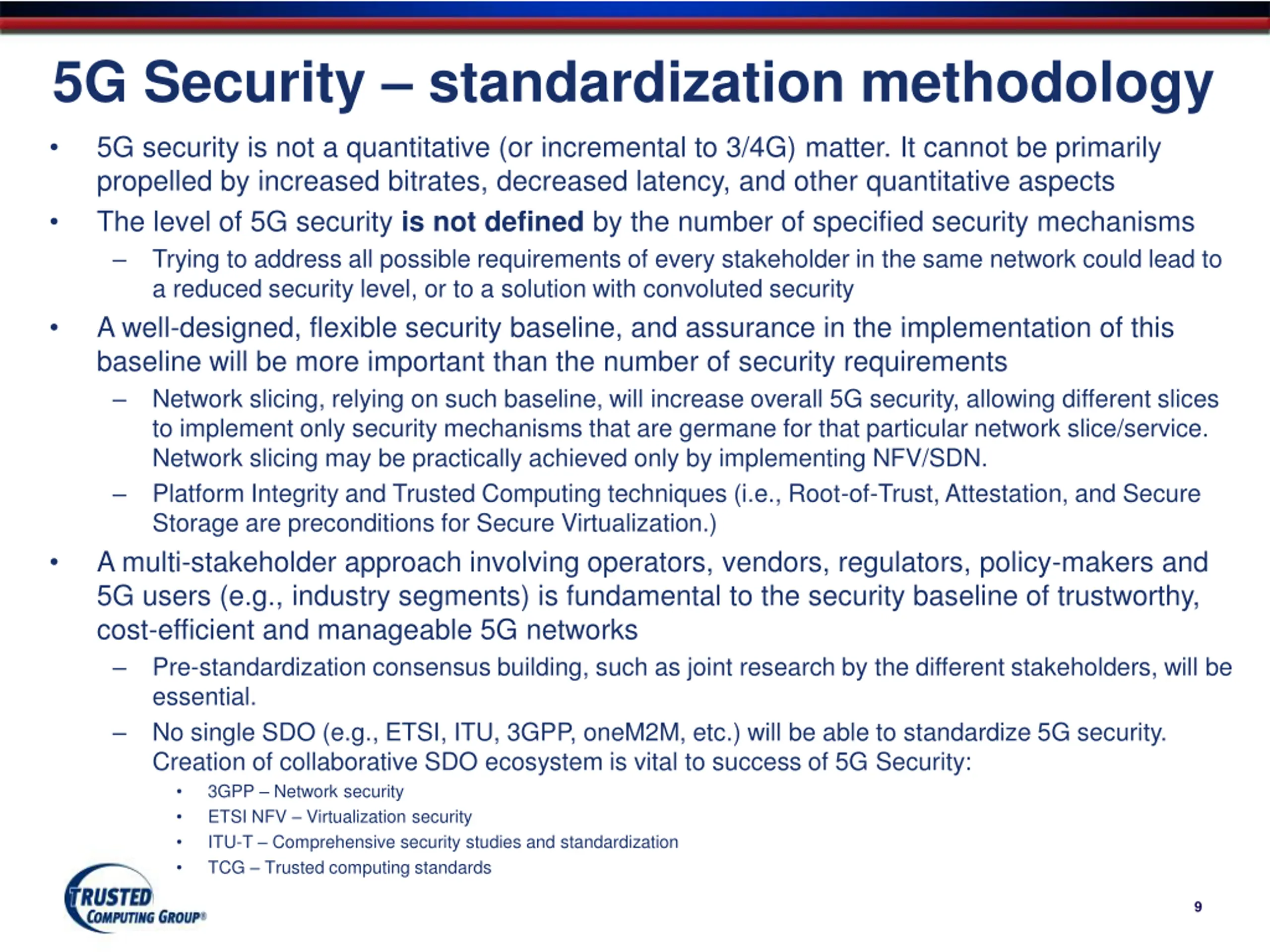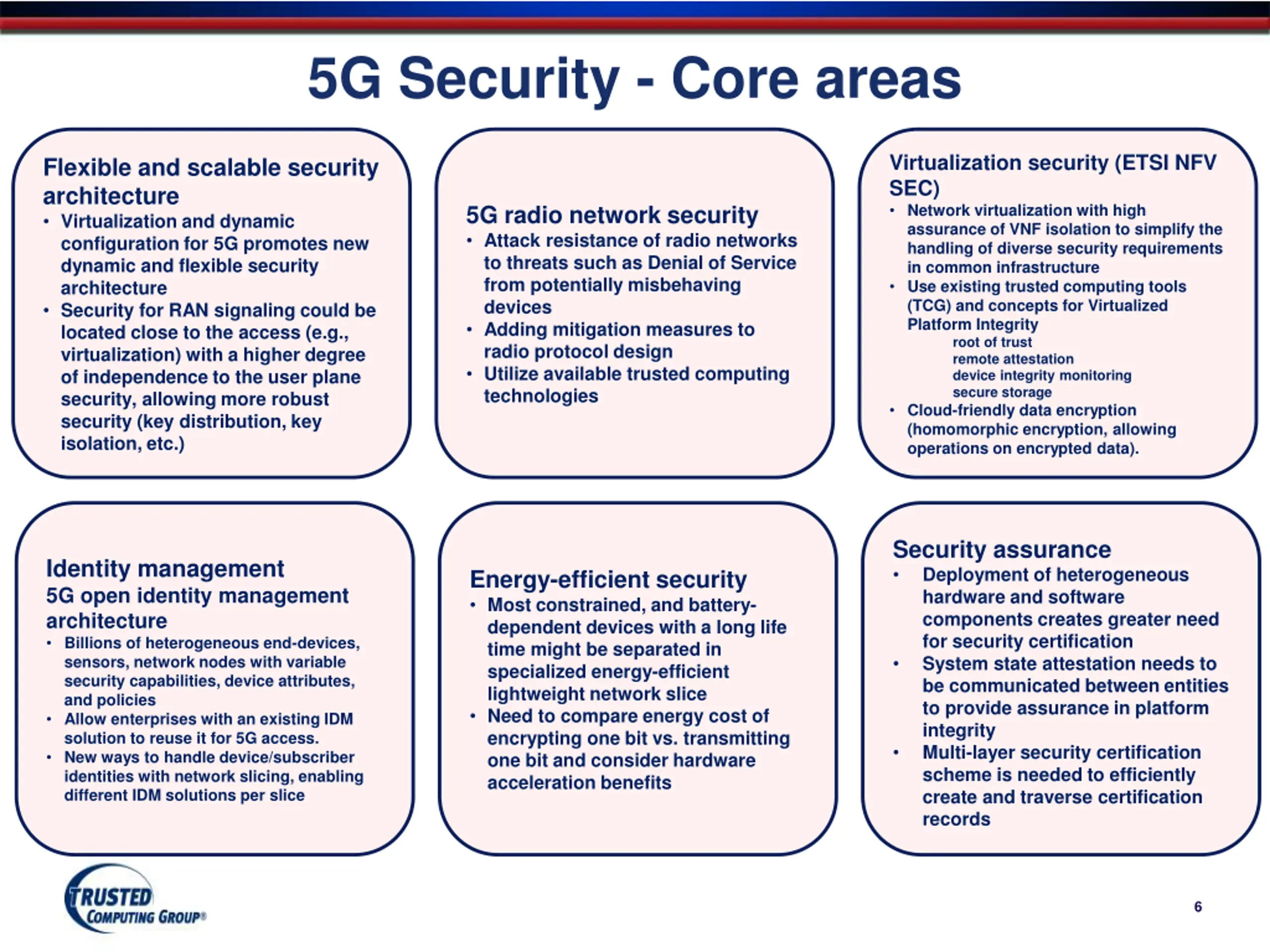 5G Security - Core areas Virtualization security (ETSI NFV SEC) Network virtualization with high assurance of VNF isolation to simplify the handling of diverse security requirements in common infrastructure Use existing trusted computing tools (TCG) and concepts for Virtualized Platform Integrity root of trust remote attestation device integrity monitoring secure storage Cloud-friendly data encryption (homomorphic encryption, allowing operations on encrypted data). Flexible and scalable security architecture Virtualization and dynamic configuration for 5G promotes new dynamic and flexible security architecture Security for RAN signaling could be located close to the access (e.g., virtualization) with a higher degree of independence to the user plane security, allowing more robust security (key distribution, key isolation, etc.) 5G radio network security Attack resistance of radio networks to threats such as Denial of Service from potentially misbehaving devices Adding mitigation measures to radio protocol design Utilize available trusted computing technologies Security assurance Deployment of heterogeneous hardware and software components creates greater need for security certification System state attestation needs to be communicated between entities to provide assurance in platform integrity Multi-layer security certification scheme is needed to efficiently create and traverse certification records Identity management 5G open identity management architecture Billions of heterogeneous end-devices, sensors, network nodes with variable security capabilities, device attributes, and policies Allow enterprises with an existing IDM solution to reuse it for 5G access. New ways to handle device/subscriber identities with network slicing, enabling different IDM solutions per slice Energy-efficient security Most constrained, and battery- dependent devices with a long life time might be separated in specialized energy-efficient lightweight network slice Need to compare energy cost of encrypting one bit vs. transmitting one bit and consider hardware acceleration benefits 6