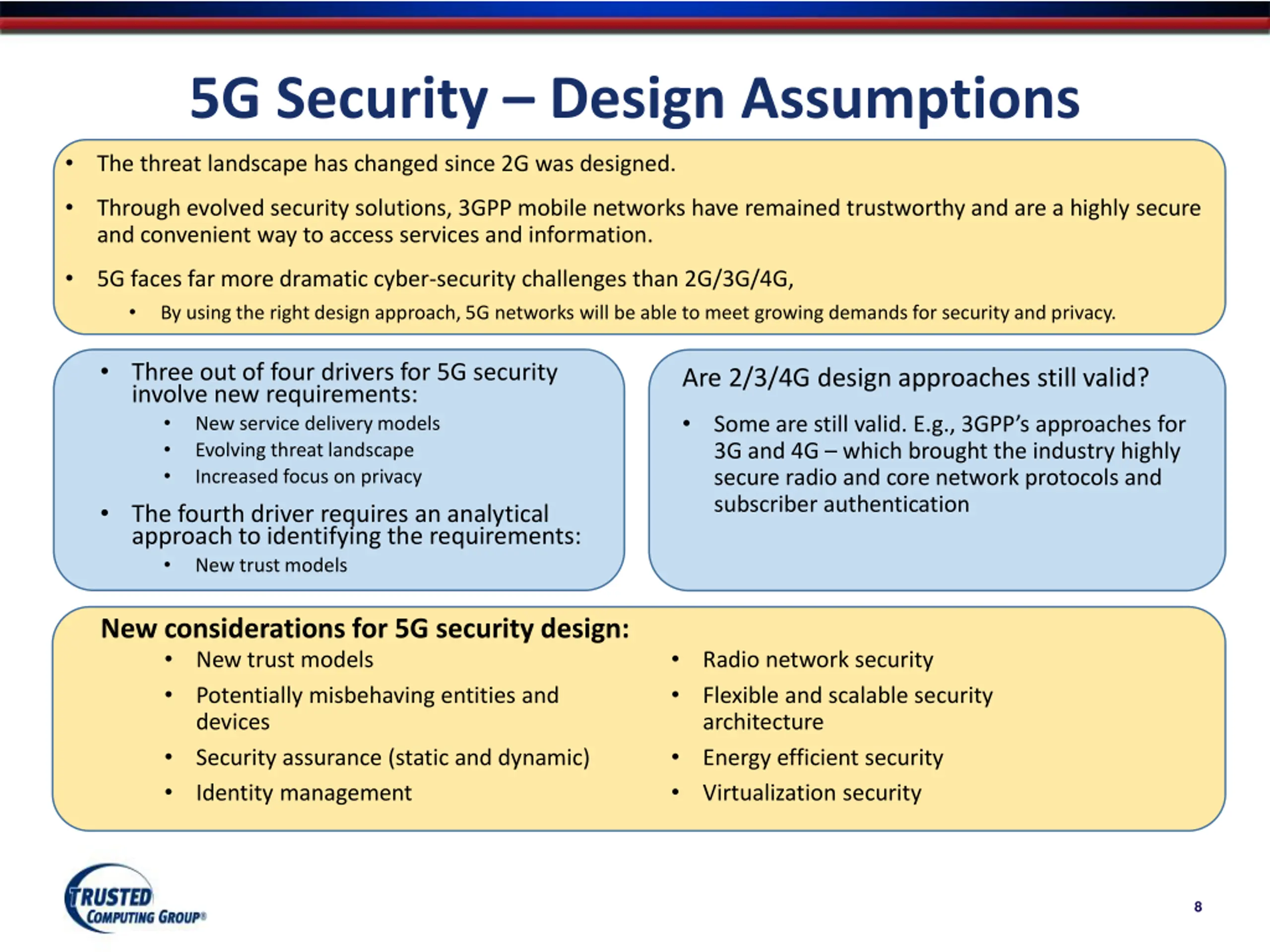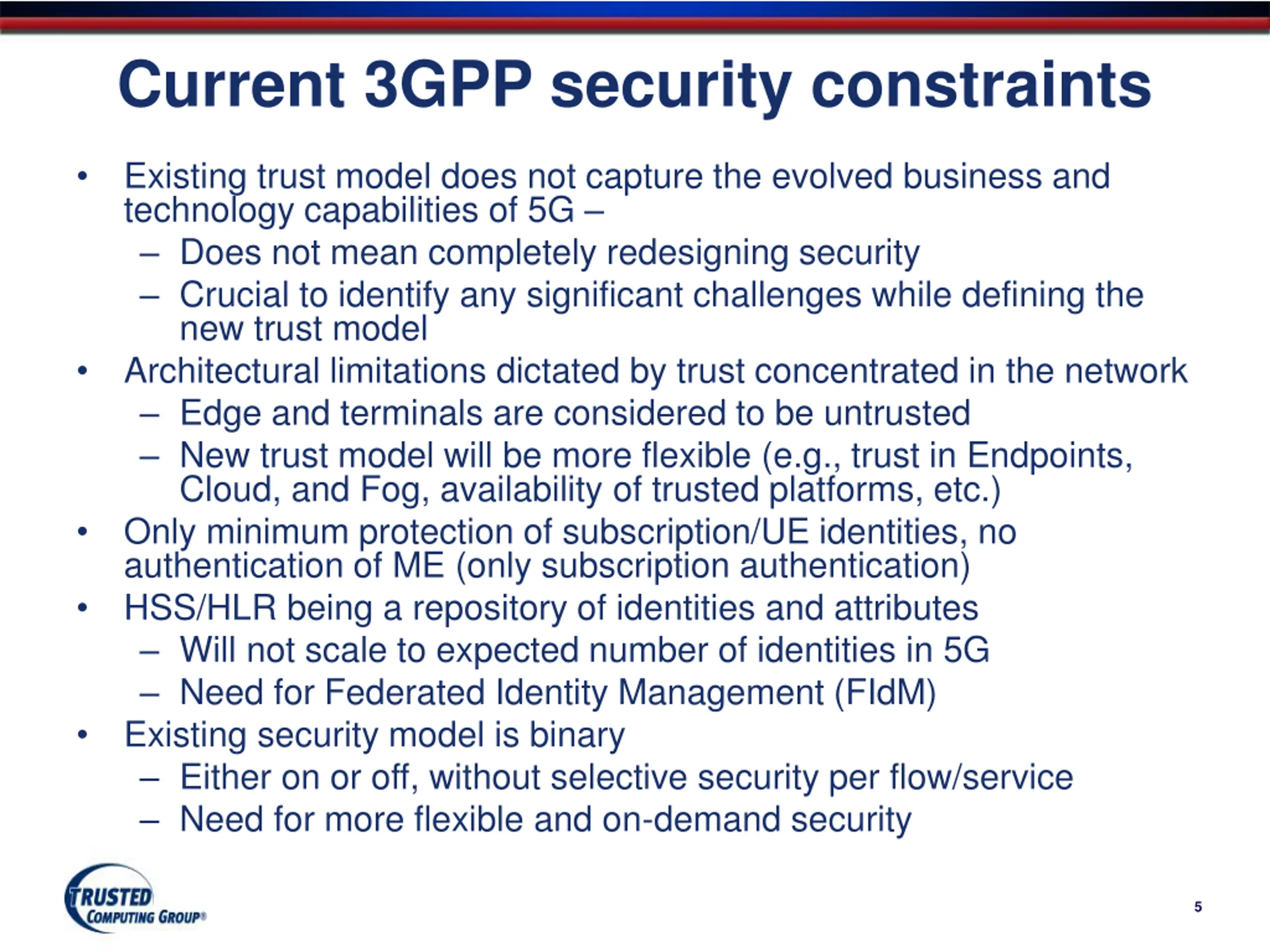 Current 3GPP security constraints Existing trust model does not capture the evolved business and technology capabilities of 5G Does not mean completely redesigning security Crucial to identify any significant challenges while defining the new trust model Architectural limitations dictated by trust concentrated in the network Edge and terminals are considered to be untrusted New trust model will be more flexible (e.g., trust in Endpoints, Cloud, and Fog, availability of trusted platforms, etc.) Only minimum protection of subscription/UE identities, no authentication of ME (only subscription authentication) HSS/HLR being a repository of identities and attributes Will not scale to expected number of identities in 5G Need for Federated Identity Management (FIdM) Existing security model is binary Either on or off, without selective security per flow/service Need for more flexible and on-demand security 5