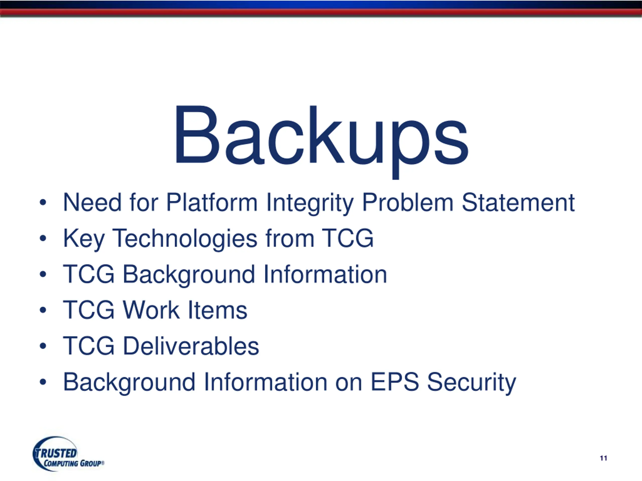 Backups Need for Platform Integrity Problem Statement Key Technologies from TCG TCG Background Information TCG Work Items TCG Deliverables Background Information on EPS Security 11