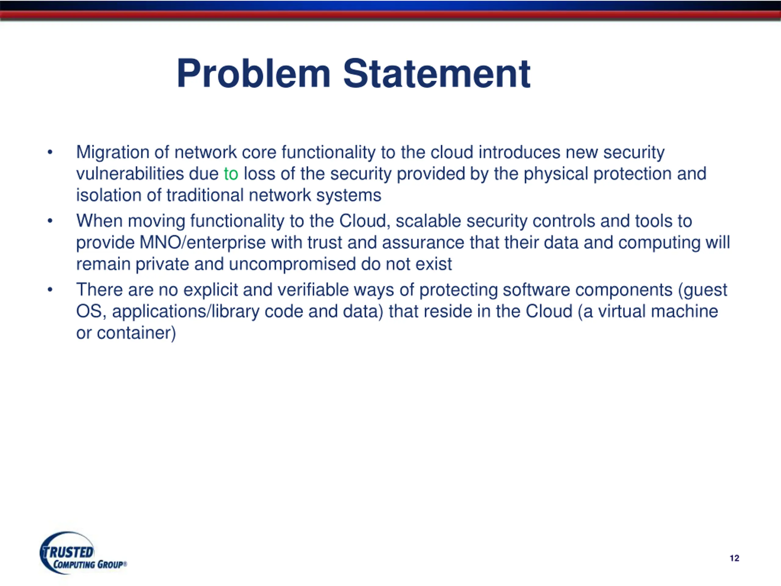 Problem Statement Migration of network core functionality to the cloud introduces new security vulnerabilities due to loss of the security provided by the physical protection and isolation of traditional network systems When moving functionality to the Cloud, scalable security controls and tools to provide MNO/enterprise with trust and assurance that their data and computing will remain private and uncompromised do not exist There are no explicit and verifiable ways of protecting software components (guest OS, applications/library code and data) that reside in the Cloud (a virtual machine or container) 12