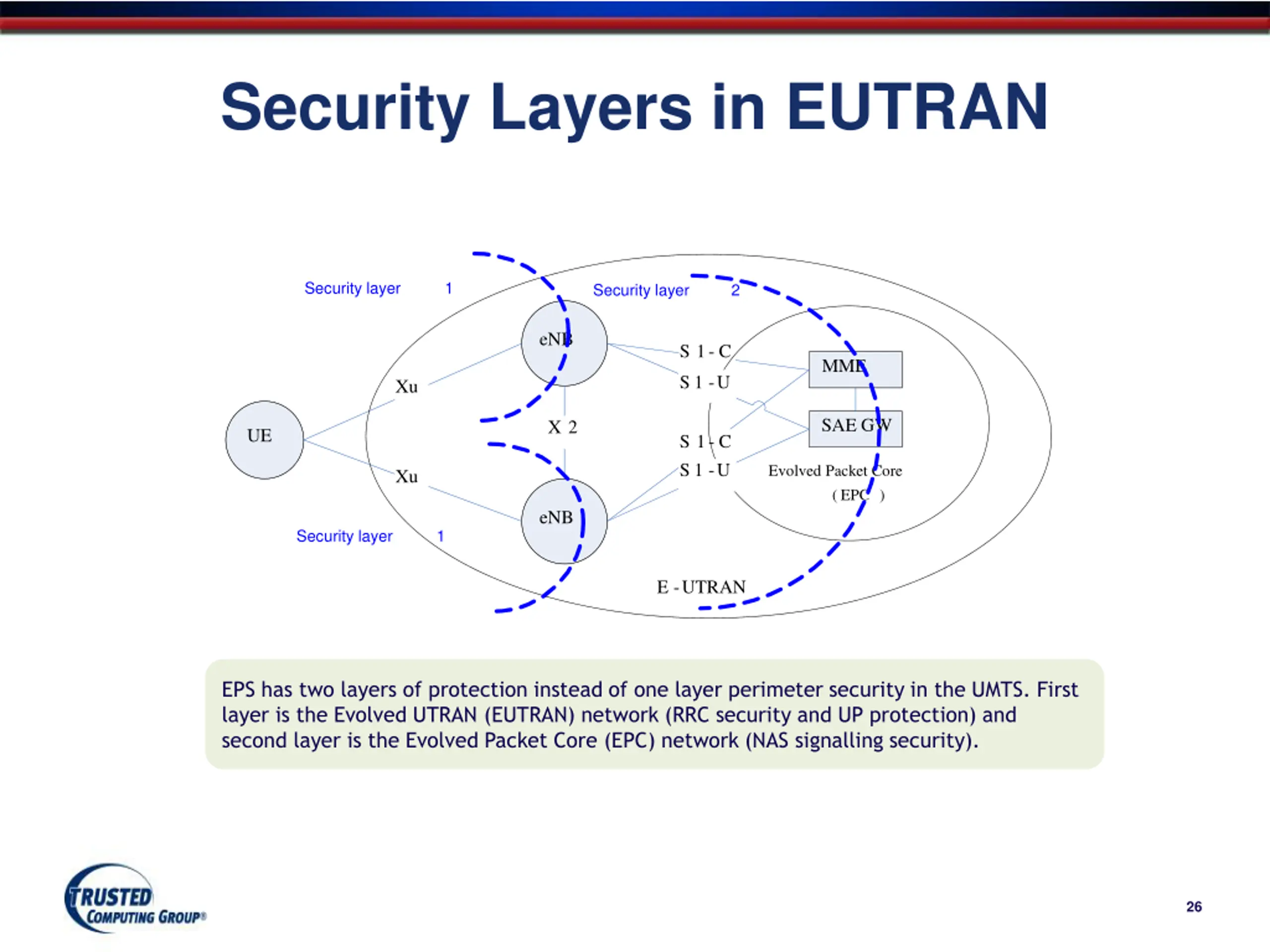 Security Layers in EUTRAN Security layer 1 Security layer 2 eNB S 1- C MME S 1 -U Xu SAE GW X 2 UE S 1- C S 1 -U Evolved Packet Core (EPC ) Xu eNB Security layer 1 E -UTRAN EPS has two layers of protection instead of one layer perimeter security in the UMTS. First layer is the Evolved UTRAN (EUTRAN) network (RRC security and UP protection) and second layer is the Evolved Packet Core (EPC) network (NAS signalling security). 26
