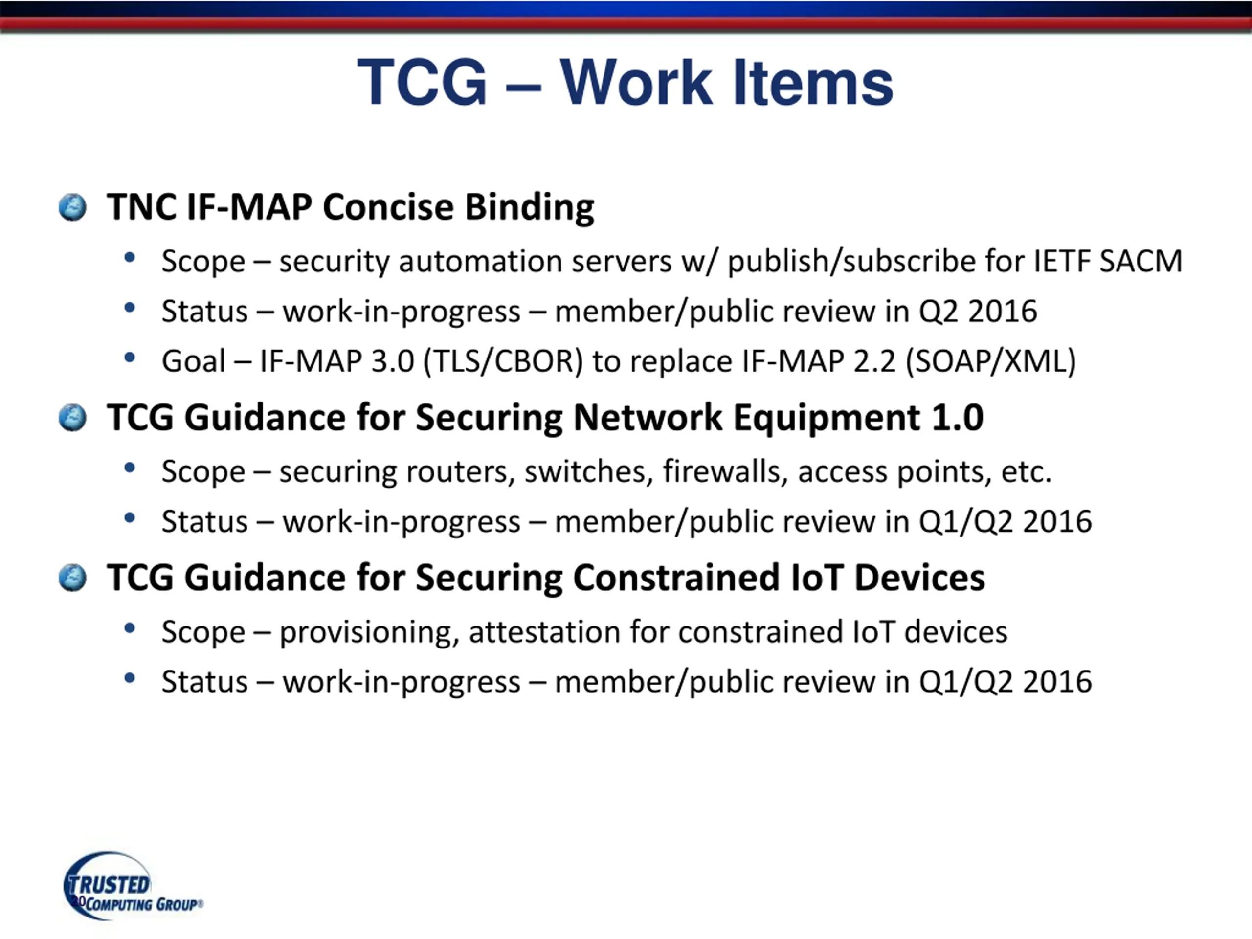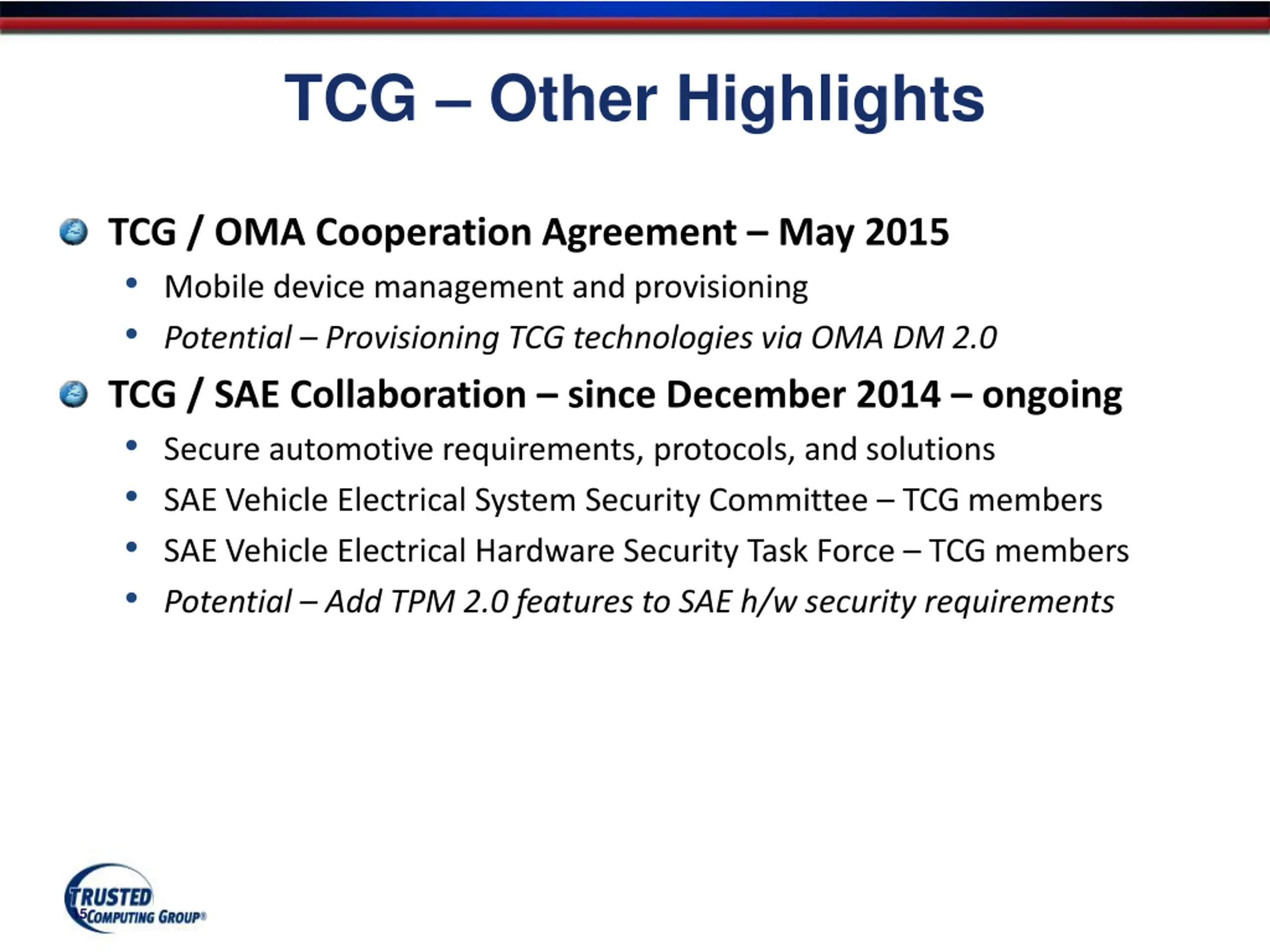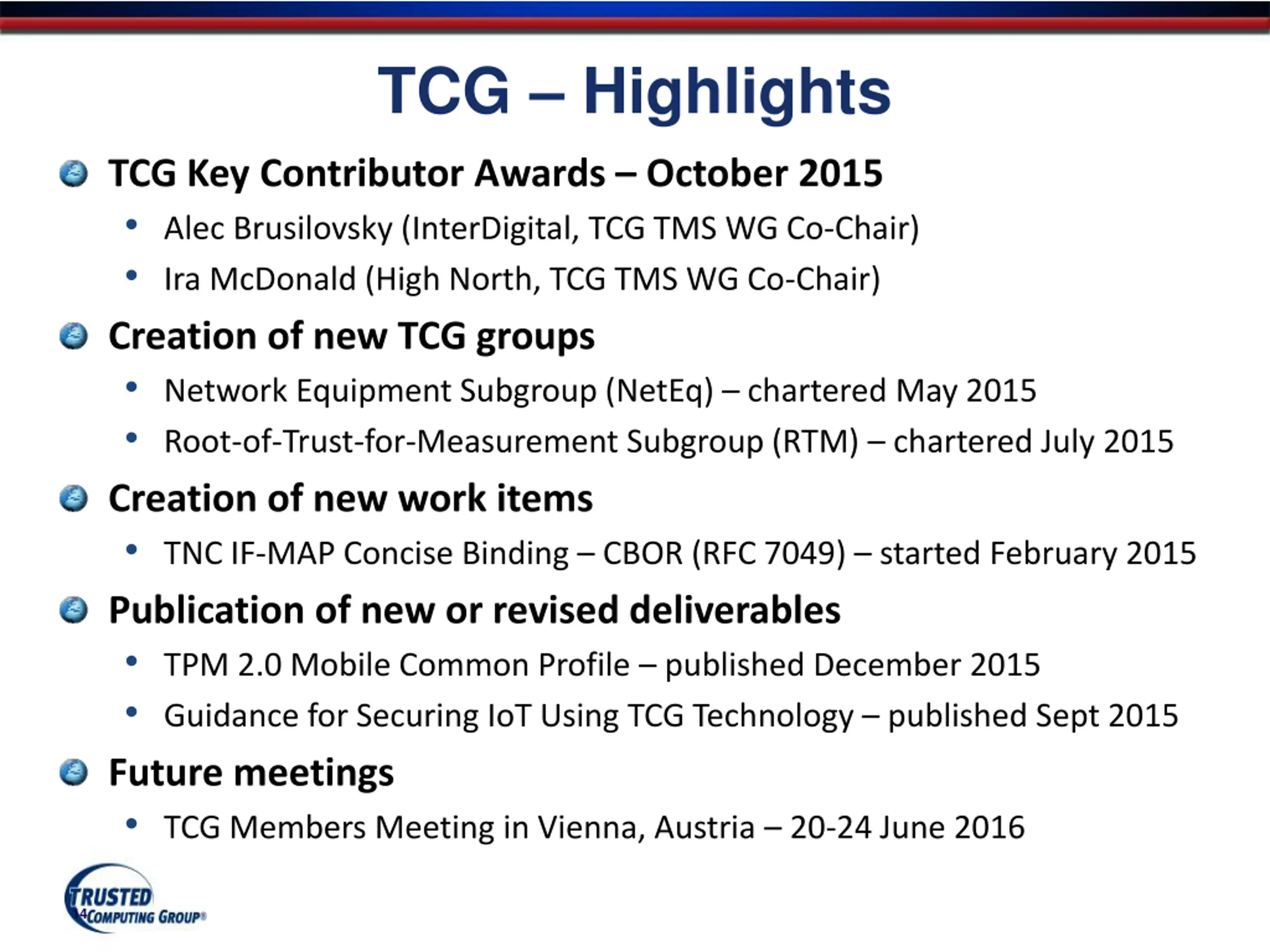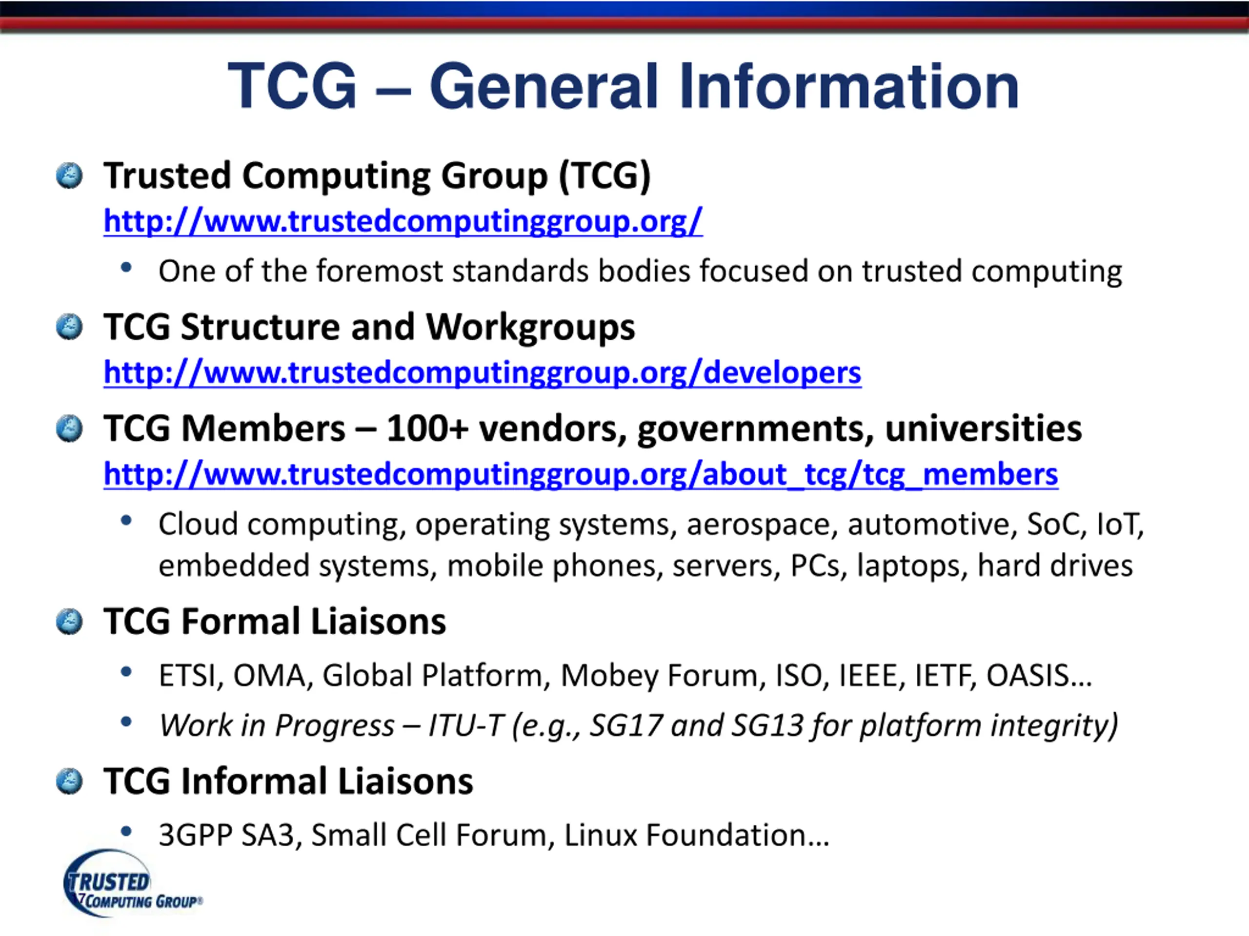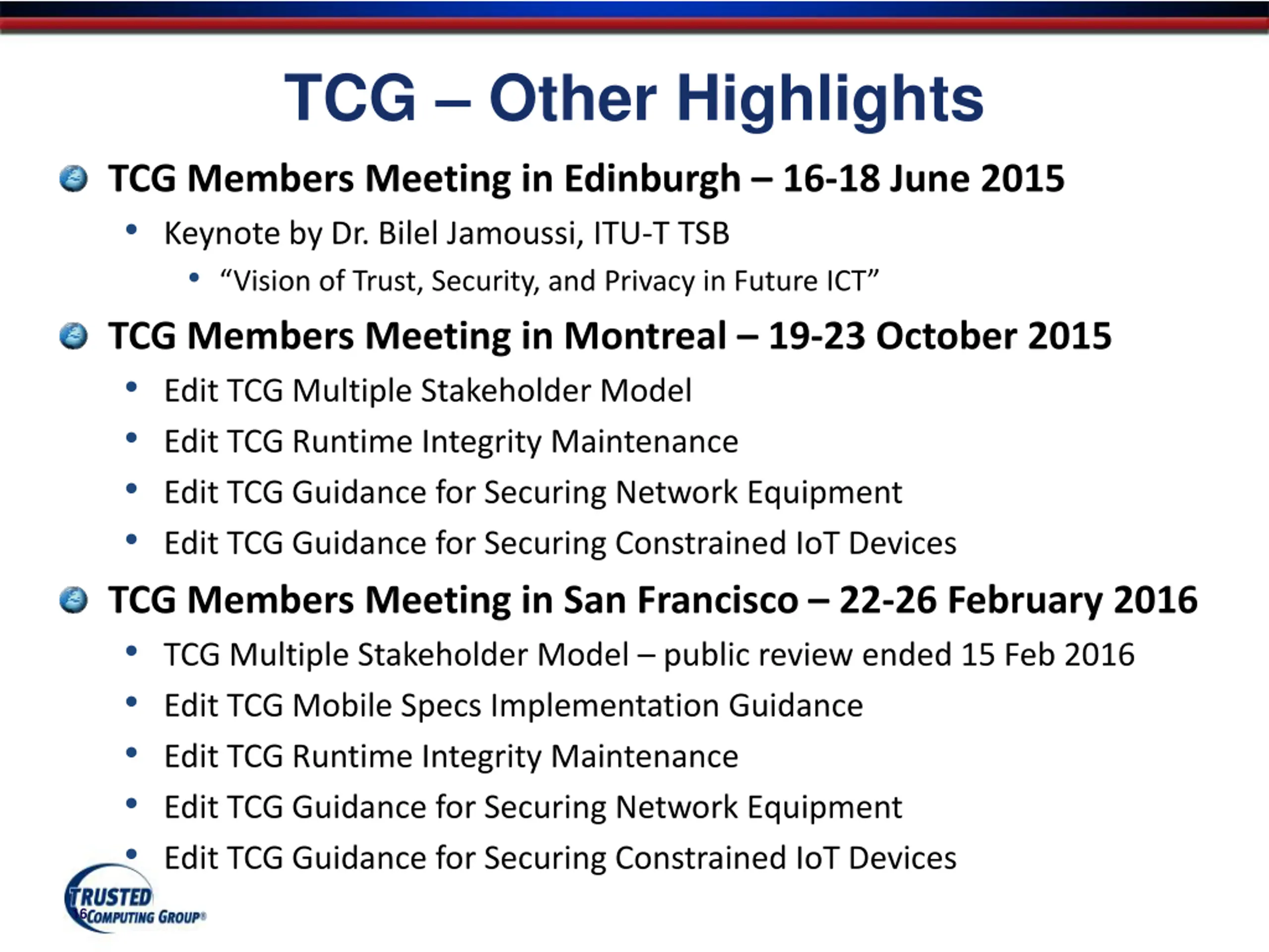 TCG Other Highlights TCG Members Meeting in Edinburgh 16-18 June 2015 Keynote by Dr. Bilel Jamoussi, ITU-T TSB Vision of Trust, Security, and Privacy in Future ICT TCG Members Meeting in Montreal 19-23 October 2015 Edit TCG Multiple Stakeholder Model Edit TCG Runtime Integrity Maintenance Edit TCG Guidance for Securing Network Equipment Edit TCG Guidance for Securing Constrained IoT Devices TCG Members Meeting in San Francisco 22-26 February 2016 TCG Multiple Stakeholder Model public review ended 15 Feb 2016 Edit TCG Mobile Specs Implementation Guidance Edit TCG Runtime Integrity Maintenance Edit TCG Guidance for Securing Network Equipment Edit TCG Guidance for Securing Constrained IoT Devices 16
