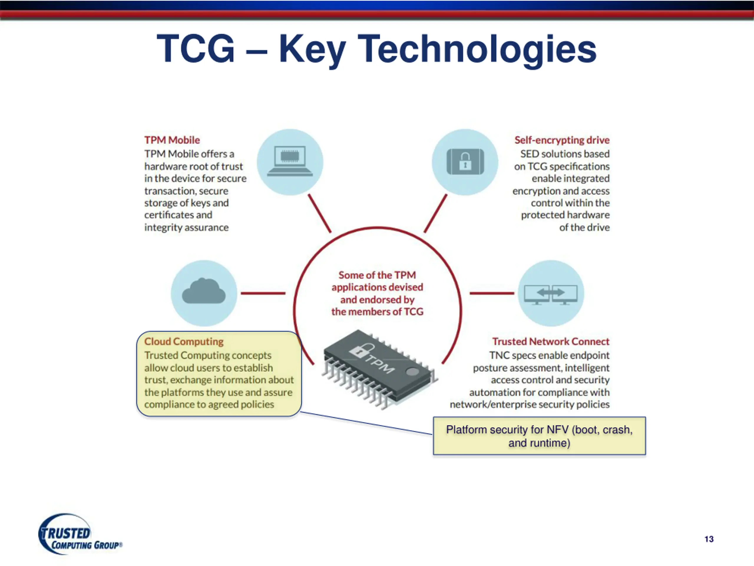 TCG Key Technologies Platform security for NFV (boot, crash, and runtime) 13