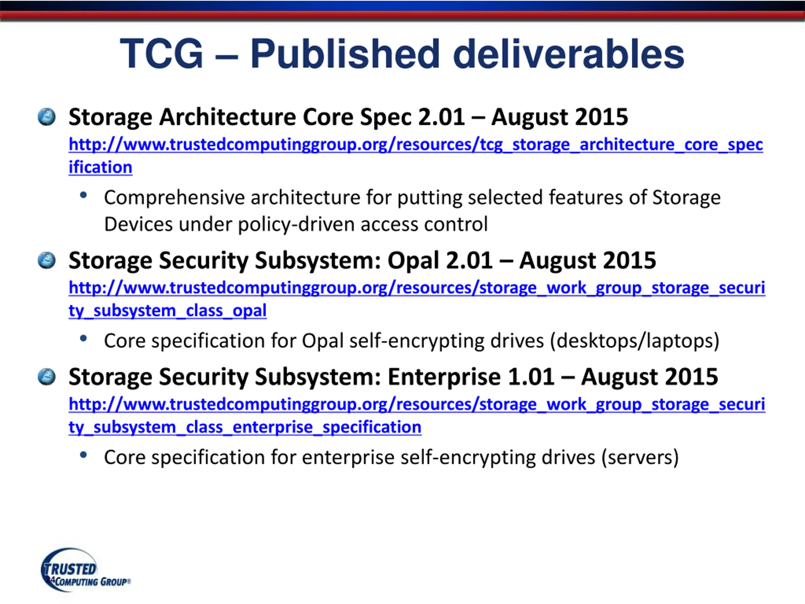 TCG Published deliverables Storage Architecture Core Spec 2.01 August 2015 http://www.trustedcomputinggroup.org/resources/tcg_storage_architecture_core_spec ification Comprehensive architecture for putting selected features of Storage Devices under policy-driven access control Storage Security Subsystem: Opal 2.01 August 2015 http://www.trustedcomputinggroup.org/resources/storage_work_group_storage_securi ty_subsystem_class_opal Core specification for Opal self-encrypting drives (desktops/laptops) Storage Security Subsystem: Enterprise 1.01 August 2015 http://www.trustedcomputinggroup.org/resources/storage_work_group_storage_securi ty_subsystem_class_enterprise_specification Core specification for enterprise self-encrypting drives (servers) 24