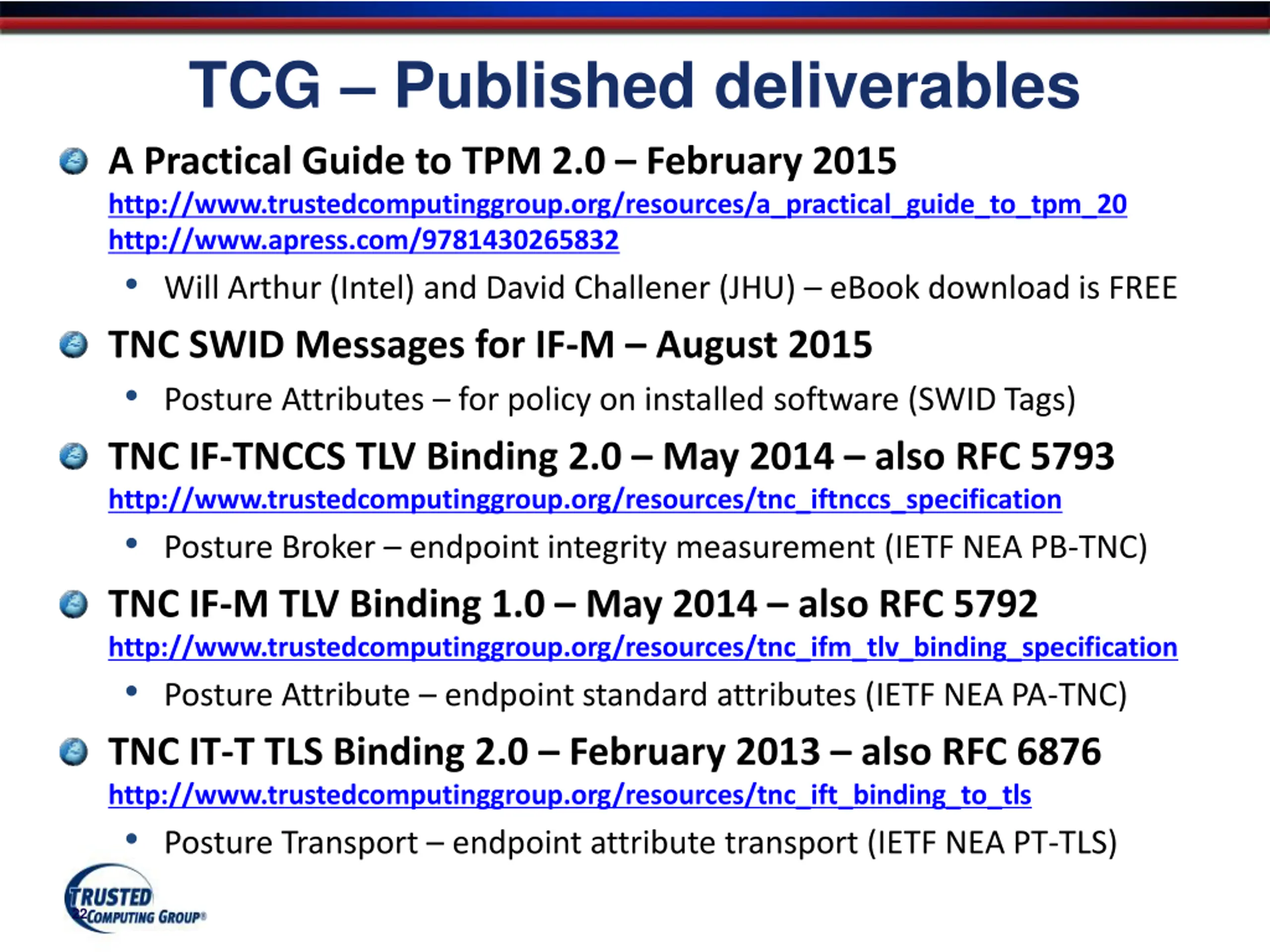 TCG Published deliverables A Practical Guide to TPM 2.0 February 2015 http://www.trustedcomputinggroup.org/resources/a_practical_guide_to_tpm_20 http://www.apress.com/9781430265832 Will Arthur (Intel) and David Challener (JHU) eBook download is FREE TNC SWID Messages for IF-M August 2015 Posture Attributes for policy on installed software (SWID Tags) TNC IF-TNCCS TLV Binding 2.0 May 2014 also RFC 5793 http://www.trustedcomputinggroup.org/resources/tnc_iftnccs_specification Posture Broker endpoint integrity measurement (IETF NEA PB-TNC) TNC IF-M TLV Binding 1.0 May 2014 also RFC 5792 http://www.trustedcomputinggroup.org/resources/tnc_ifm_tlv_binding_specification Posture Attribute endpoint standard attributes (IETF NEA PA-TNC) TNC IT-T TLS Binding 2.0 February 2013 also RFC 6876 http://www.trustedcomputinggroup.org/resources/tnc_ift_binding_to_tls Posture Transport endpoint attribute transport (IETF NEA PT-TLS) 22